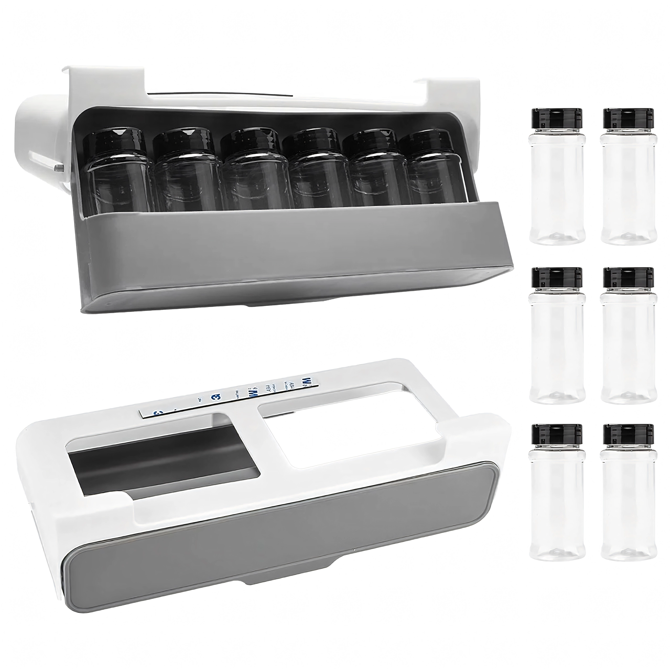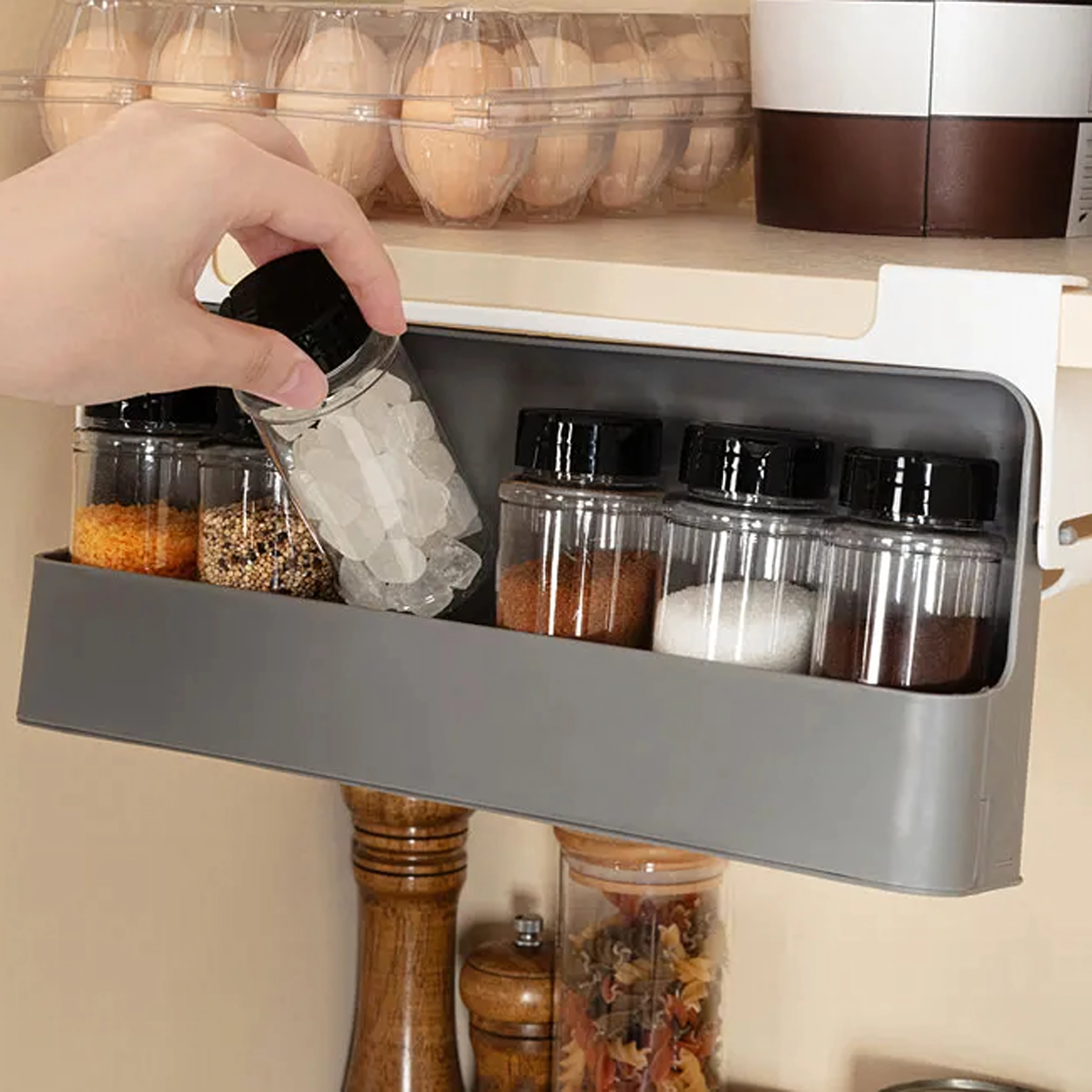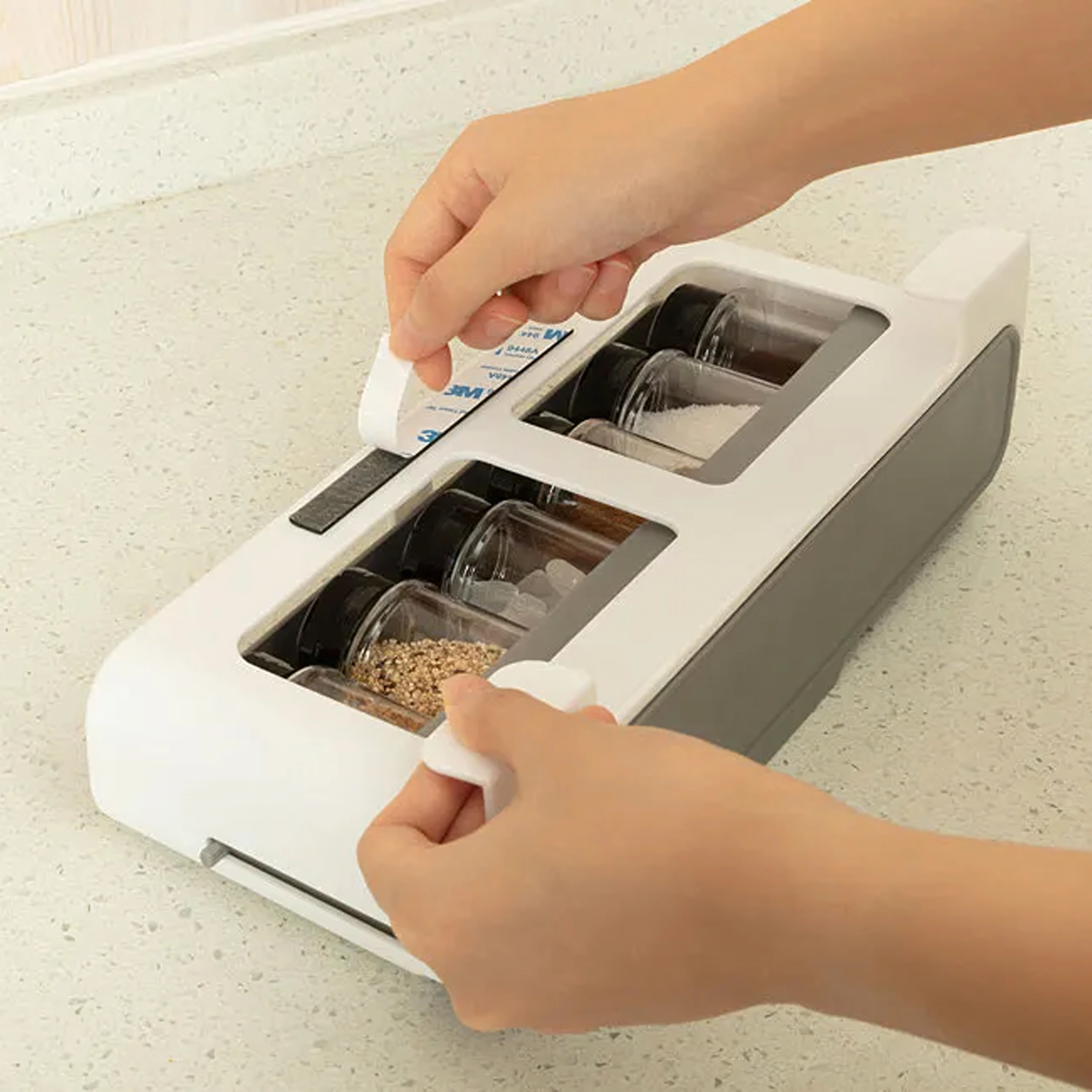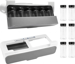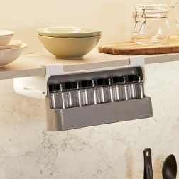 Gardez votre cuisine ordonnée et gagnez de la place avec un organisateur coulissant pour épices comprenant 6 bocaux transparents, à fixer sans perçage grâce à la bande adhésive 3M. Accès rapide, design compact et compatibilité avec la plupart des étagères et placards en font un choix idéal pour toute cuisine.