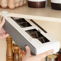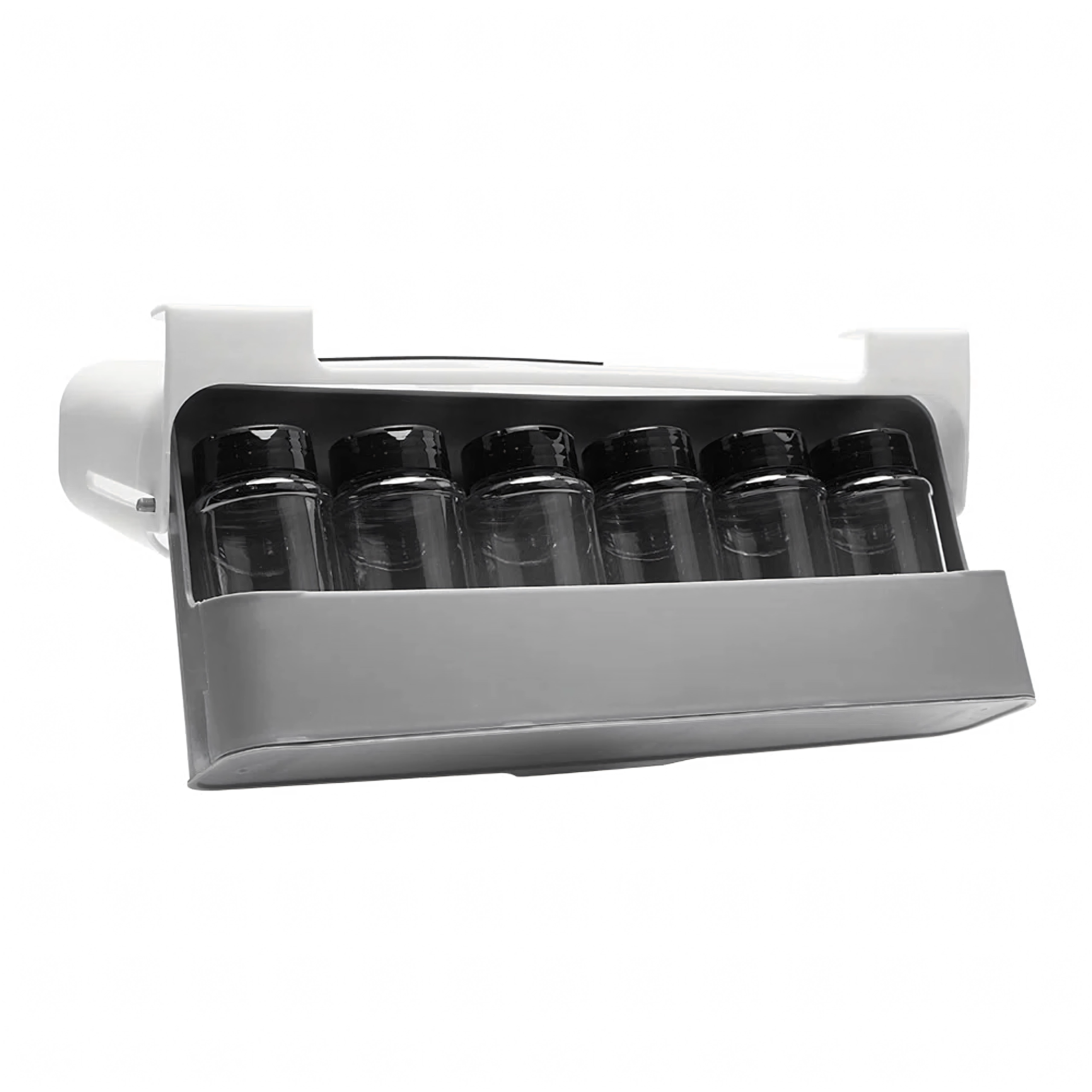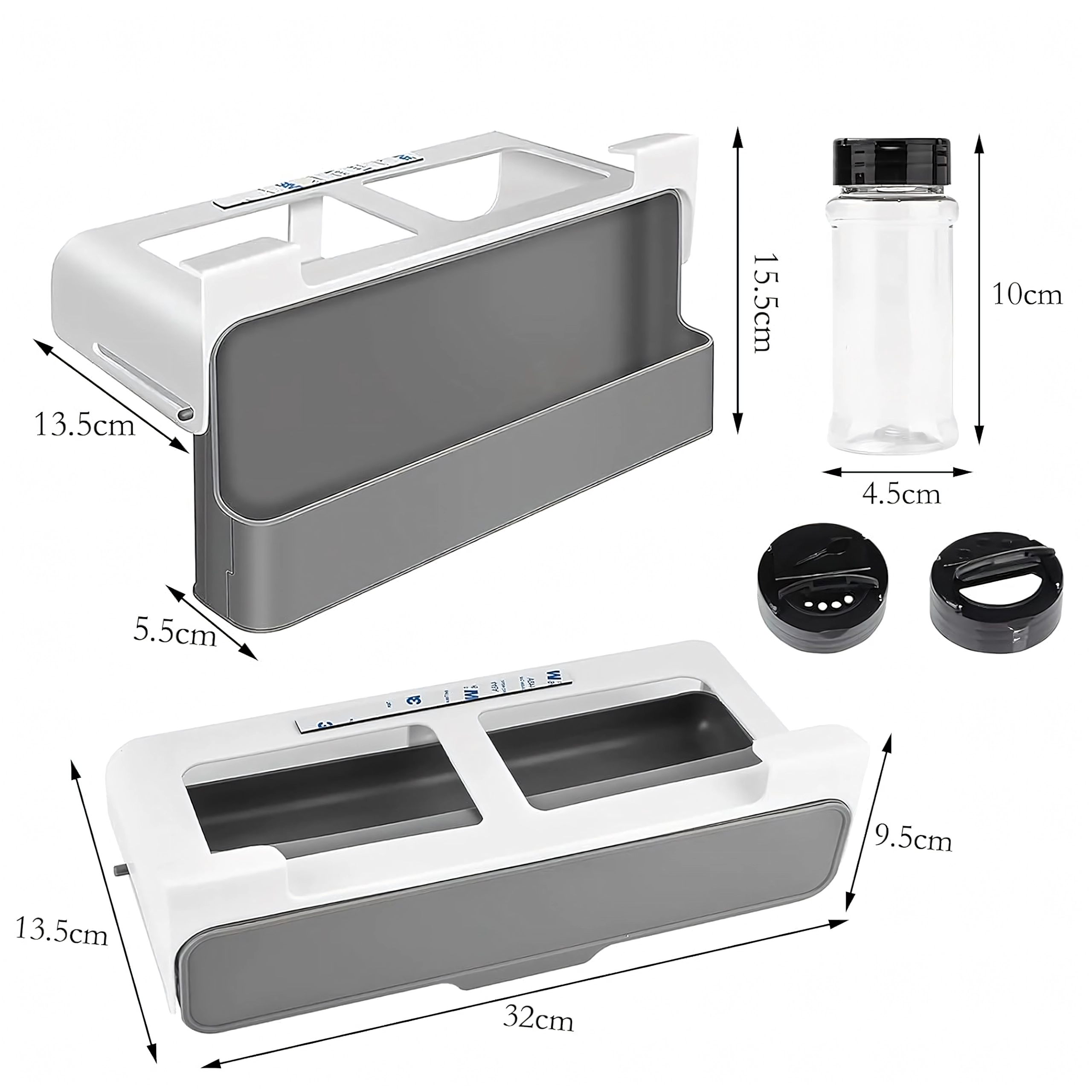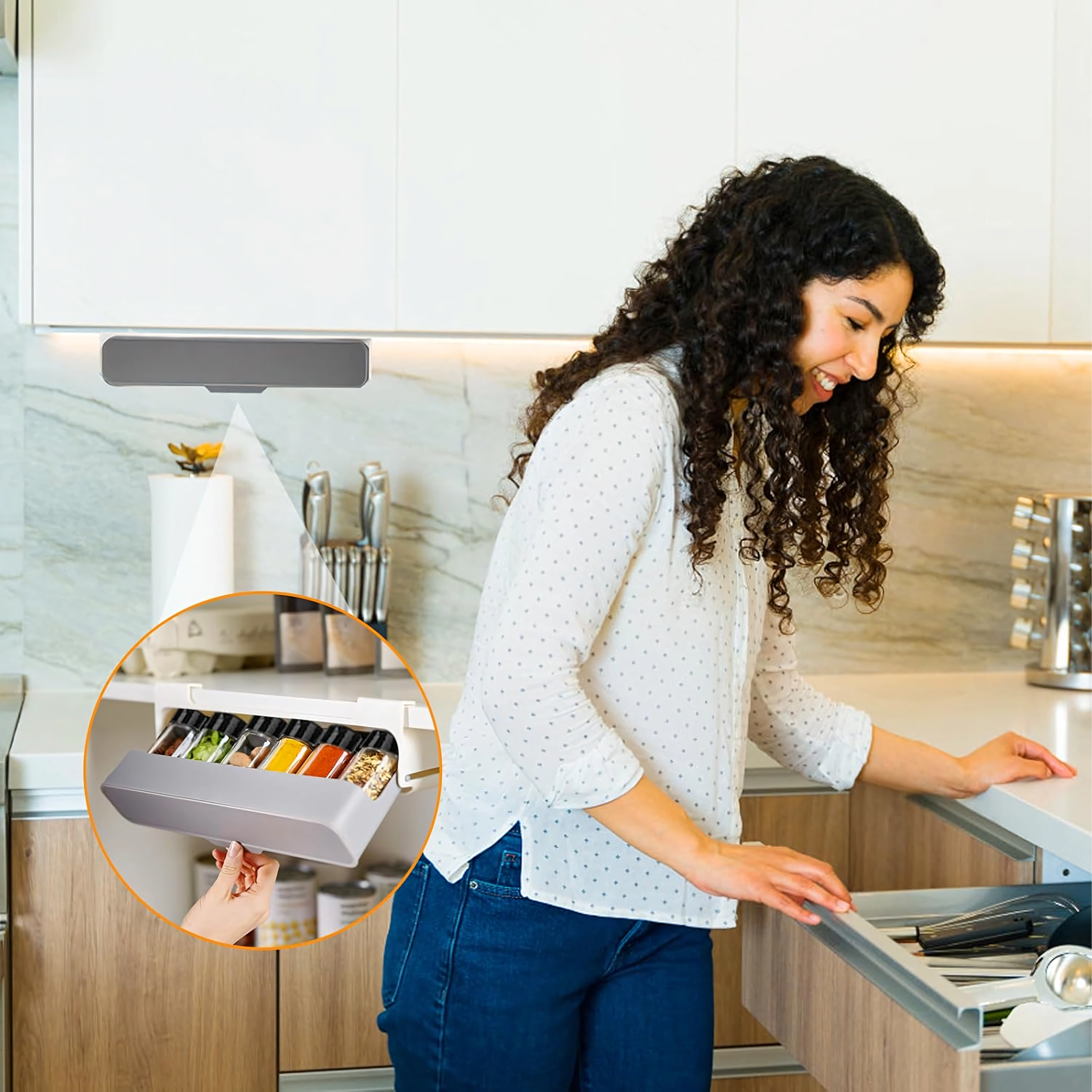 Gardez votre cuisine ordonnée et gagnez de la place avec un organisateur coulissant pour épices comprenant 6 bocaux transparents, à fixer sans perçage grâce à la bande adhésive 3M. Accès rapide, design compact et compatibilité avec la plupart des étagères et placards en font un choix idéal pour toute cuisine.
