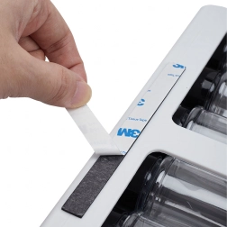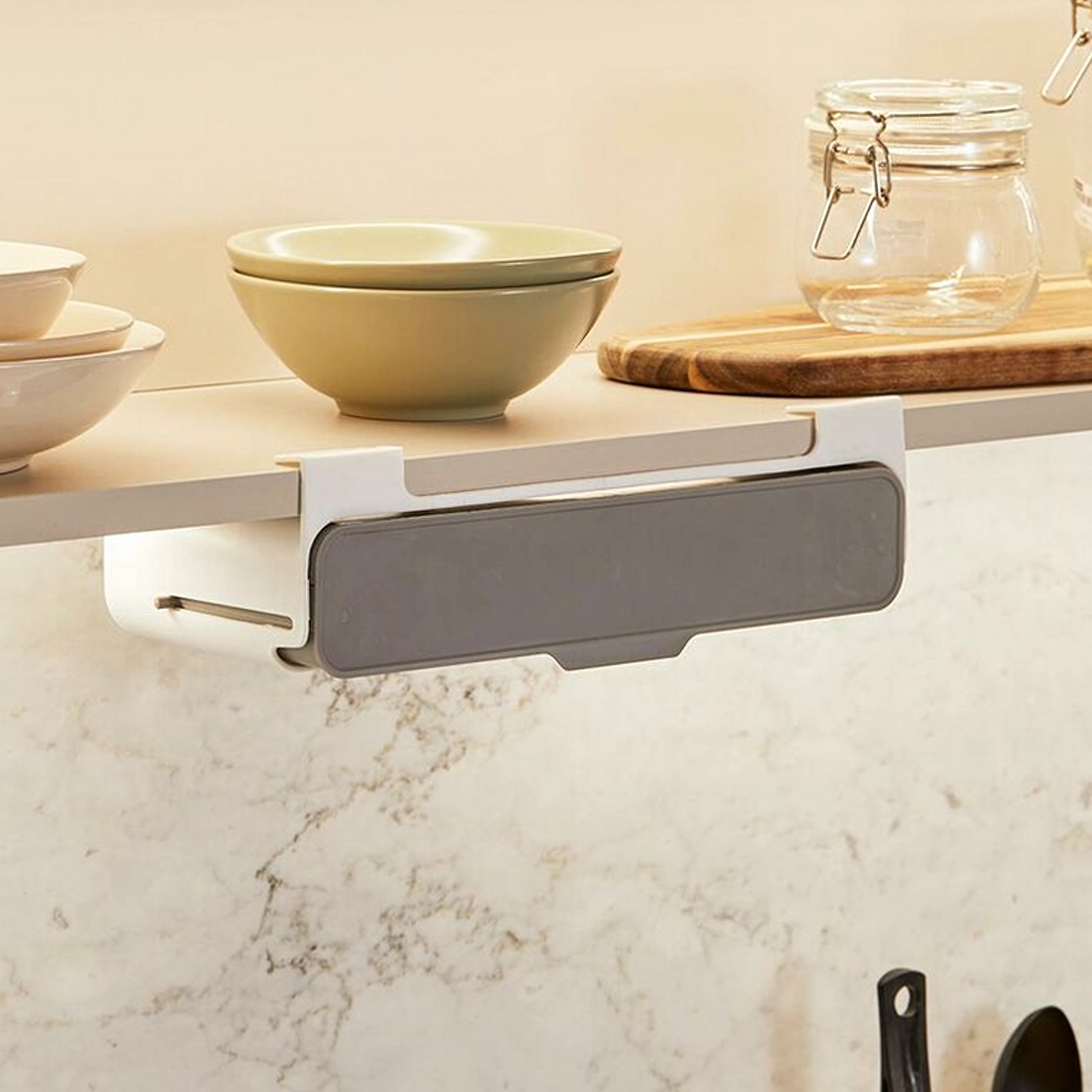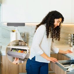 La puissante bande adhésive 3M maintient fermement l’organisateur sous une étagère ou dans un placard. L’installation prend quelques minutes et ne nécessite ni outils ni perçage.