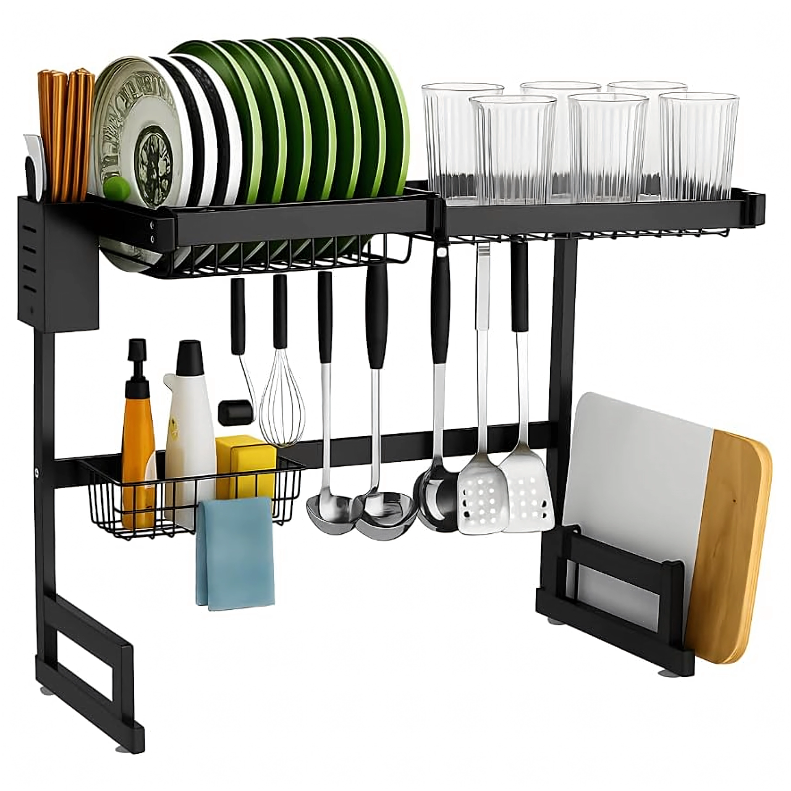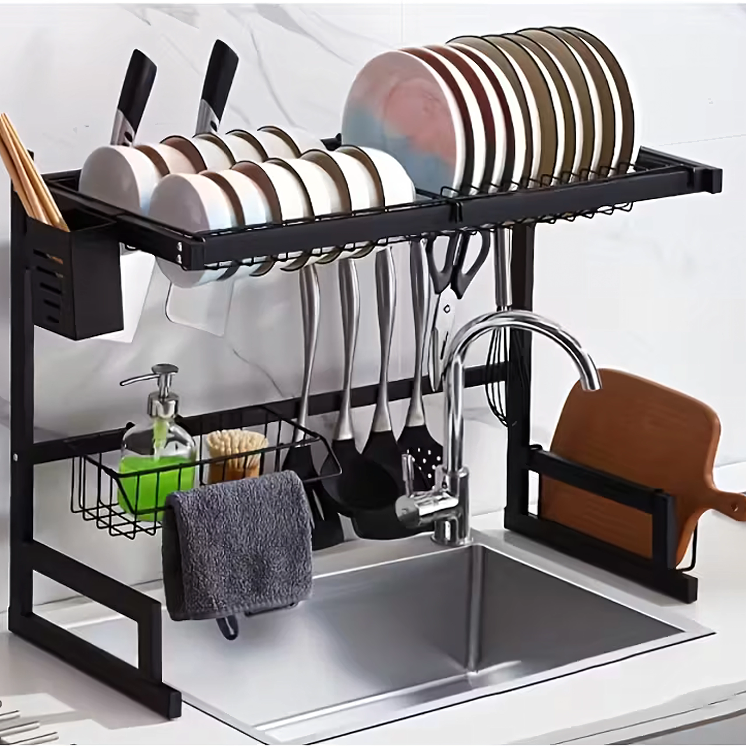 Égouttoir à vaisselle à deux niveaux avec porte-planche à découper et accessoires