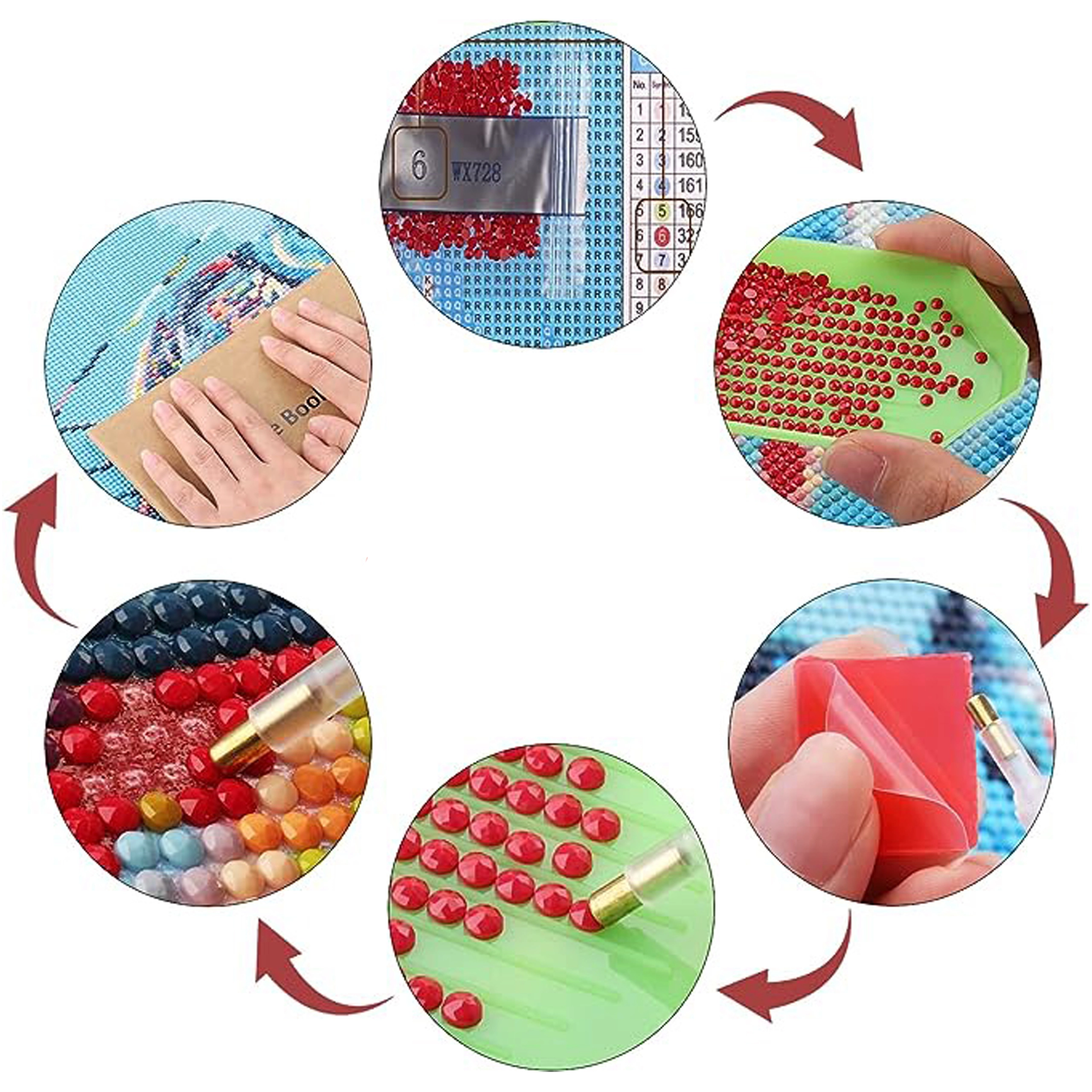 Ce kit complet comprend une toile imprimée autocollante, des strass colorés, un applicateur avec cire et un plateau de tri. Il suffit de découvrir le film protecteur par sections, de prendre les strass avec la pointe cirée et de les poser précisément selon la légende. Cette activité développe patience, précision et motricité fine et convient aux adultes et aux enfants sous surveillance.