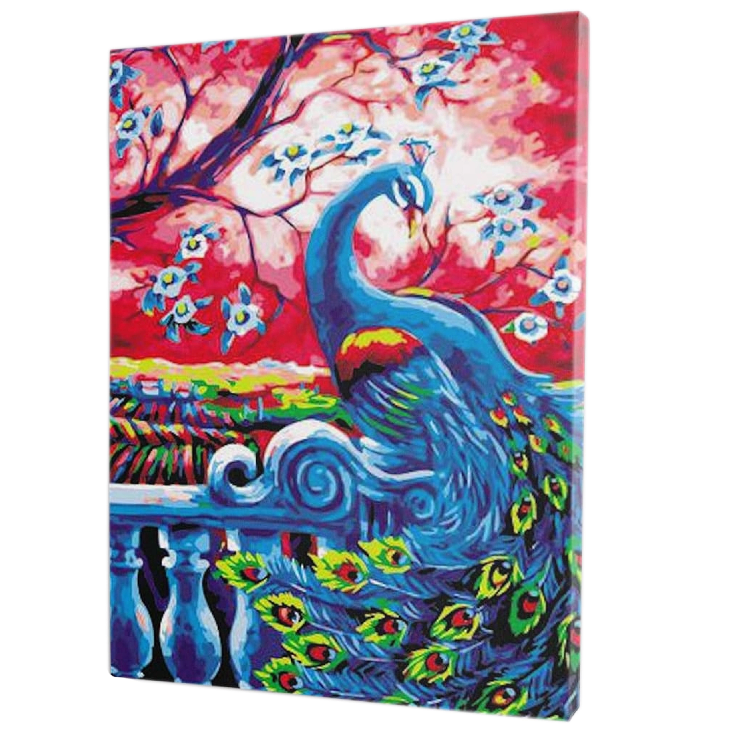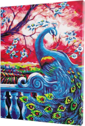 Set complet avec toile sur châssis, peintures et pinceaux. Une fois terminé, vous pouvez accrocher directement le tableau au motif de paon.