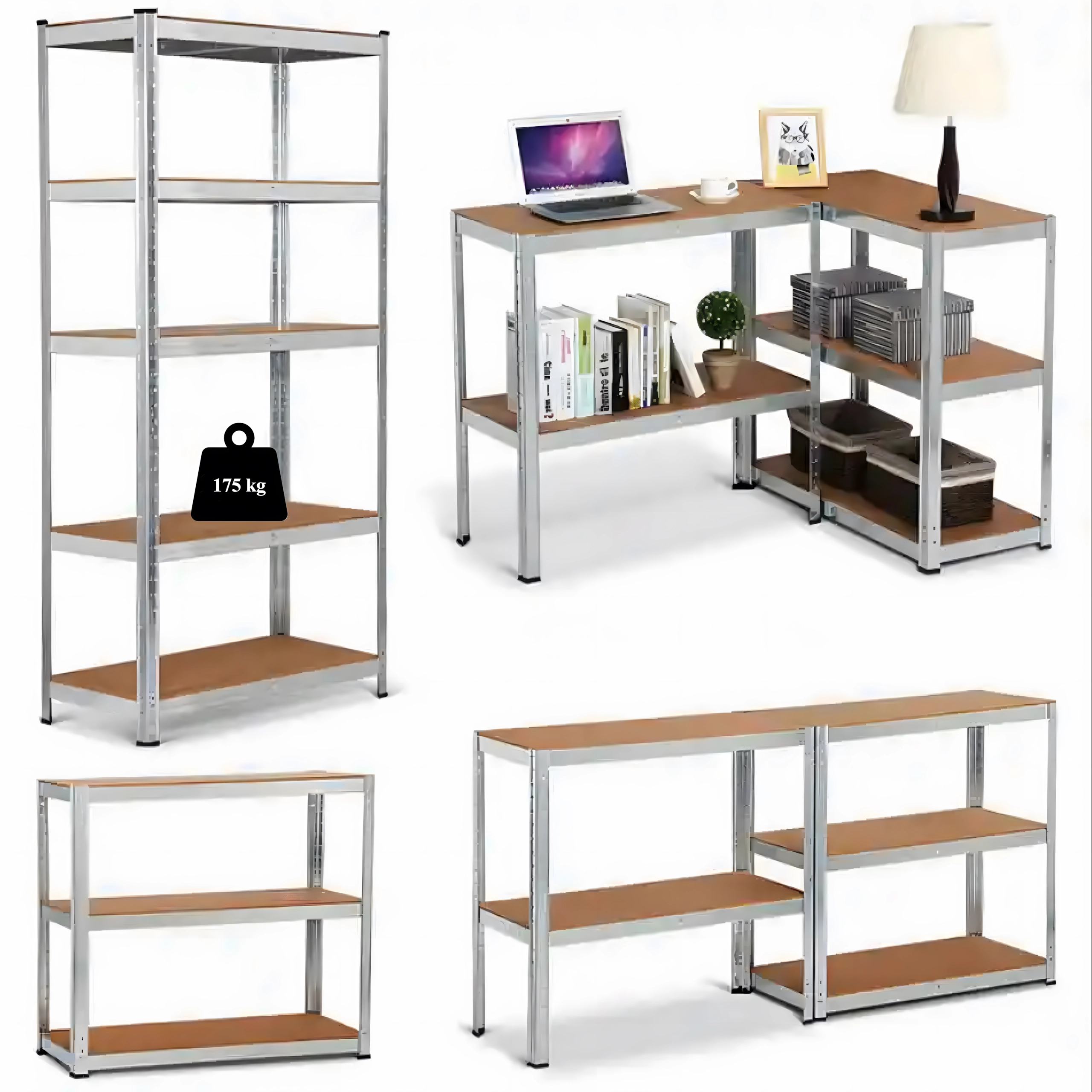Le système sans vis permet un montage rapide et une grande stabilité. Chaque tablette supporte 175 kg (soit jusqu’à 875 kg au total), convenant aussi aux objets plus lourds. L’étagère peut être séparée en deux supports autonomes plus bas – flexibilité idéale pour atelier, archives ou entrepôt.