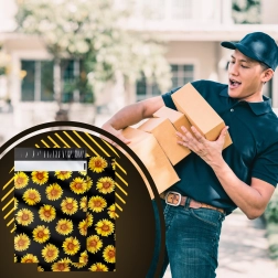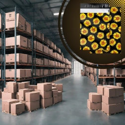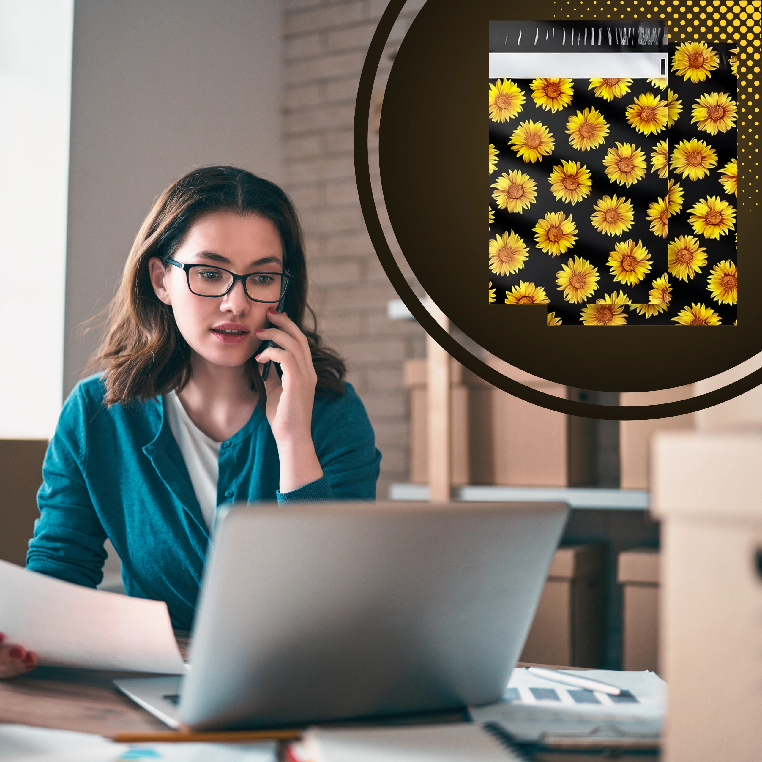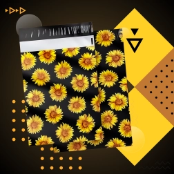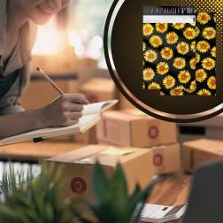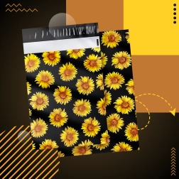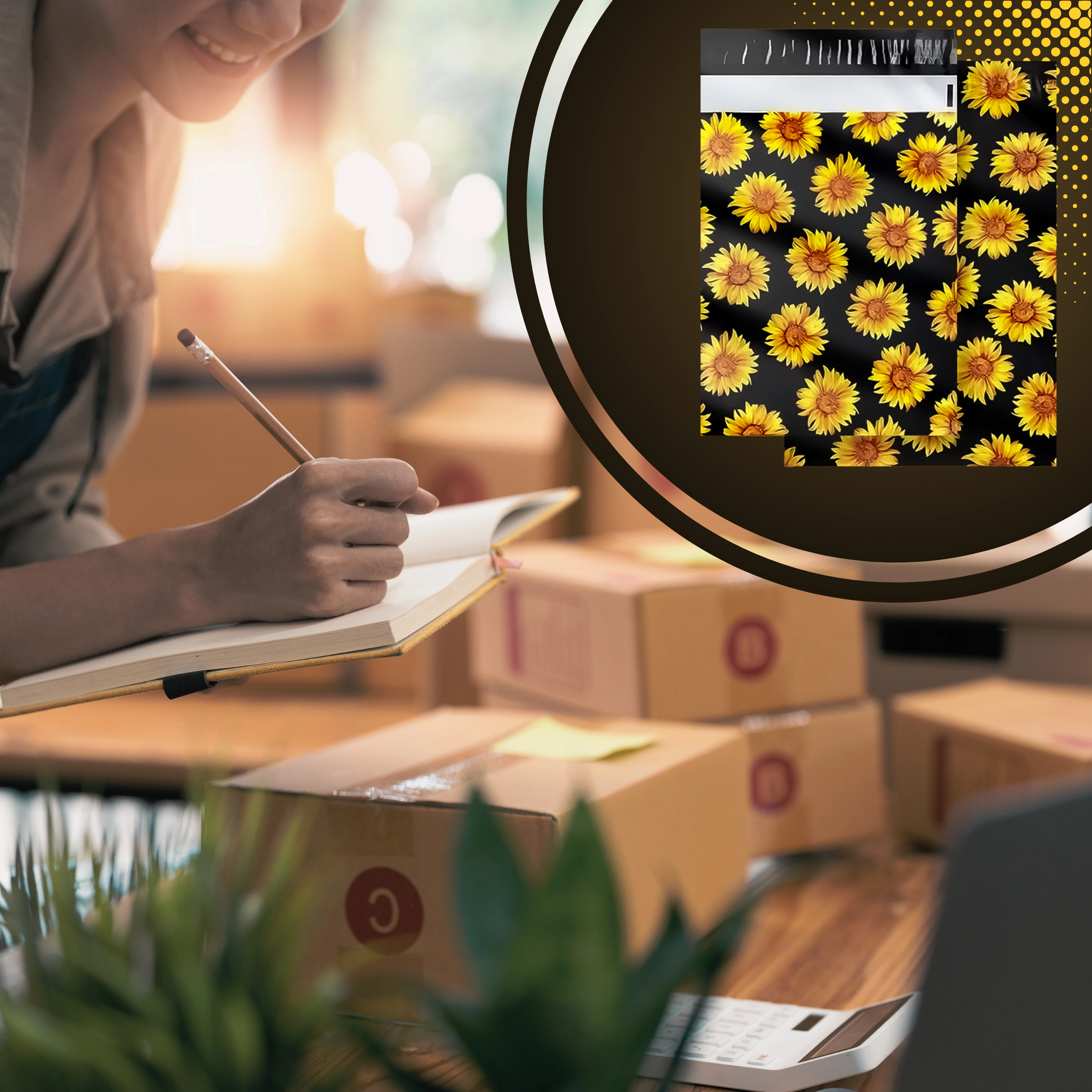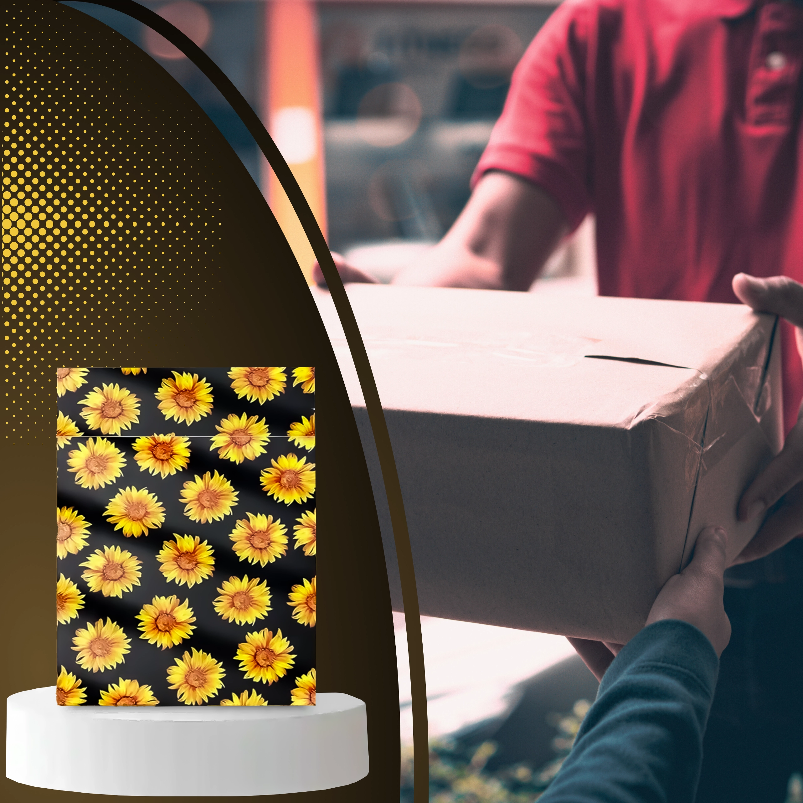 L’imprimé stylé de tournesols sur fond noir améliore l’expérience client et transforme chaque envoi en petit cadeau.