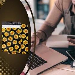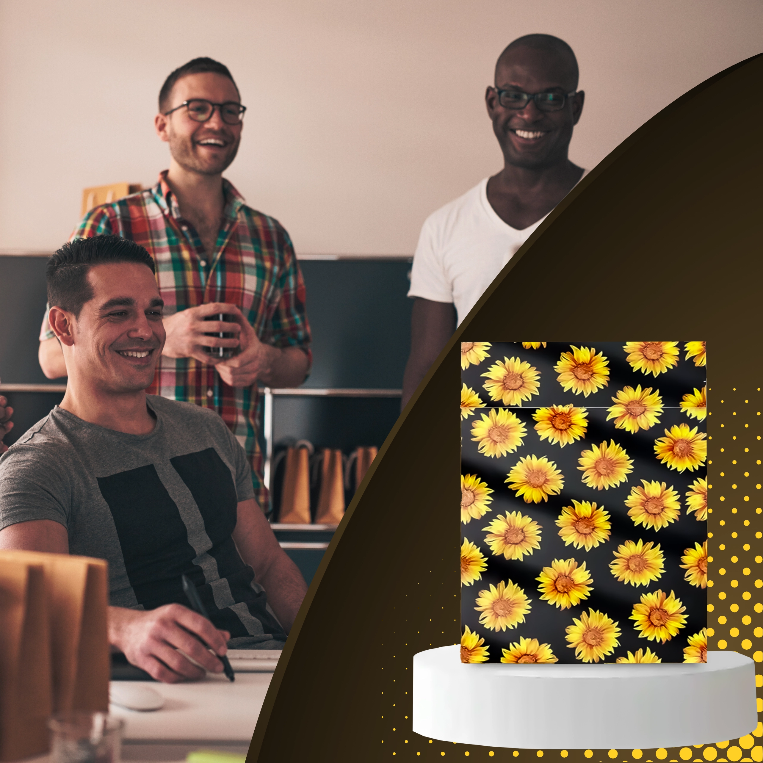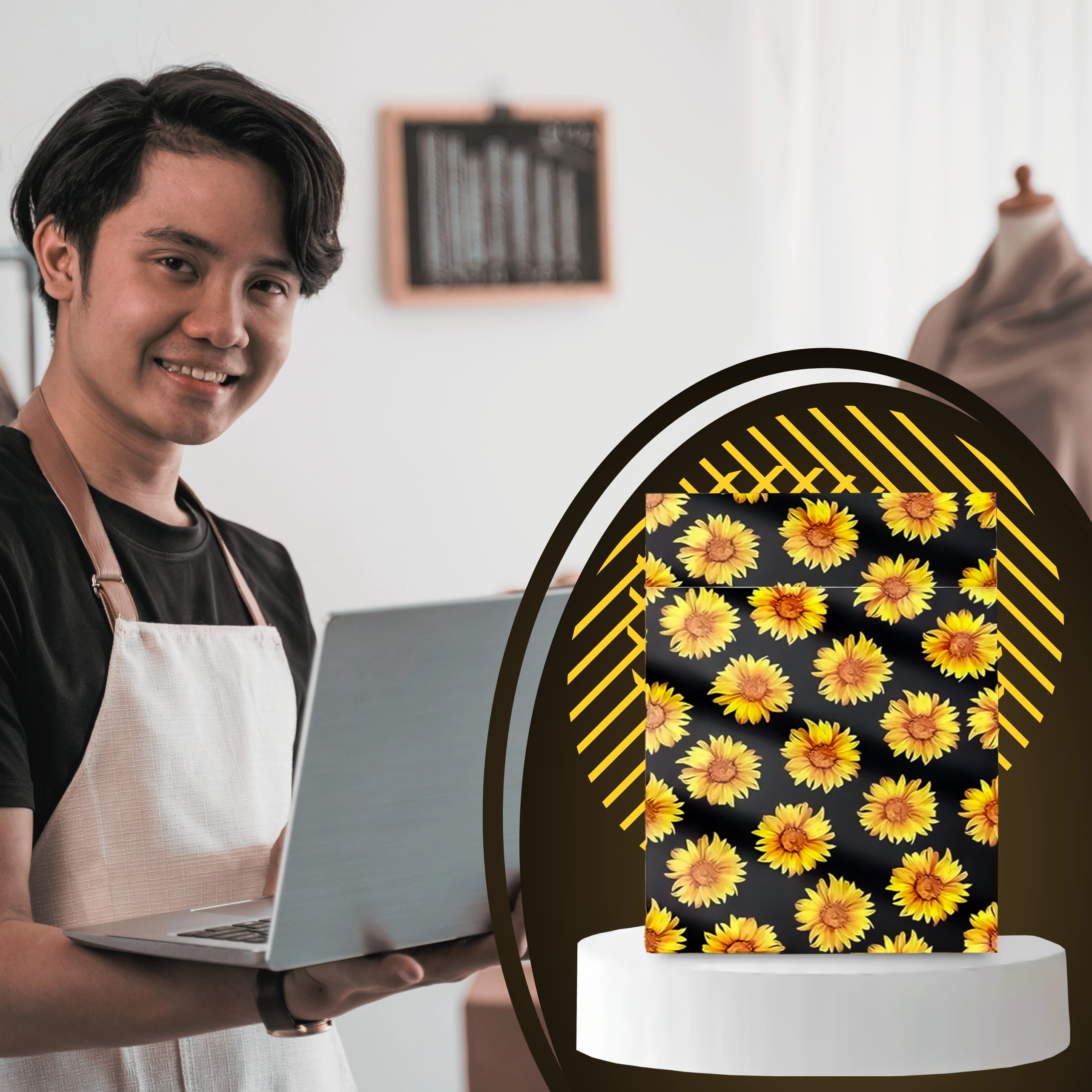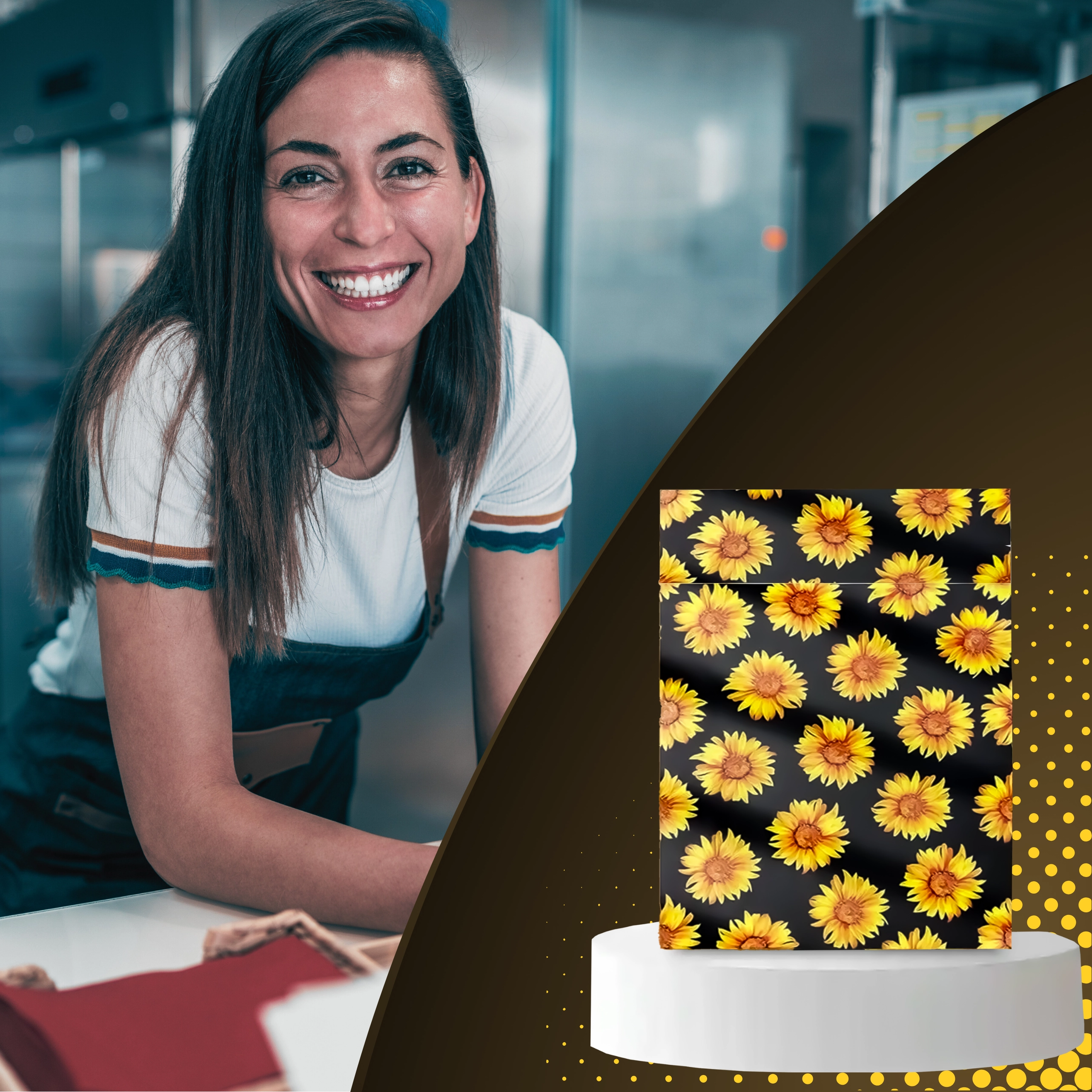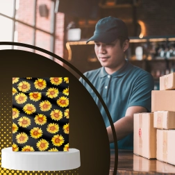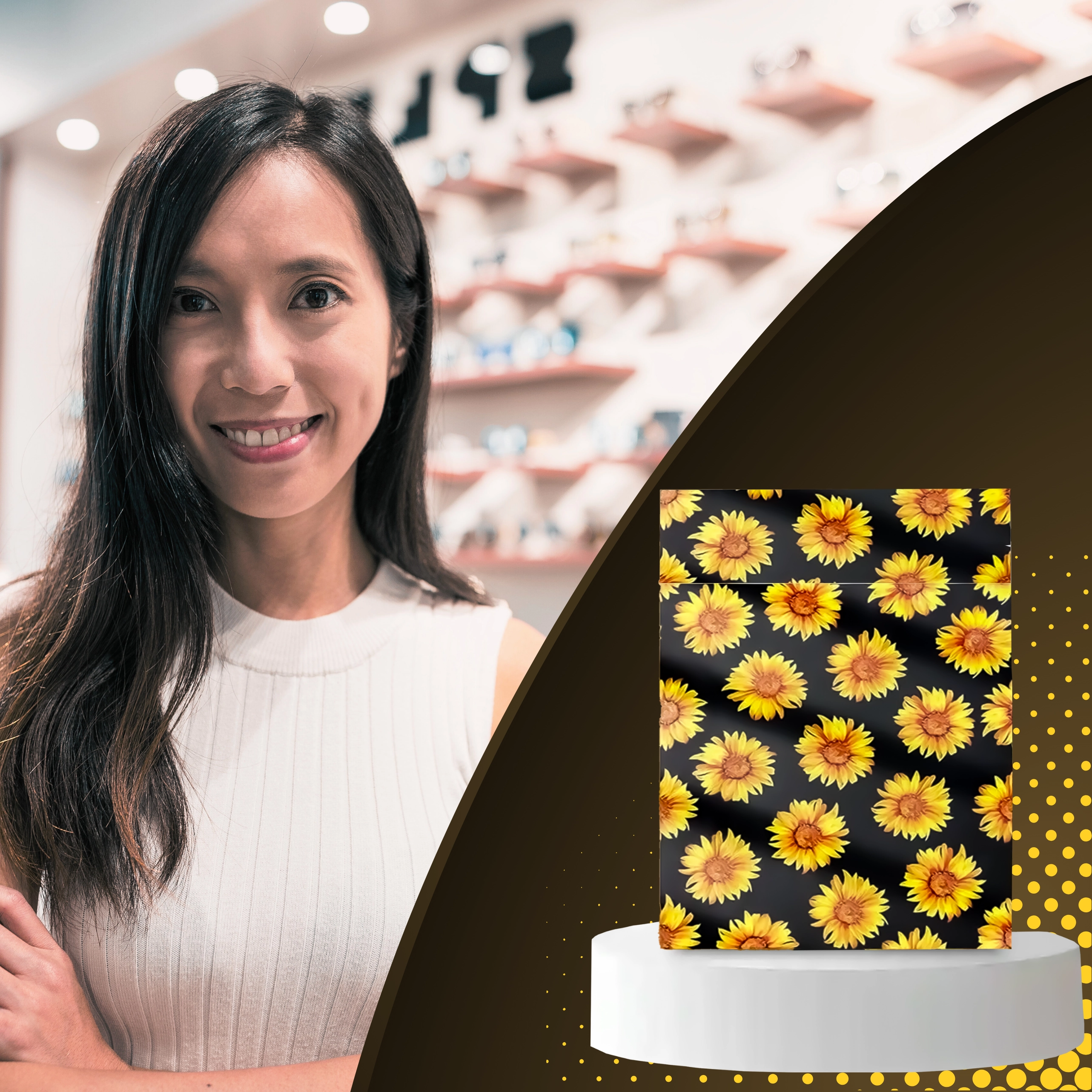 L’imprimé stylé de tournesols sur fond noir améliore l’expérience client et transforme chaque envoi en petit cadeau.