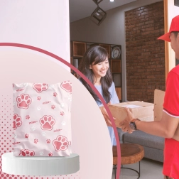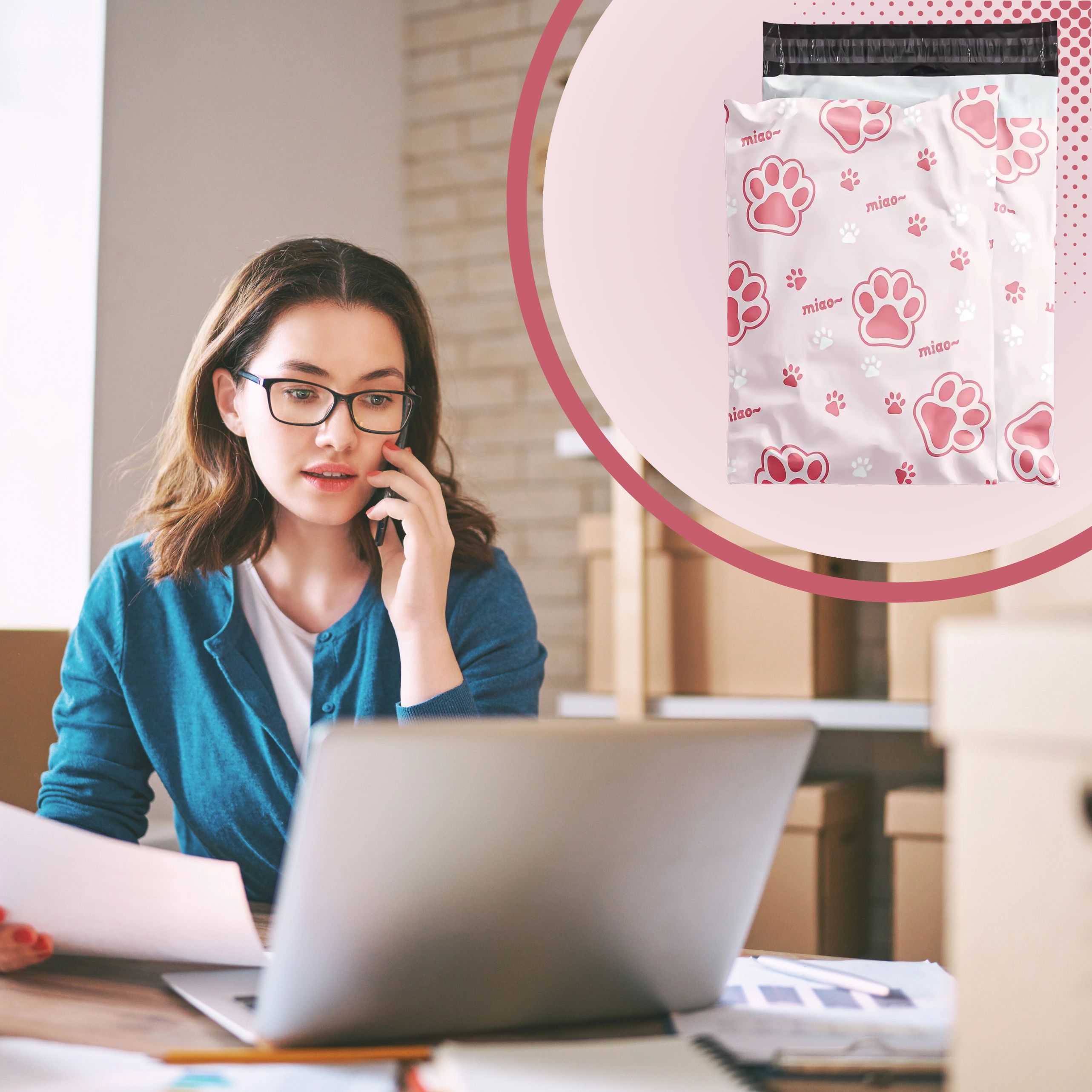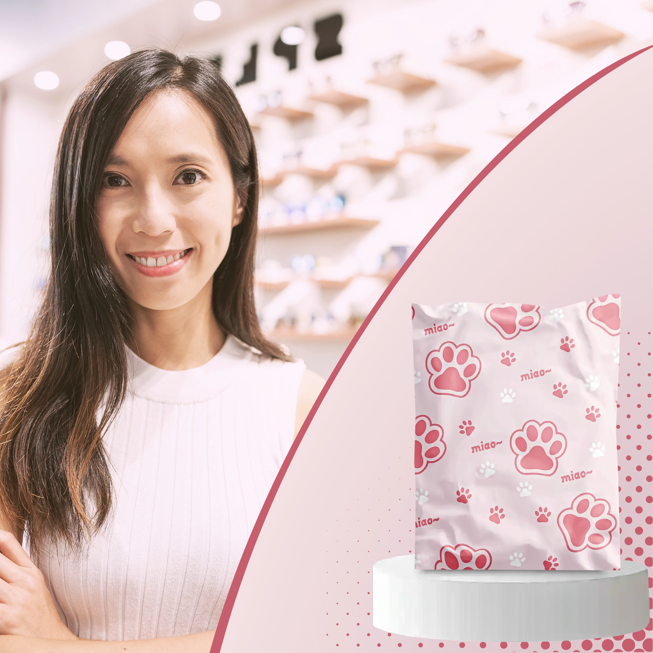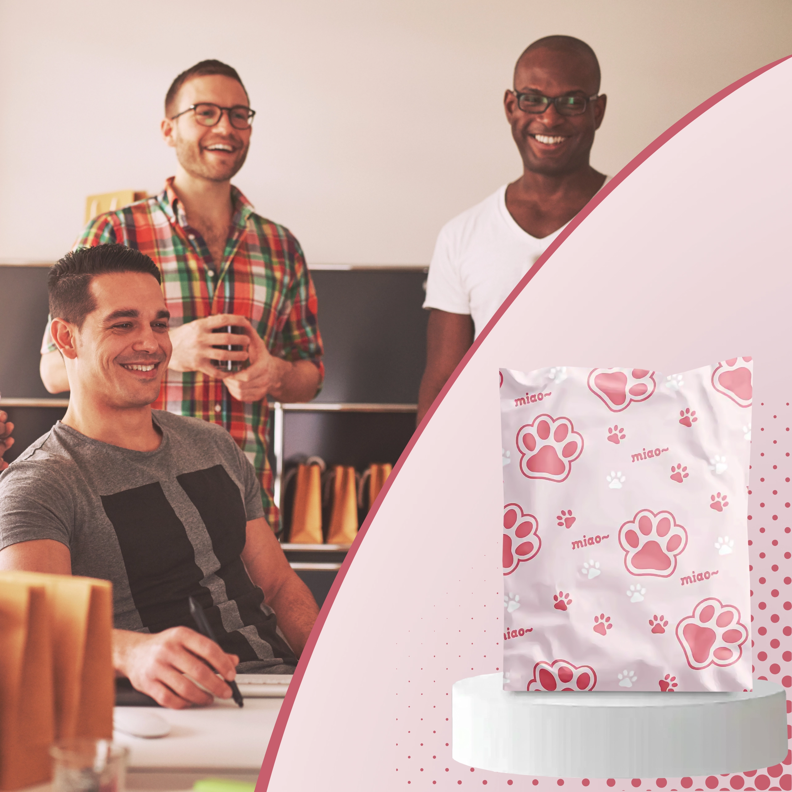 Impression rose et blanche avec l’inscription « miao » qui apporte une touche personnelle aux envois et se démarque des colis ordinaires.