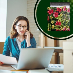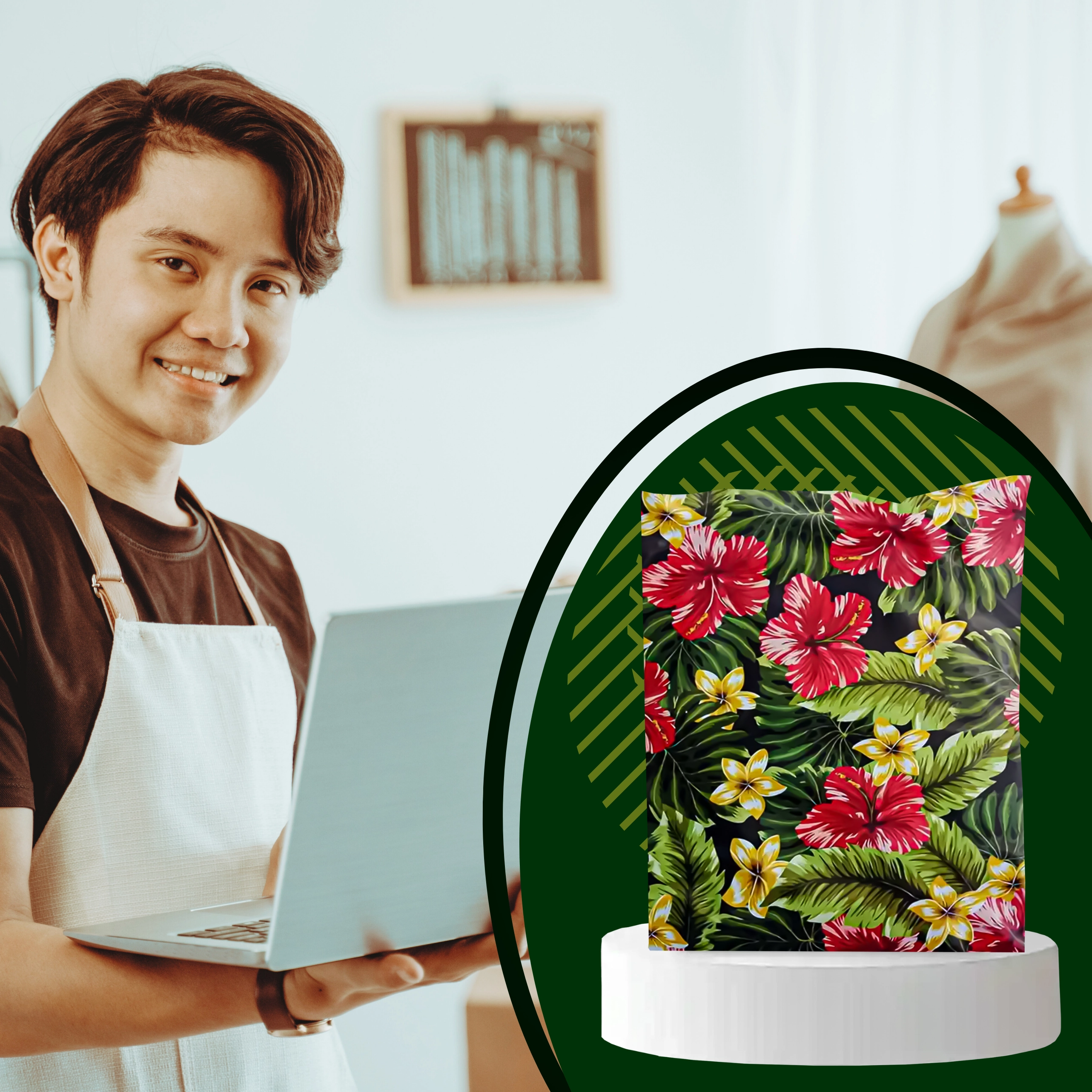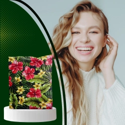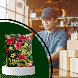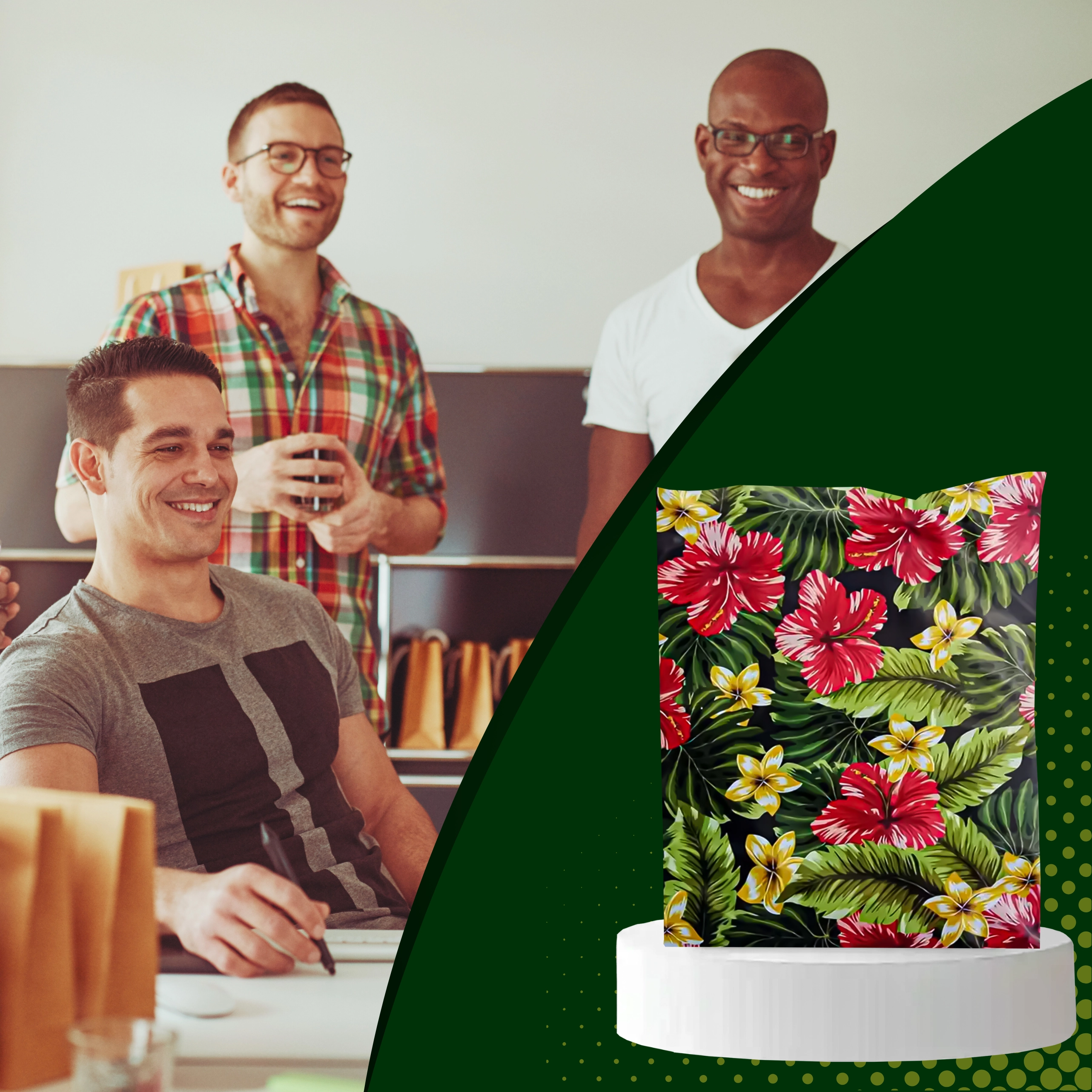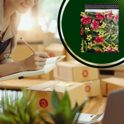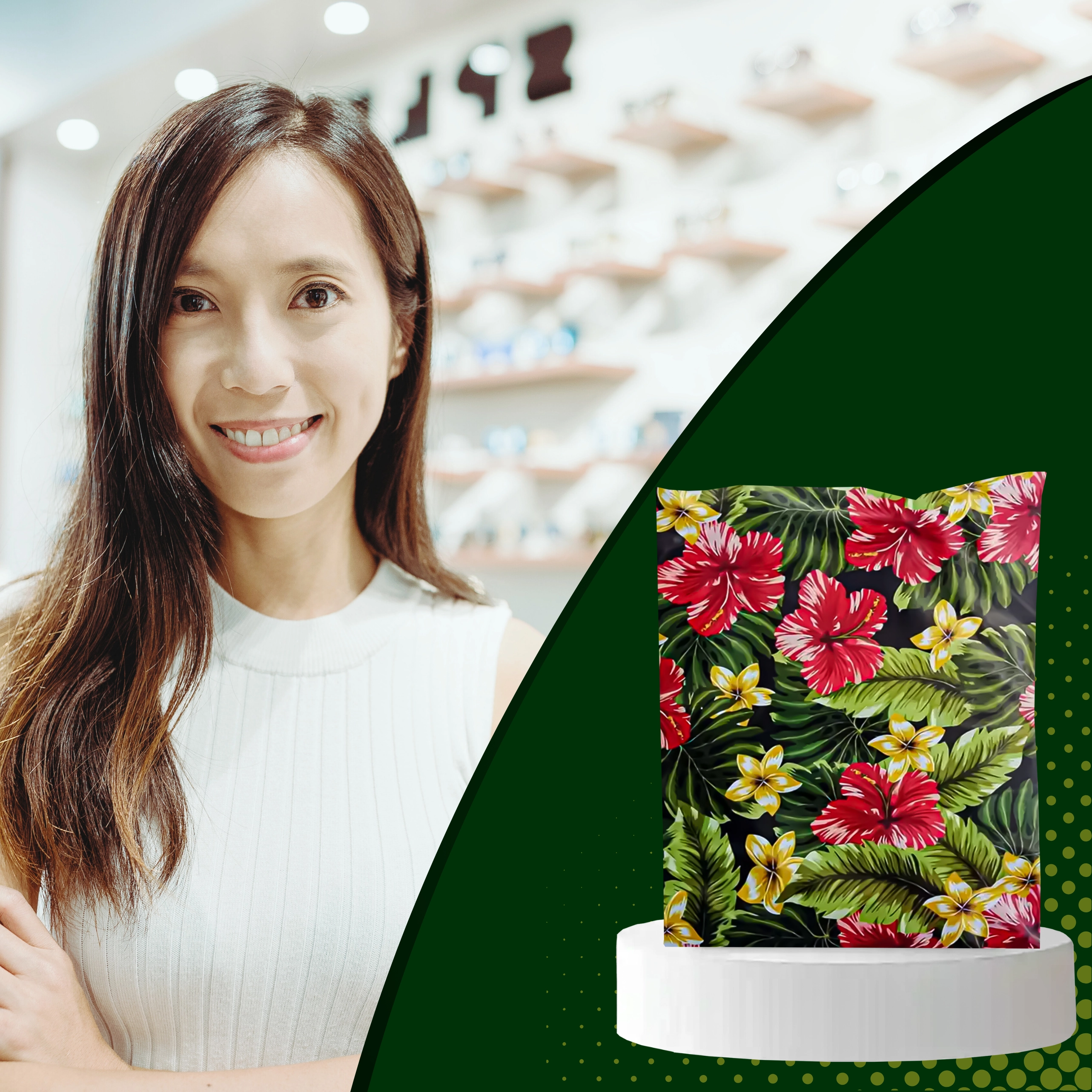 Un motif captivant d’hibiscus et de plumerias sur fond noir améliore l’expérience d’unboxing et renforce la mémorisation de votre marque.