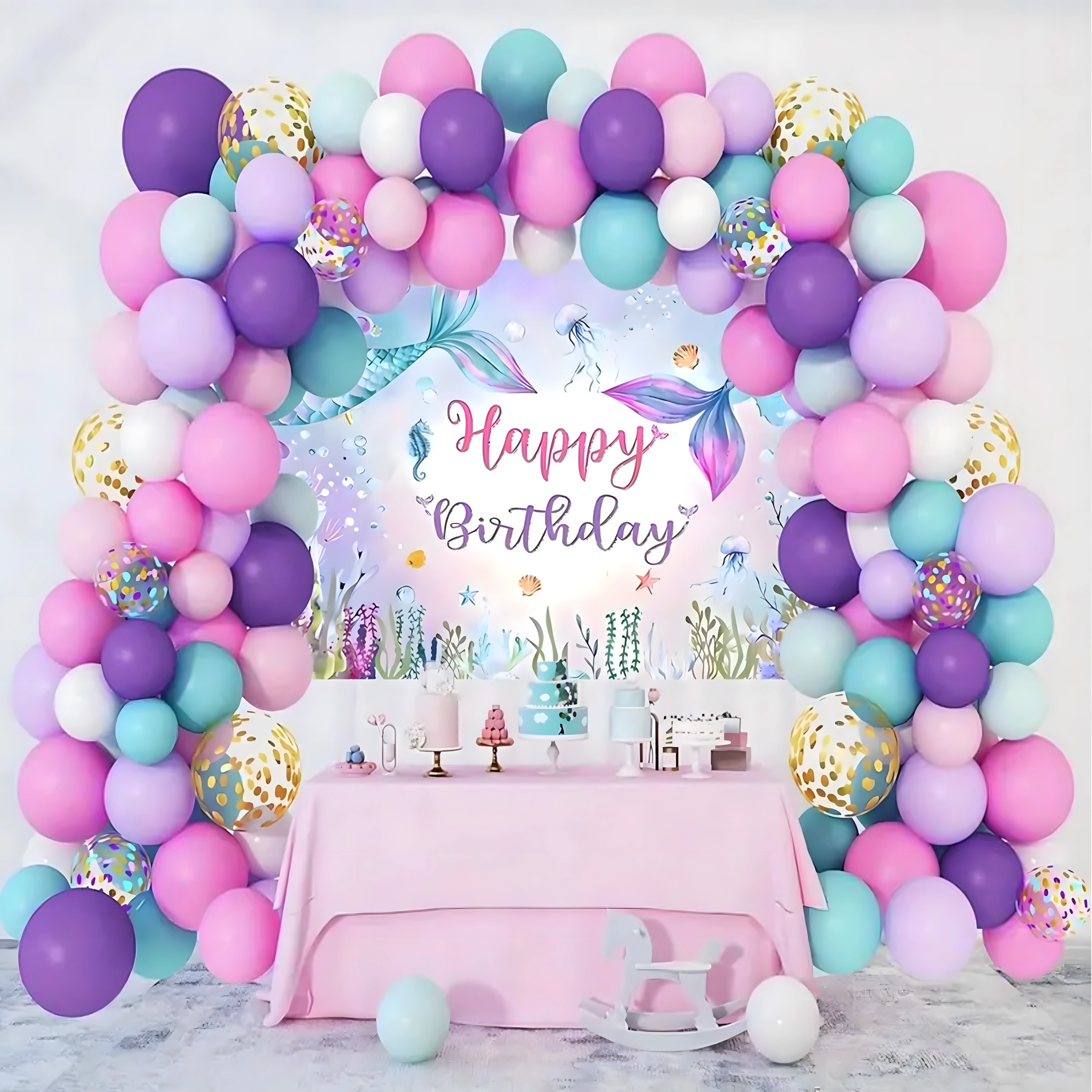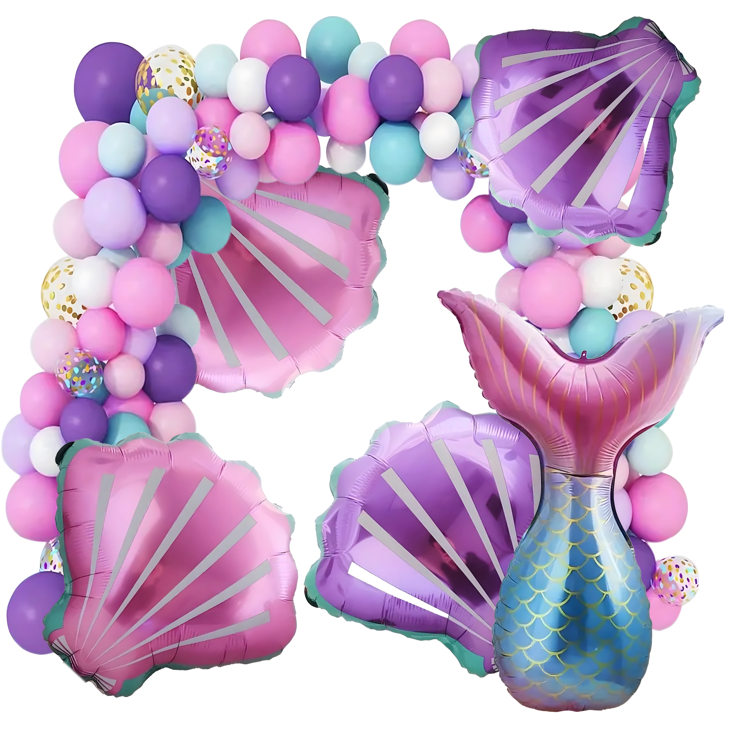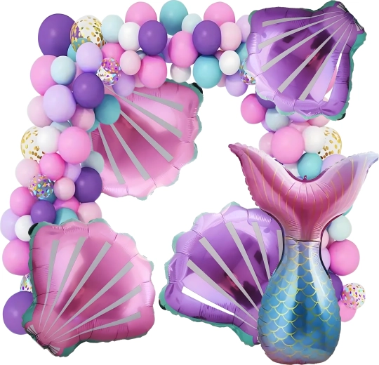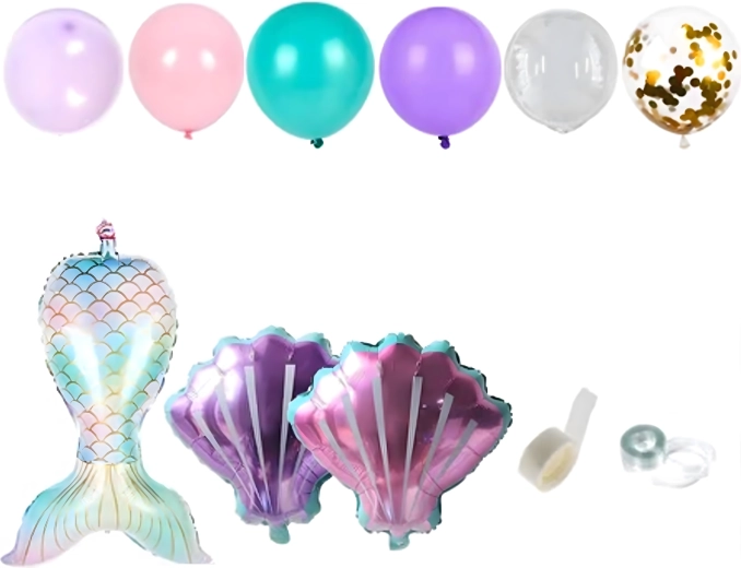 Cette guirlande décorative de ballons sur le thème de la sirène apportera à votre fête une touche pastel délicate et une atmosphère de conte de fées. Le paquet contient des ballons de formes et tailles variées, y compris des effets confettis et des motifs de coquillages, vous permettant de créer facilement une arche ou une composition captivante.