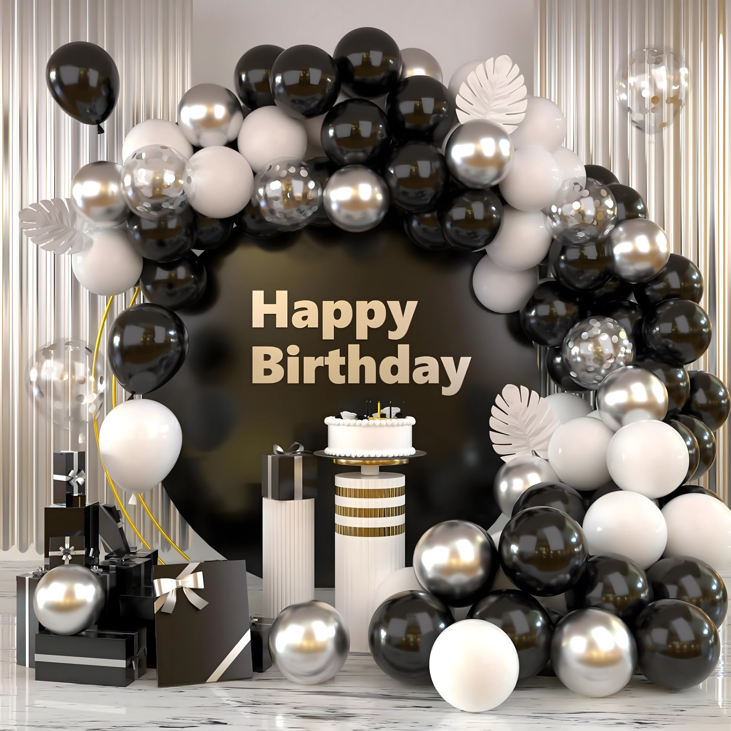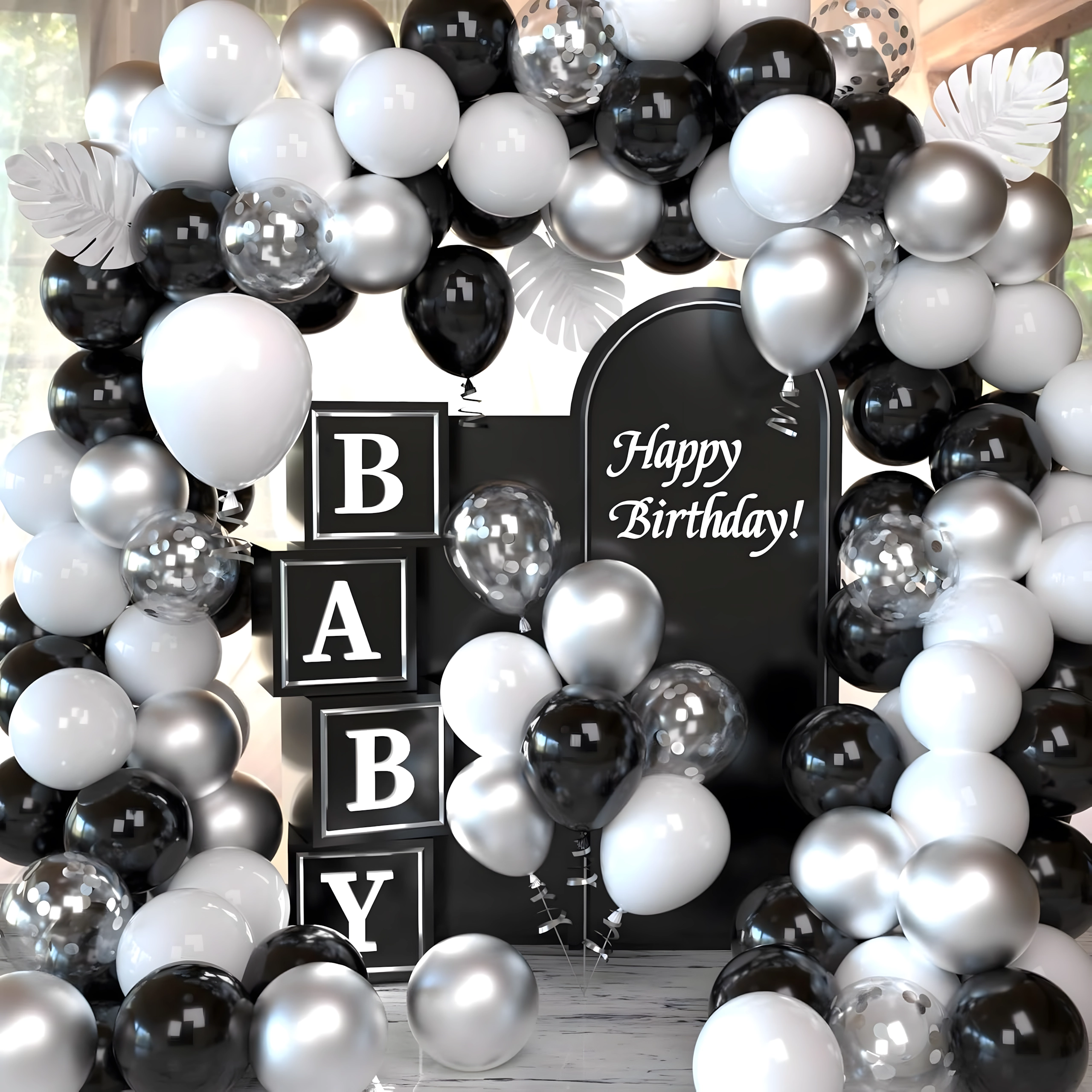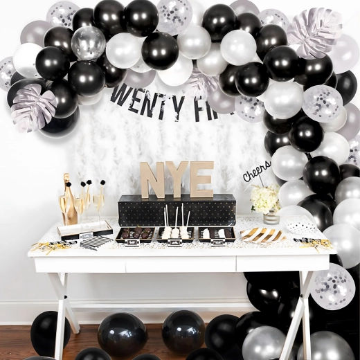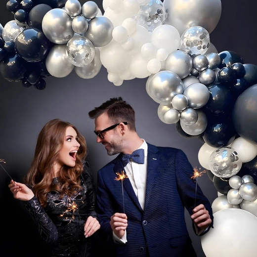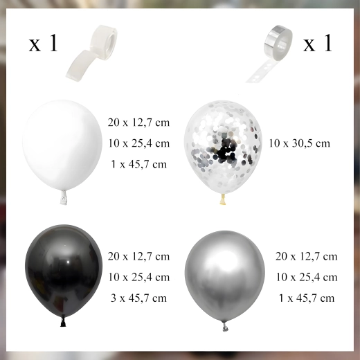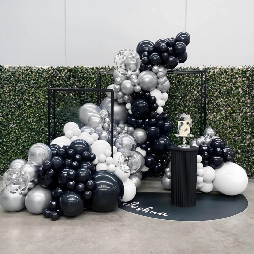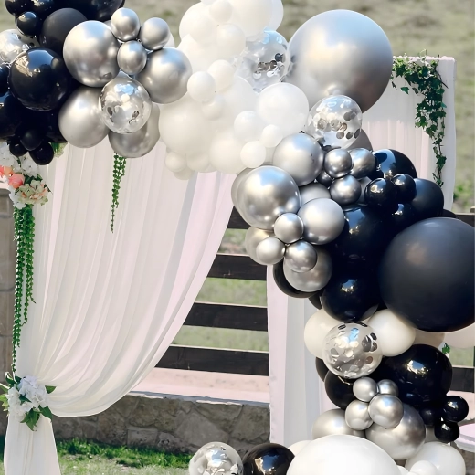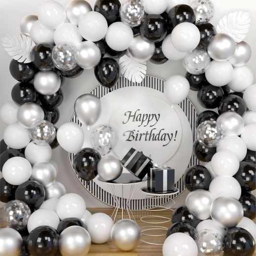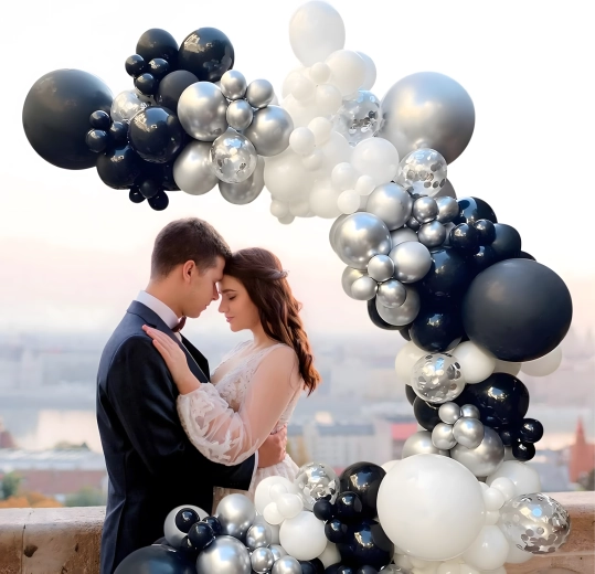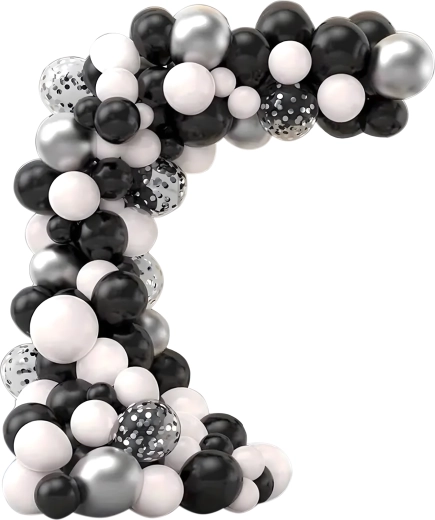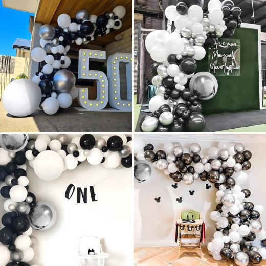 Élégante guirlande de ballons associant les couleurs noir, argenté et blanc pour anniversaires, mariages, réveillon et événements. Montage facile, couleurs spectaculaires et parfait fond photo pour toute fête.