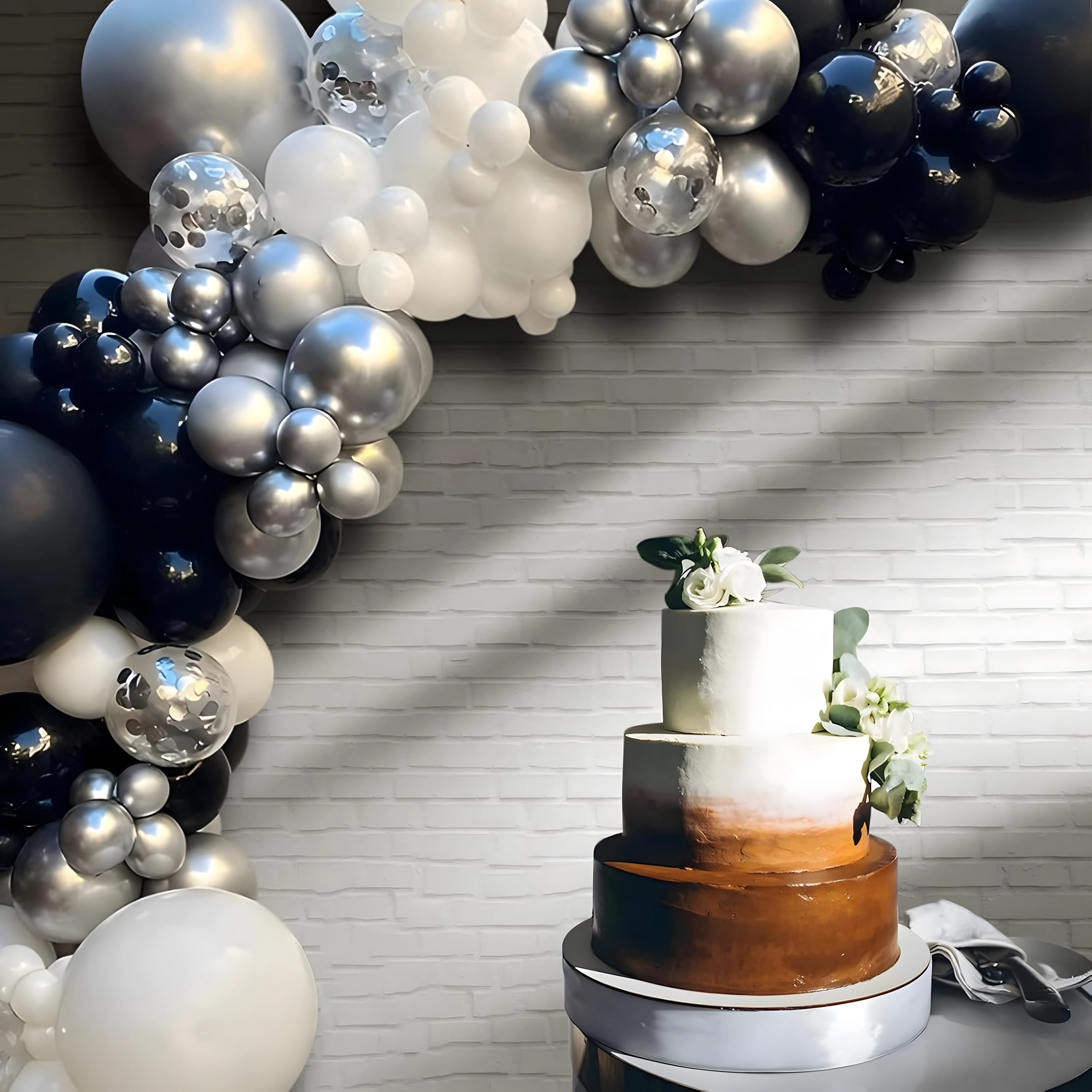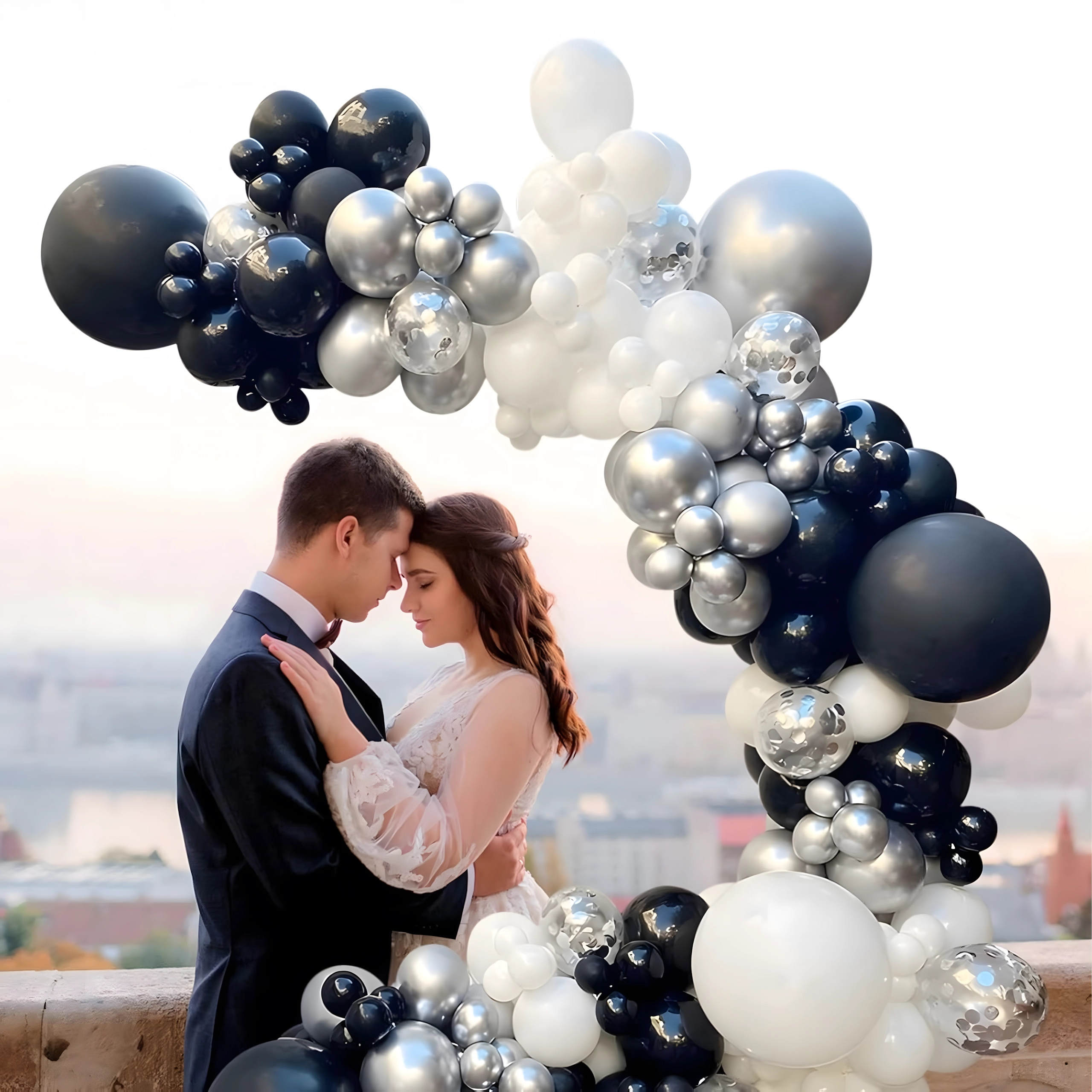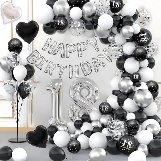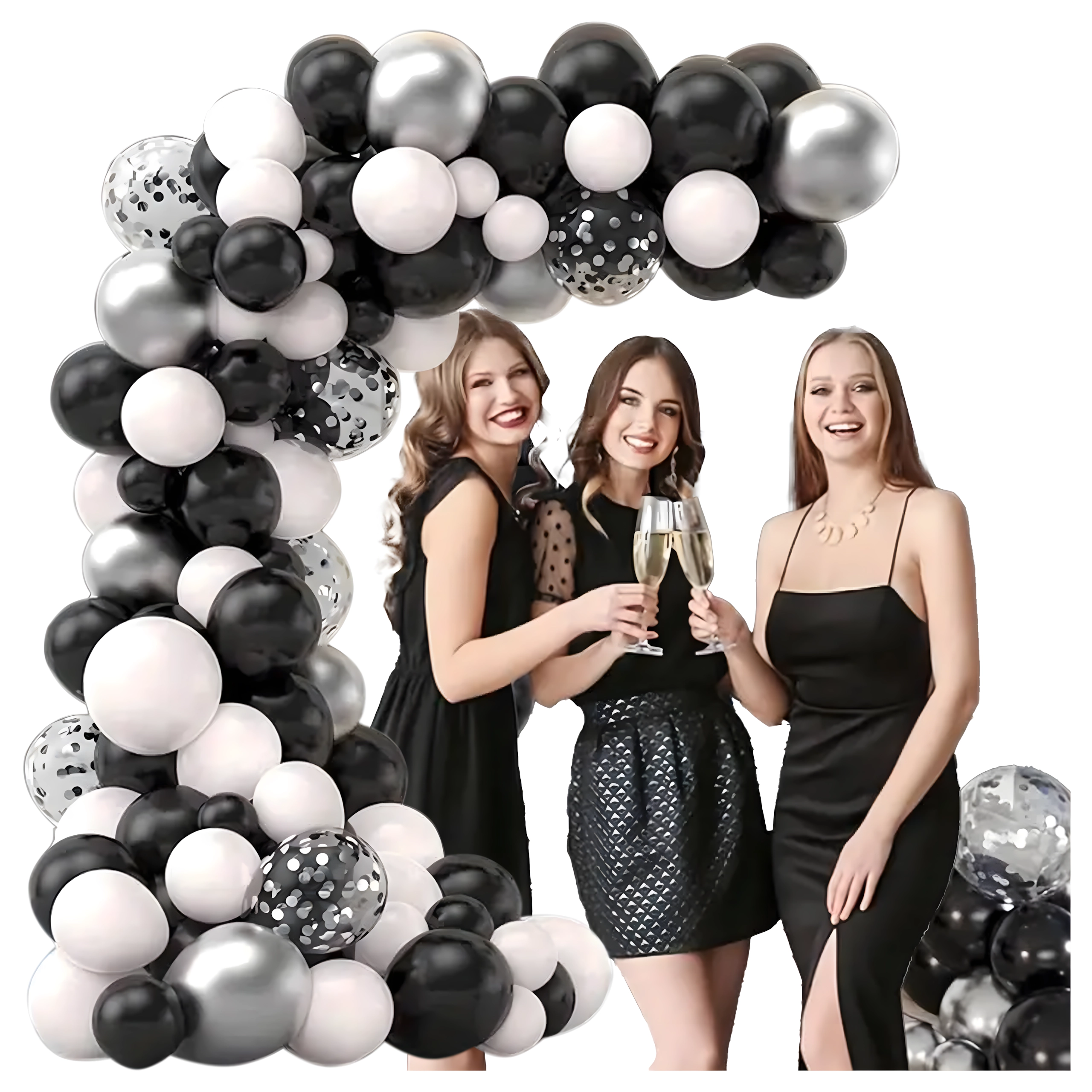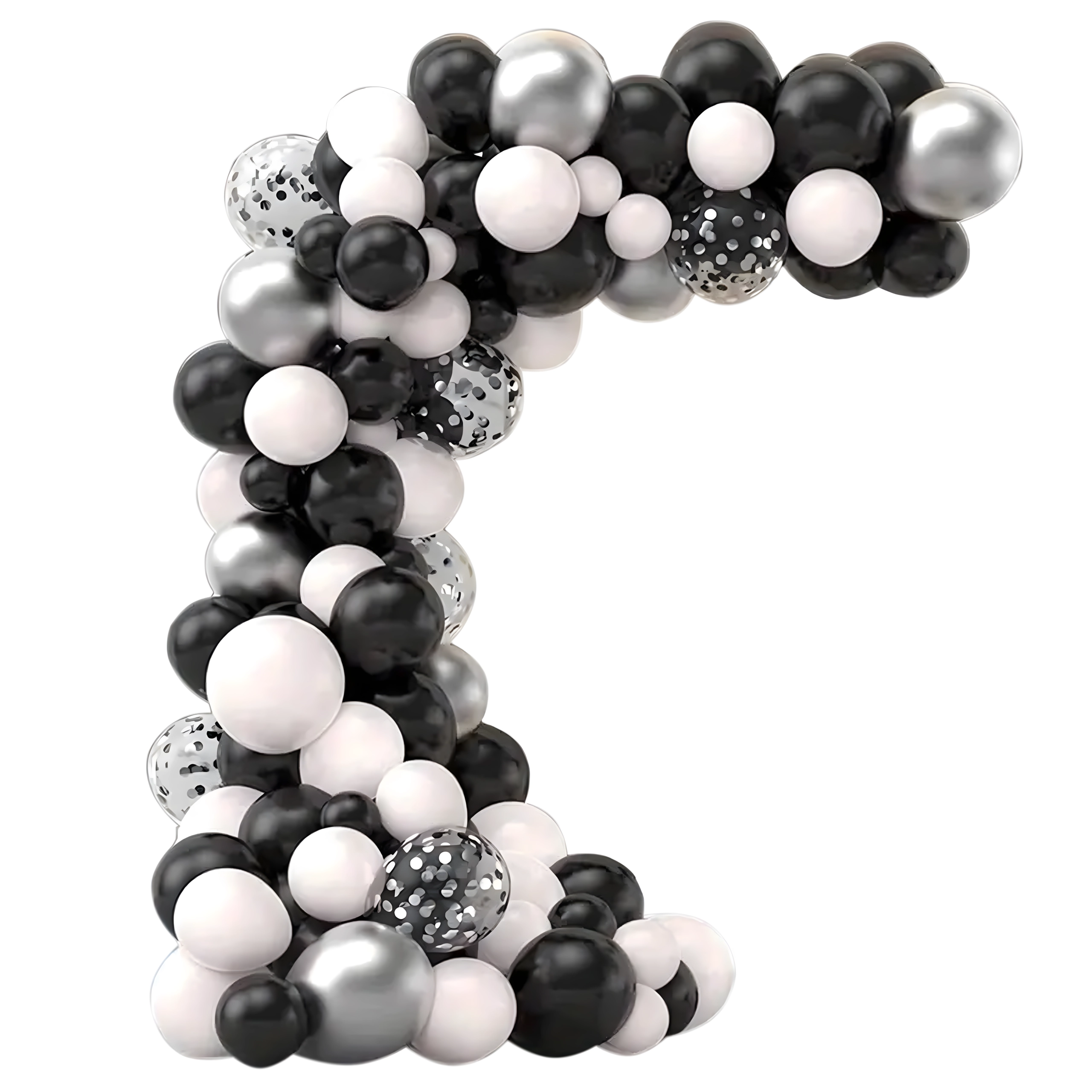 Élégante guirlande de ballons associant les couleurs noir, argenté et blanc pour anniversaires, mariages, réveillon et événements. Montage facile, couleurs spectaculaires et parfait fond photo pour toute fête.