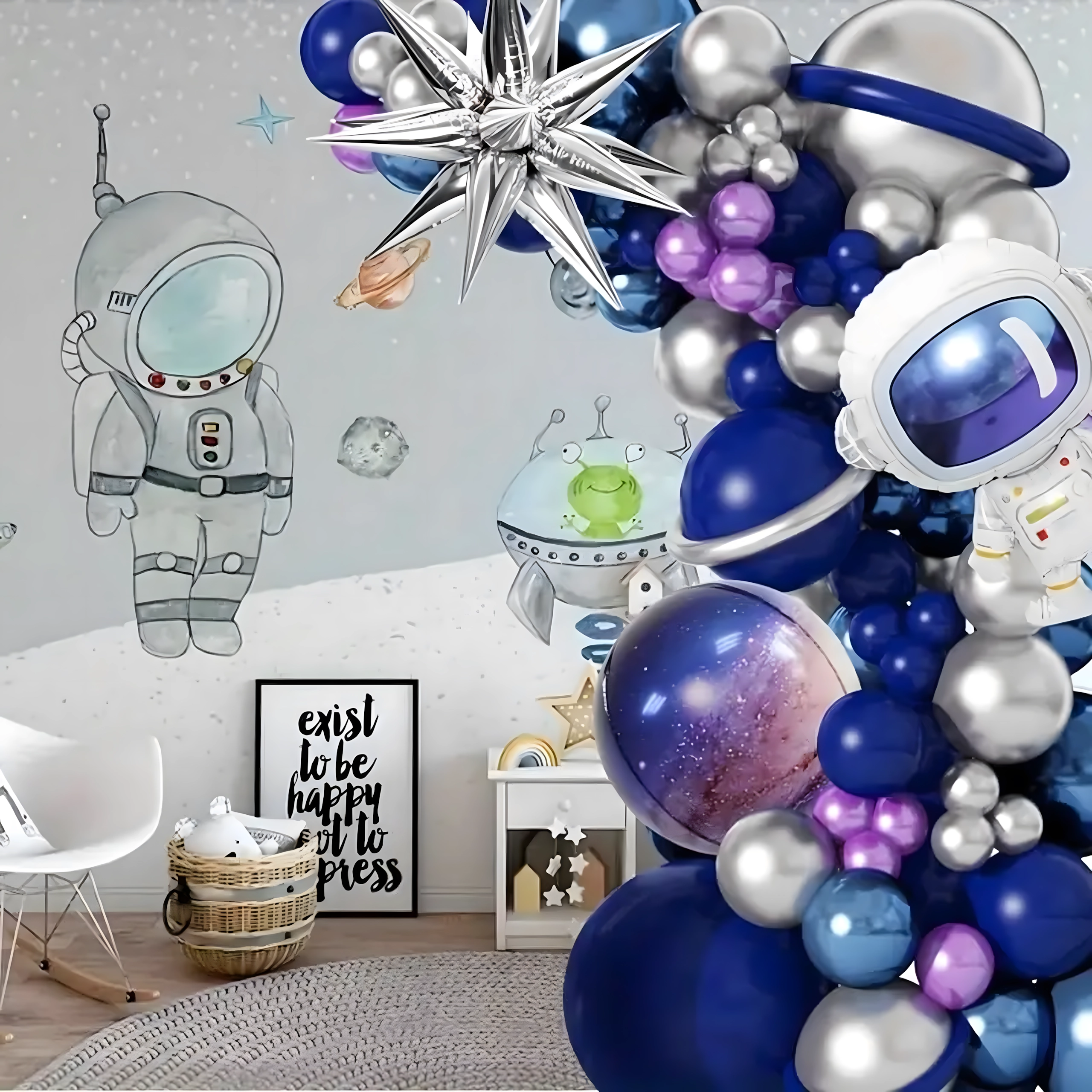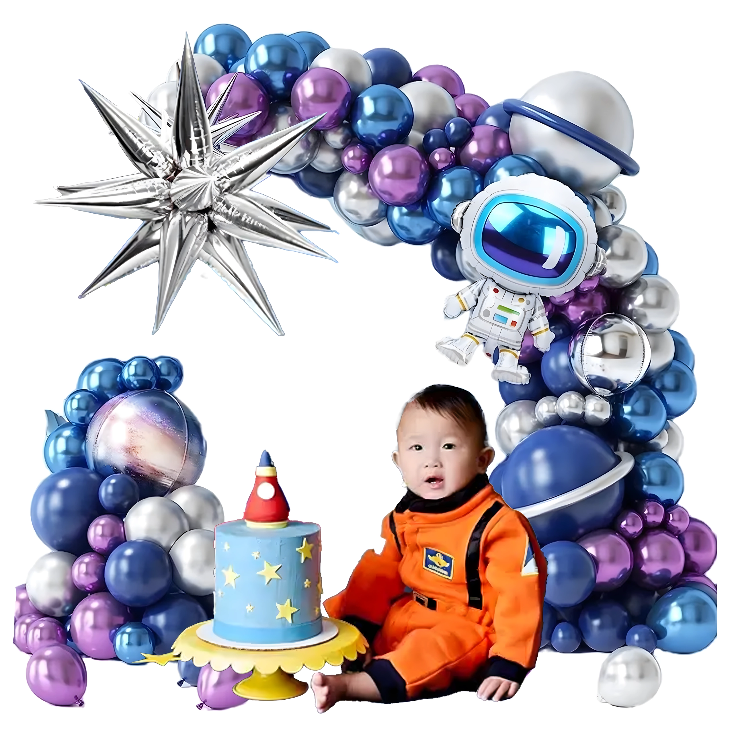 Idéale pour les amoureux de l’espace et des fusées. Le set peut être combiné avec d’autres décorations et s’adapte facilement à la taille de l’espace. Grâce à son utilisation polyvalente et au grand nombre d’éléments, vous pourrez décorer l’entrée, le photobooth et le candy bar.