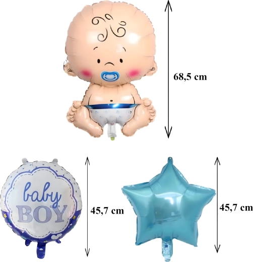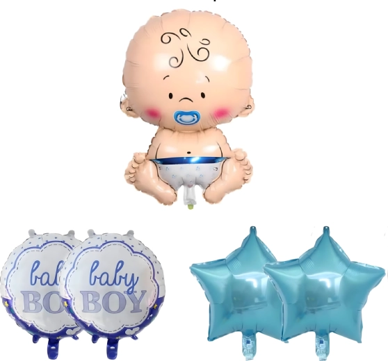 Un ensemble stylé de ballons pour garçon avec motif de bébé, d’étoiles et l’inscription Baby Boy. Idéal pour la baby shower, la bienvenue au nouveau-né, les séances photo et la décoration de la chambre d’enfant.