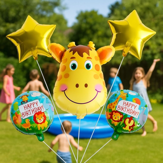 Illuminez une fête d’enfants avec un élégant set de ballons au motif girafe ! Cette décoration colorée comprend 1 ballon en aluminium girafe, 2 ballons avec l’inscription HAPPY BIRTHDAY et 2 étoiles dorées. Idéal pour un anniversaire thème zoo/safari et toute fête d’enfants.