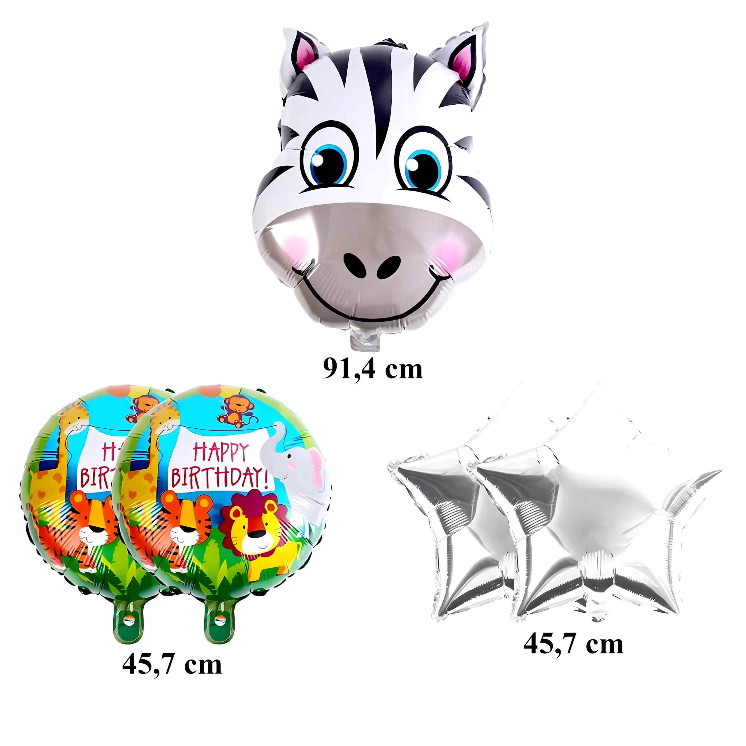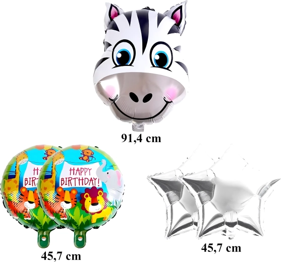 - 1× ballon en aluminium girafe, 2× ballon avec l’inscription HAPPY BIRTHDAY, 2× étoile dorée