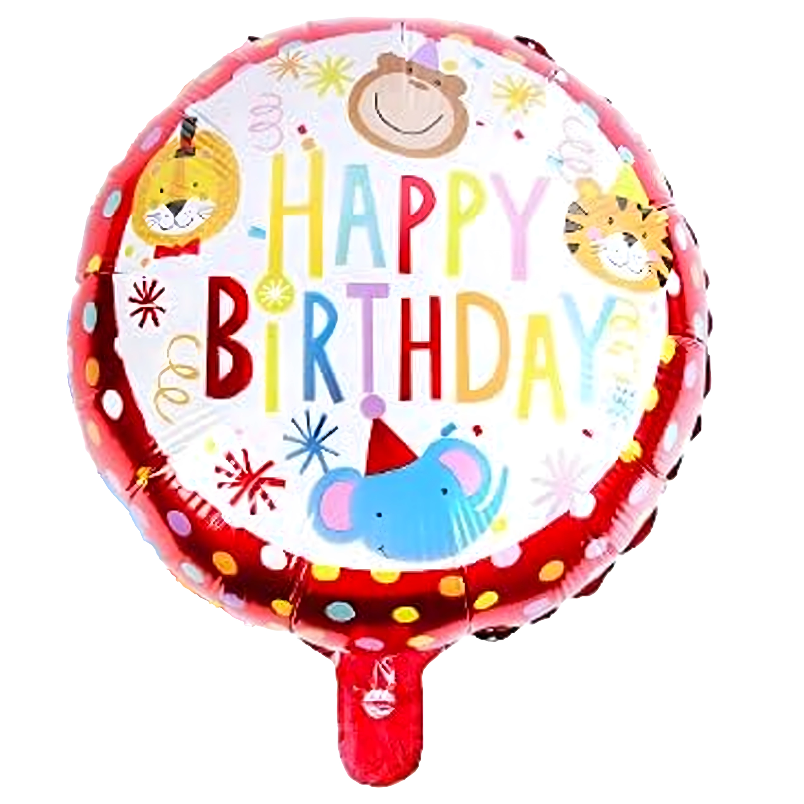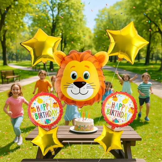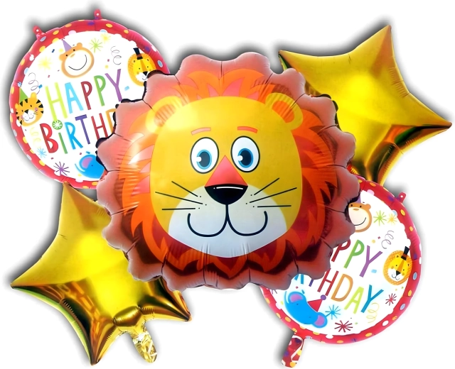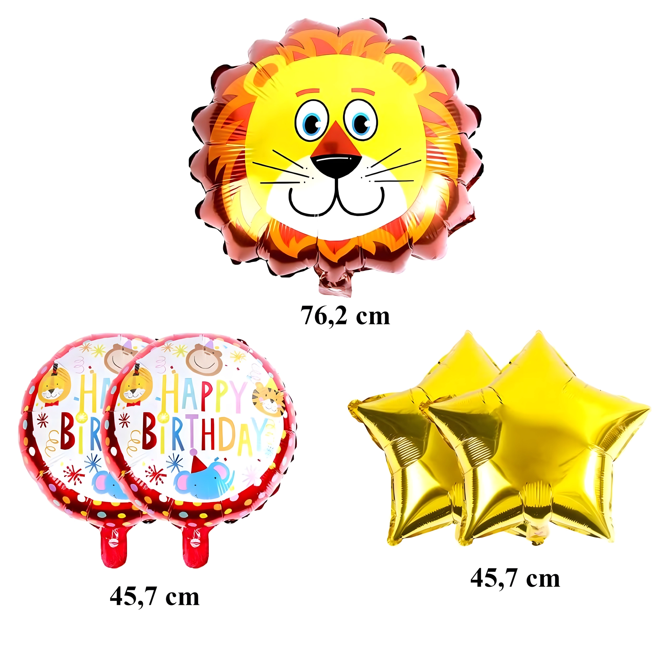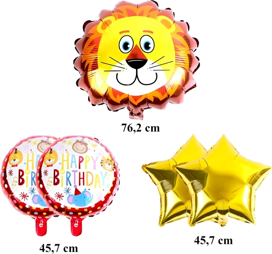 - 1× ballon lion, 2× ballon avec inscription HAPPY BIRTHDAY, 2× étoile dorée