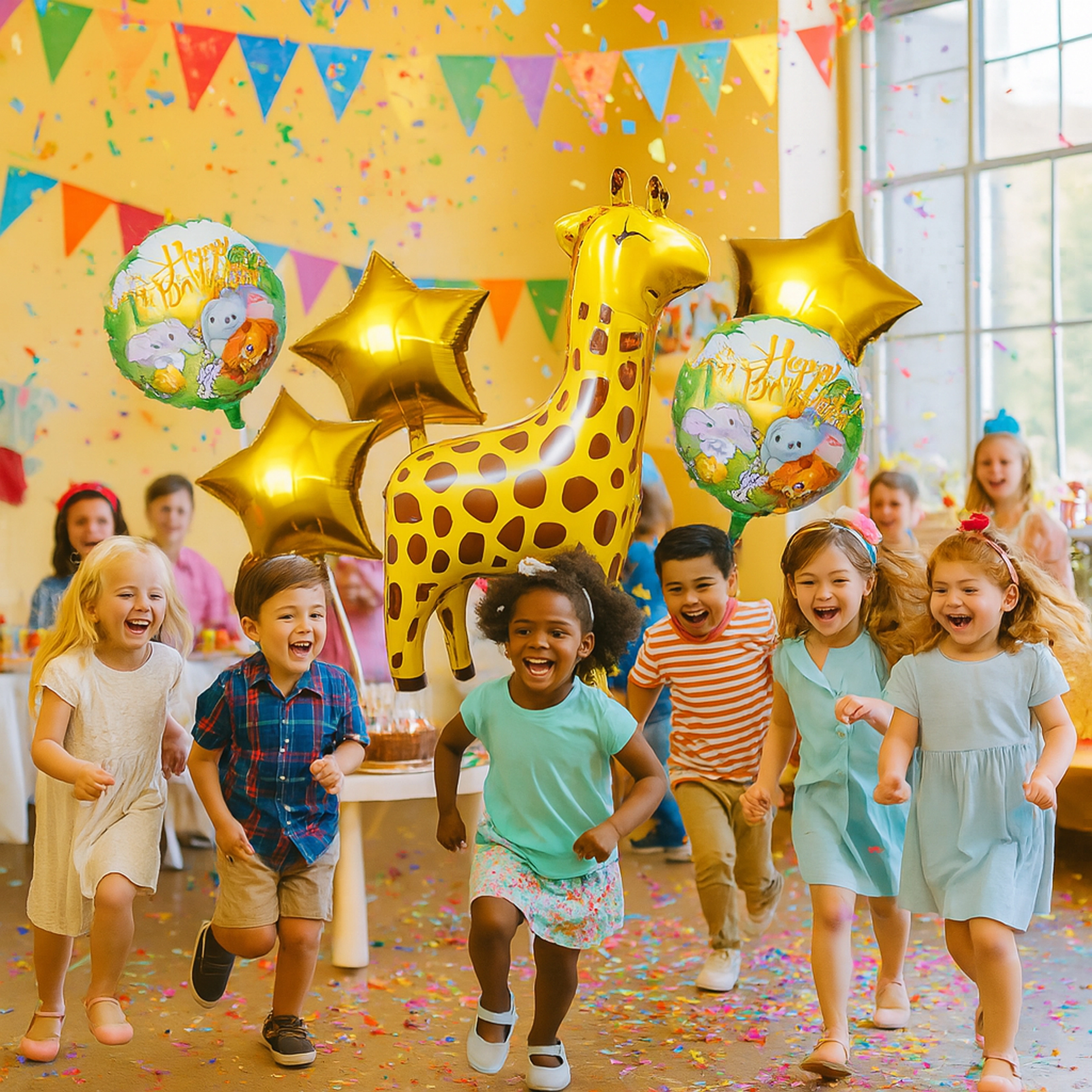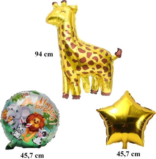 1x ballon en feuille girafe, 2x ballon avec inscription HAPPY BIRTHDAY, 2x étoile dorée