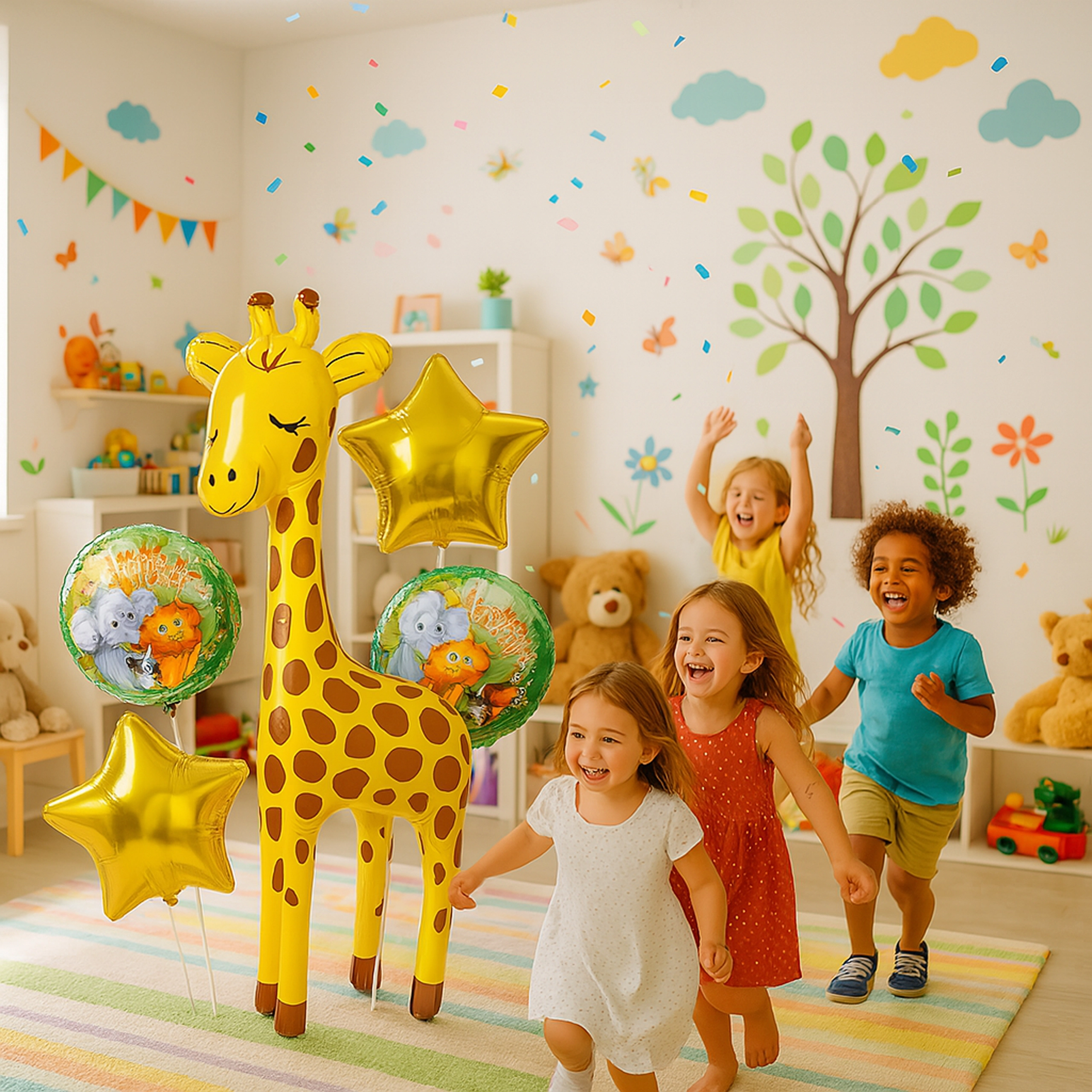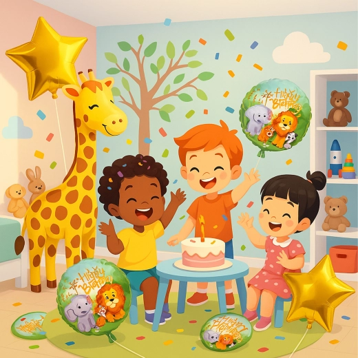 Vous cherchez une décoration rapide et efficace pour une fête d’enfants ? Ce set coloré de ballons avec une girafe crée une atmosphère joyeuse en un rien de temps. La combinaison de l’inscription HAPPY BIRTHDAY et des étoiles dorées complète joliment le motif principal de la girafe et convient aussi bien aux filles qu’aux garçons.