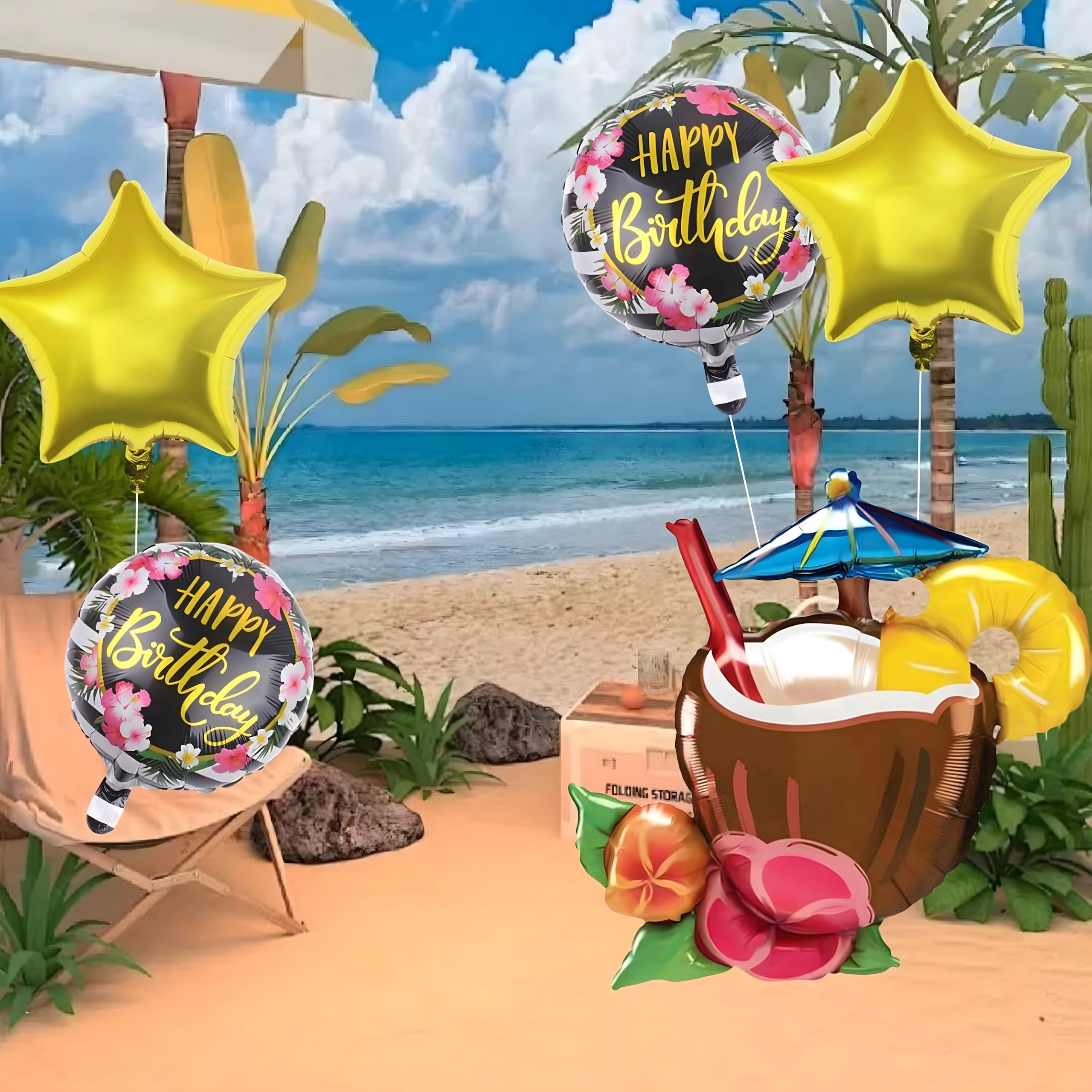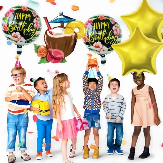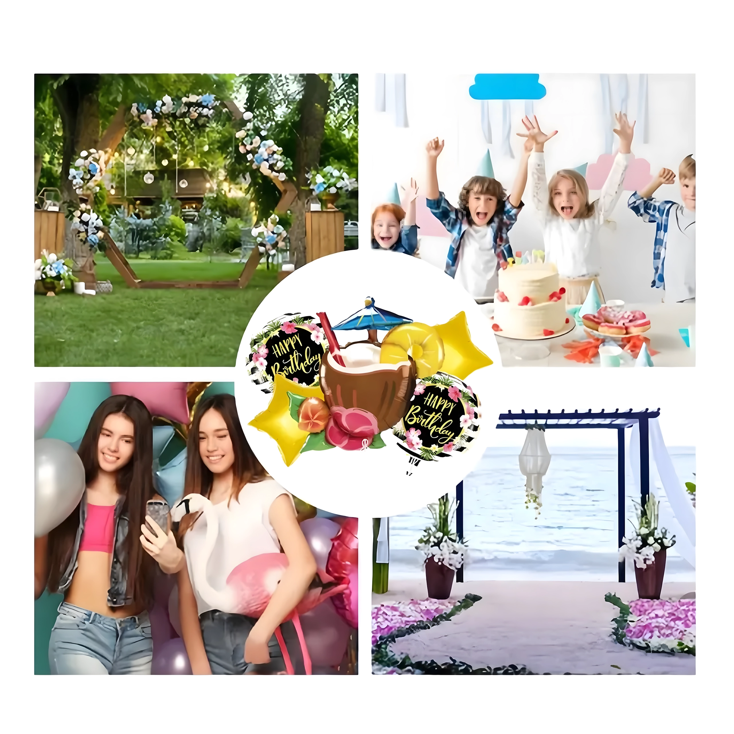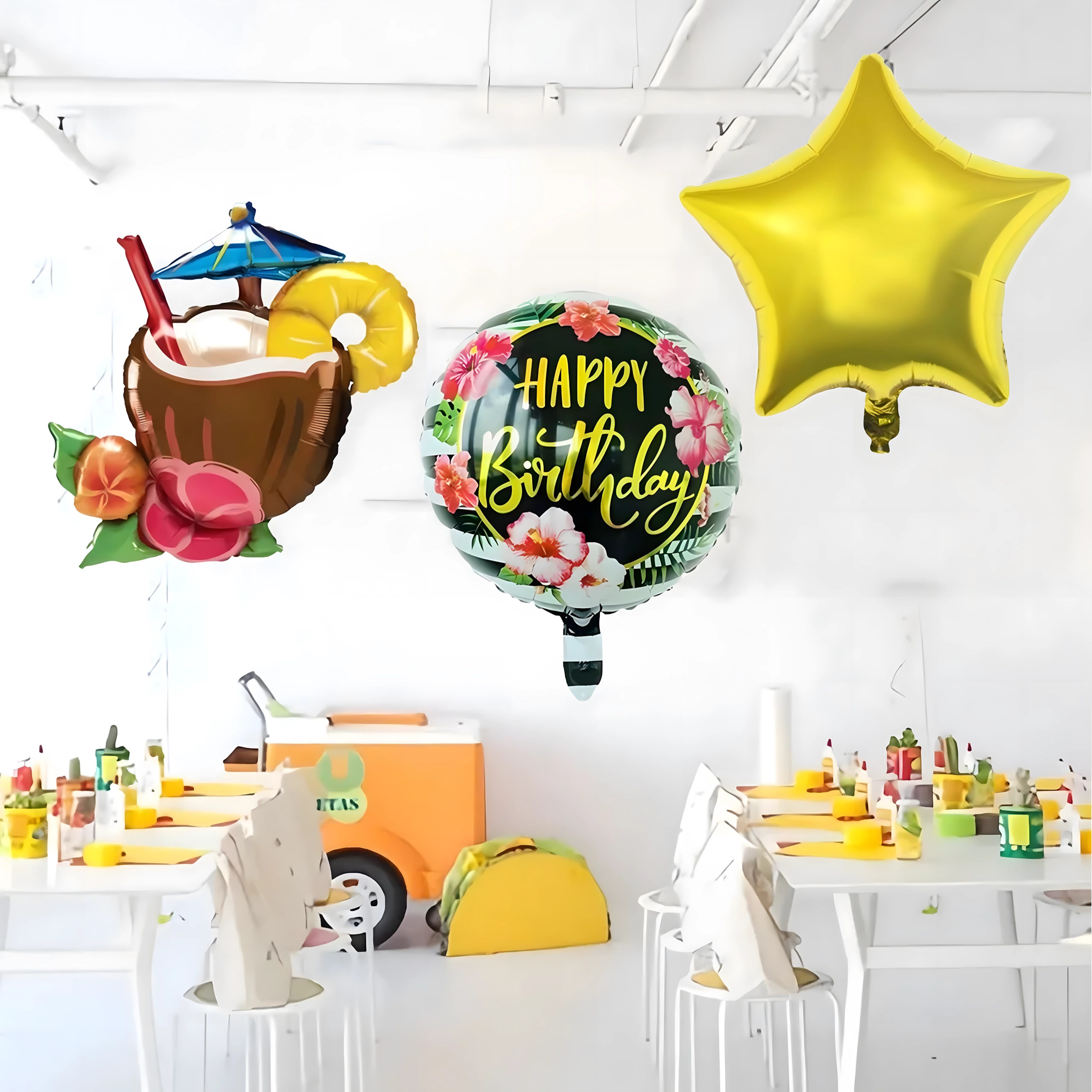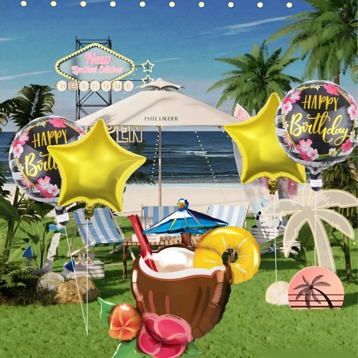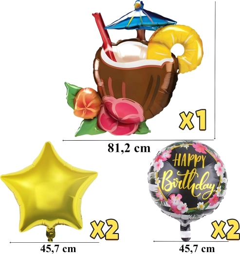 Illuminez votre fête avec des couleurs vives et une ambiance tropicale. Ce set de ballons Aloha offre une combinaison joyeuse de motifs, parfaite pour les anniversaires, garden-parties ou barbecues d’été. La pièce maîtresse est un ballon remarquable en forme de boisson rafraîchissante, complété par des ballons ronds classiques avec l’inscription Happy Birthday et des étoiles dorées élégantes.