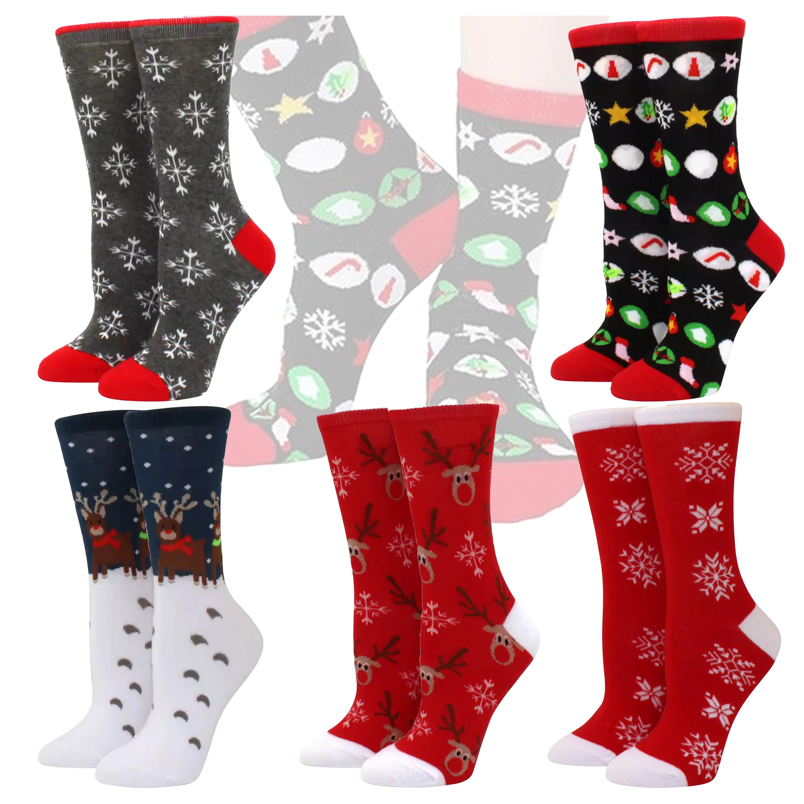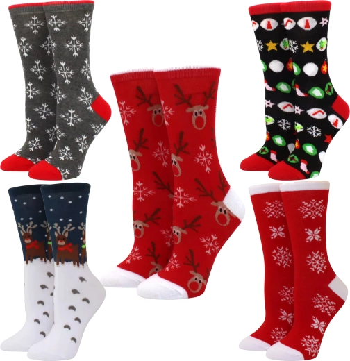 Set stylé de 5 paires de chaussettes de Noël en coton pour le confort et la bonne humeur pendant les jours d’hiver. En coton de haute qualité – doux, respirant et agréable au toucher. Des motifs joyeux comme rennes, sapins et flocons de neige créent une atmosphère festive. Une excellente idée cadeau pour Noël et la Saint-Nicolas.