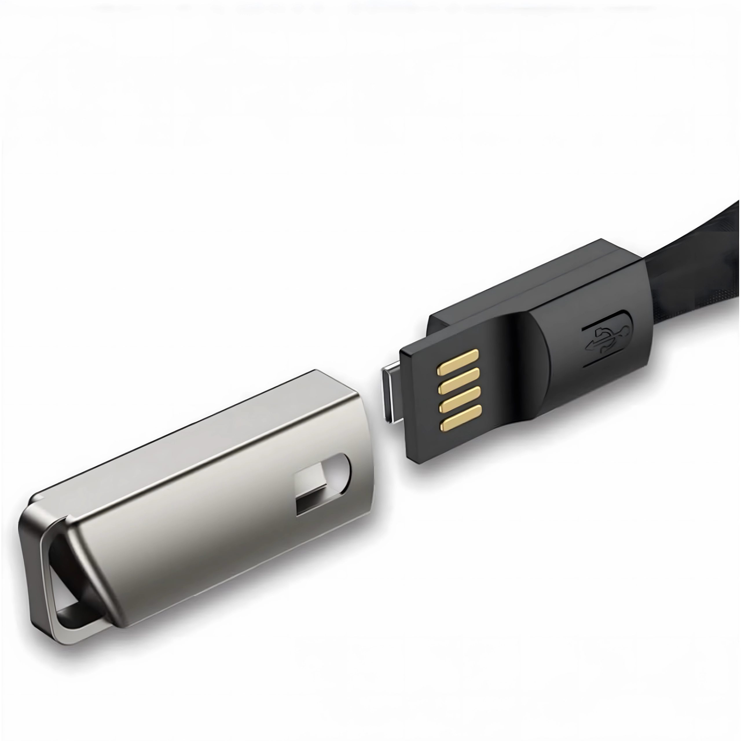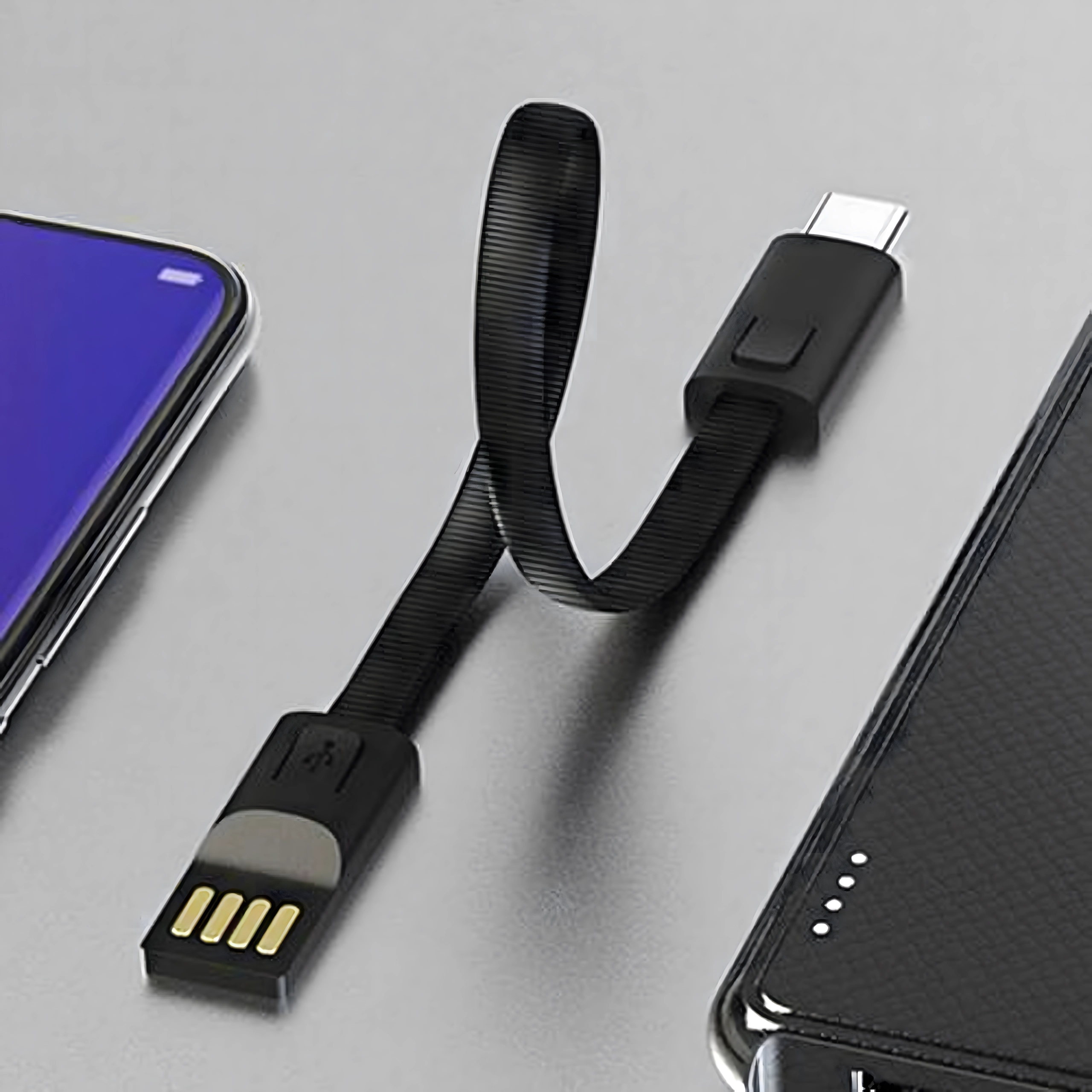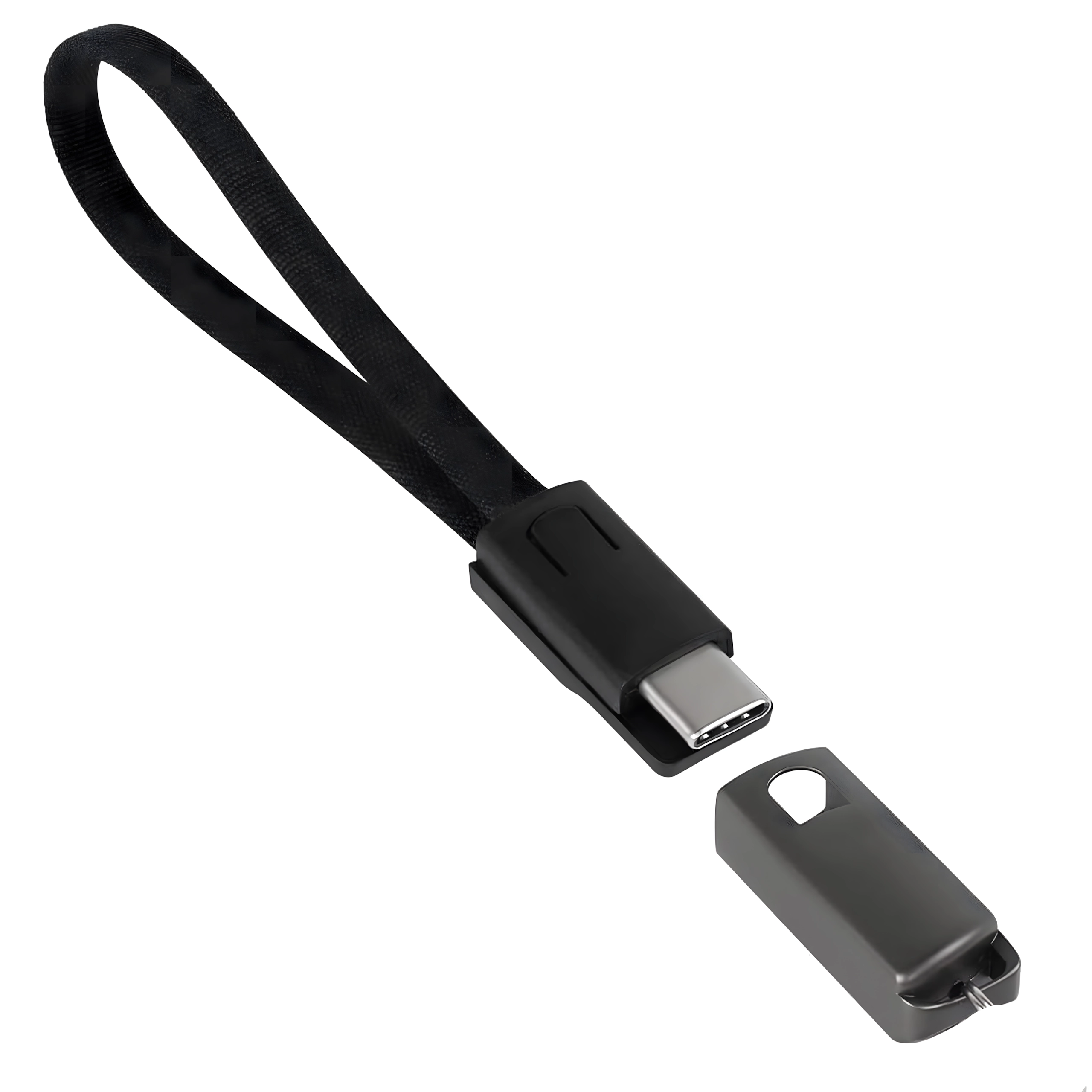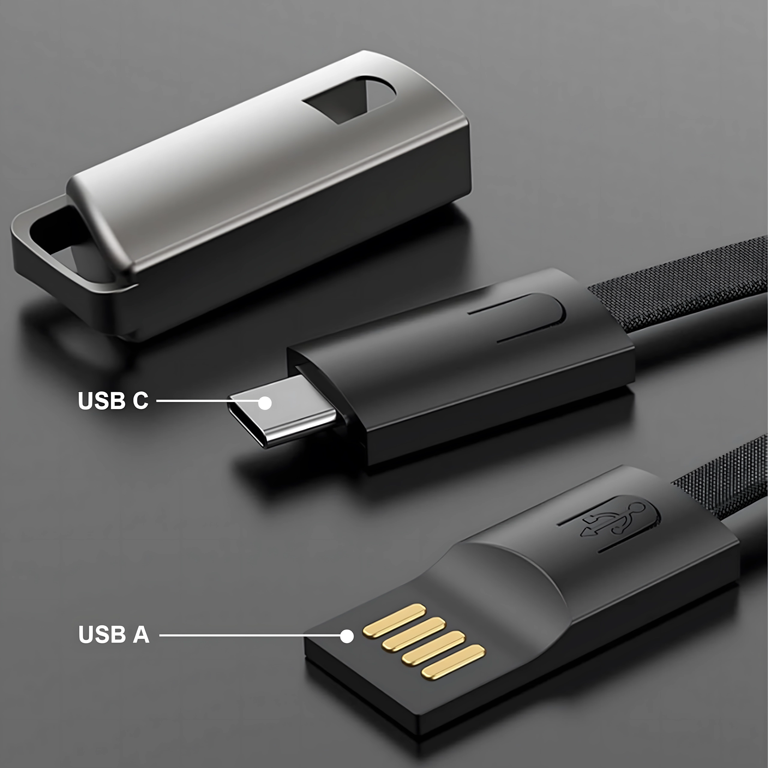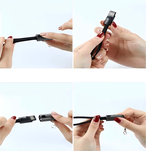 Câble compact et élégant en forme de porte‑clés/cordon avec connecteurs USB‑C et USB‑A offrant une charge rapide et un transfert de données fiable. Idéal pour un usage quotidien, sur un trousseau de clés ou un sac à dos – toujours à portée de main, sans encombrement inutile de câbles.
