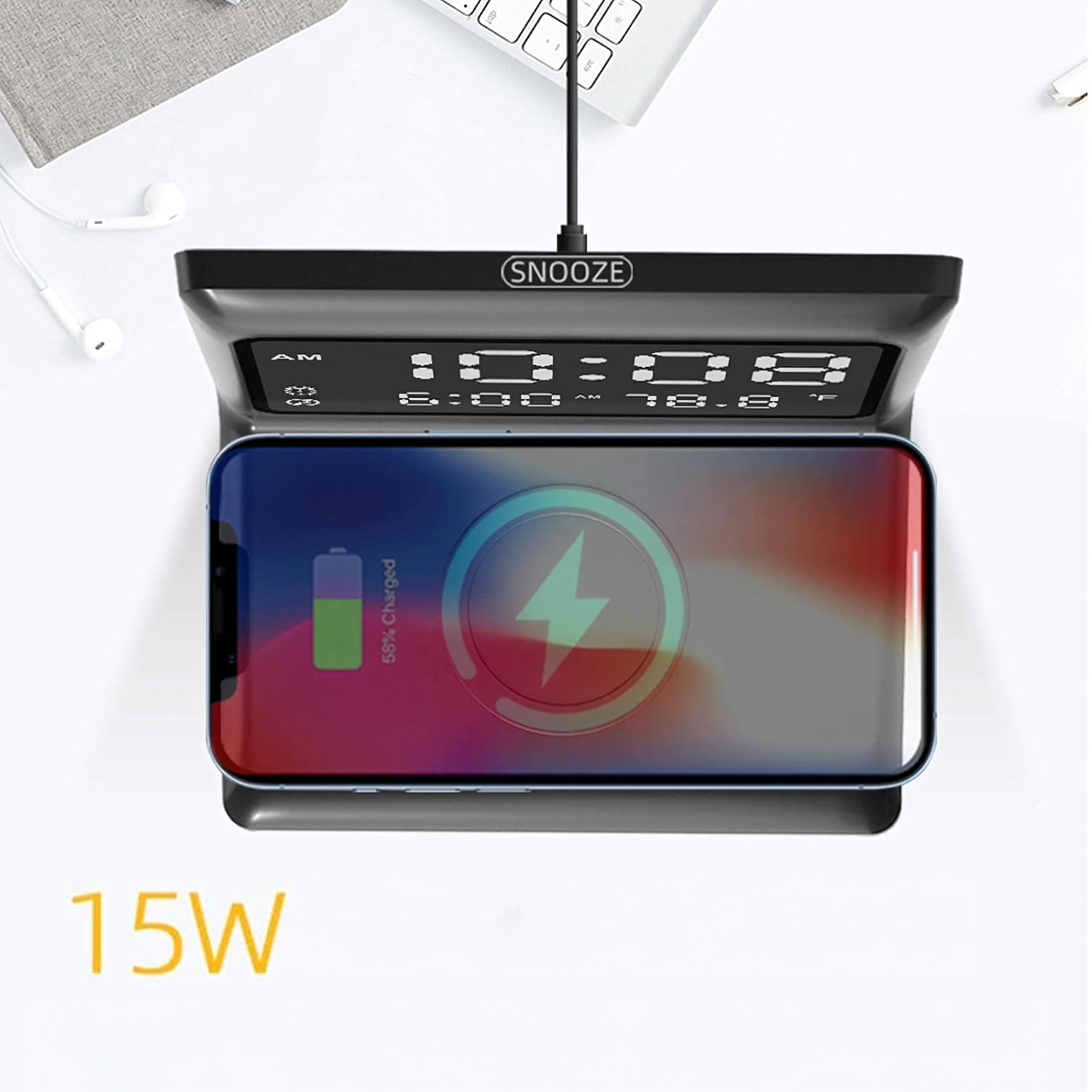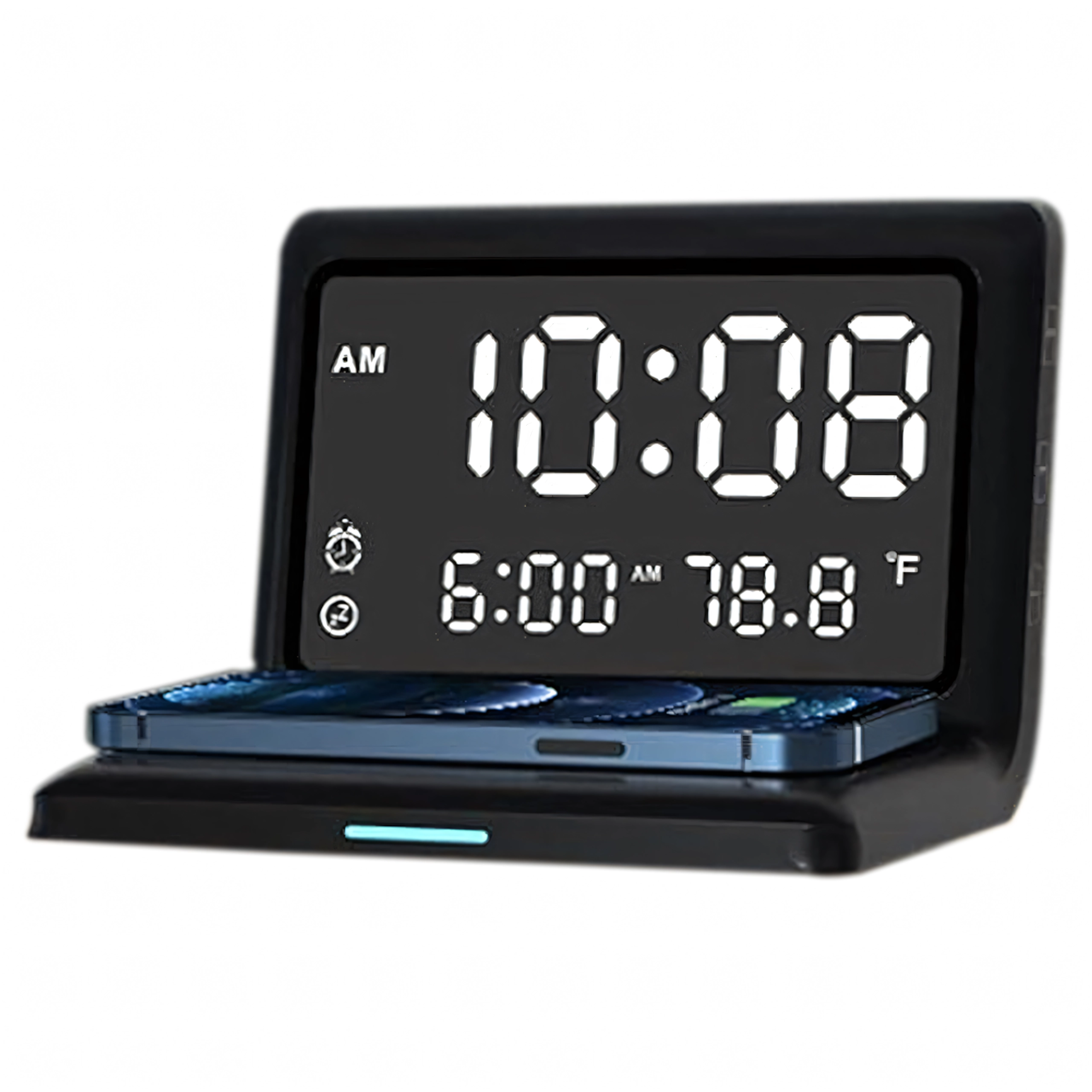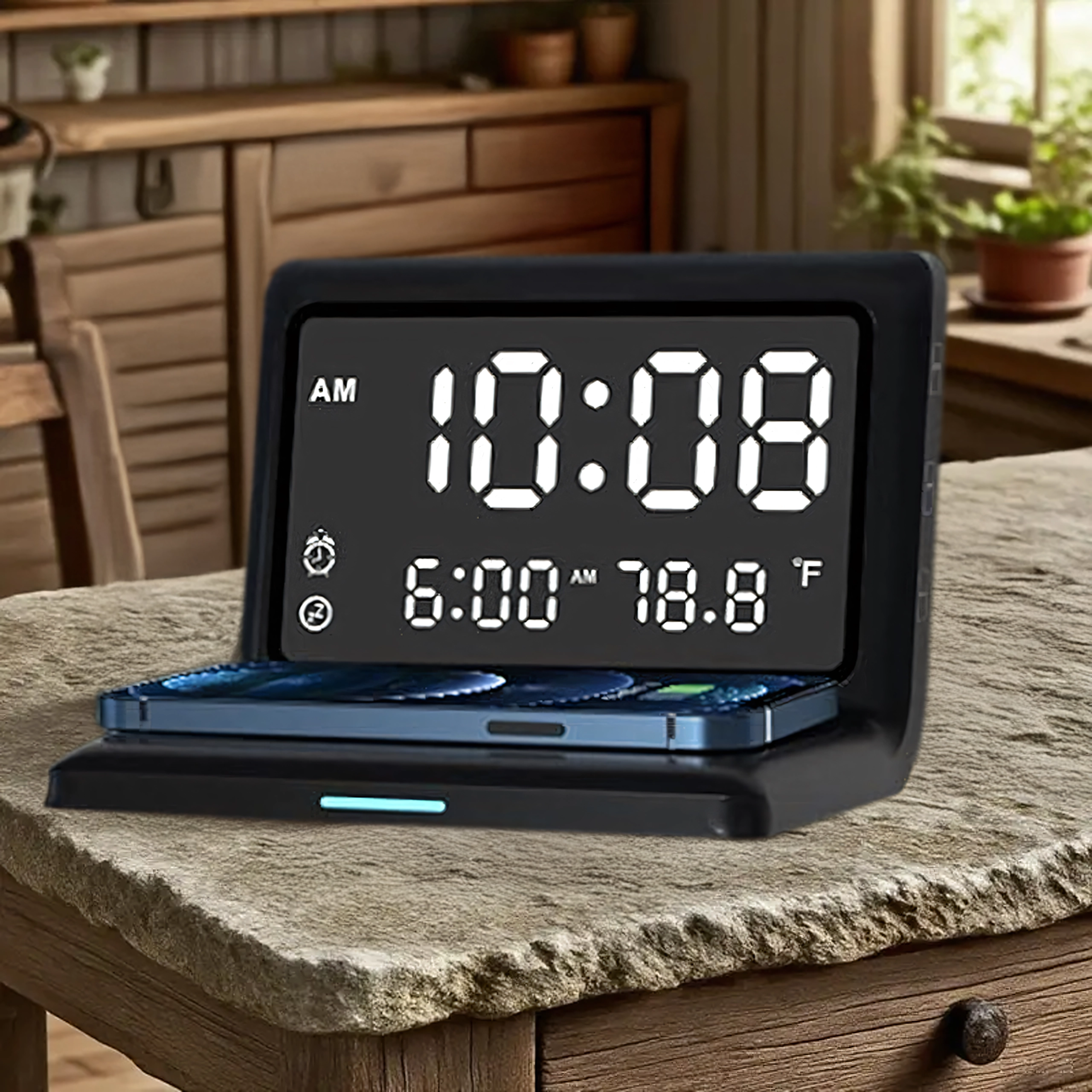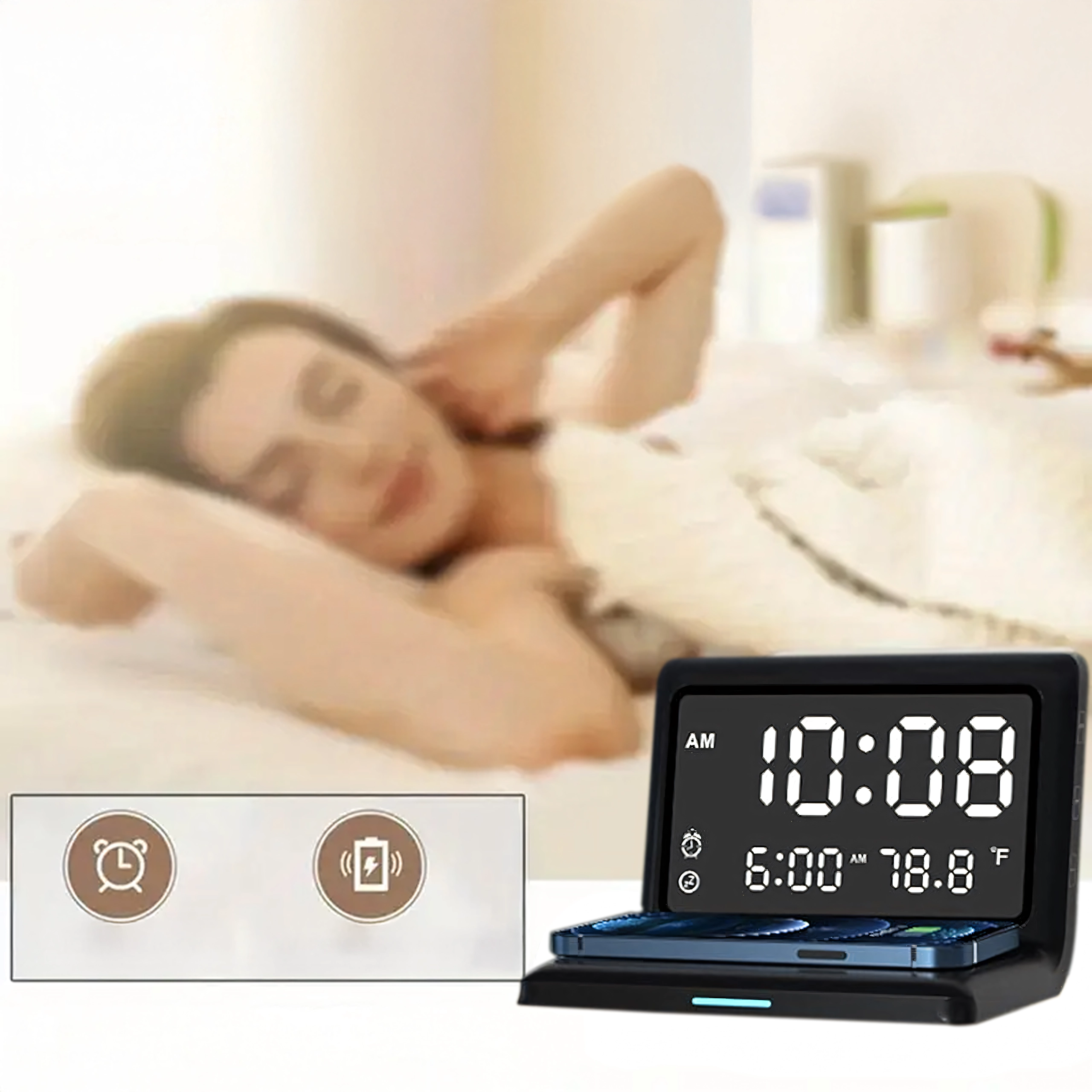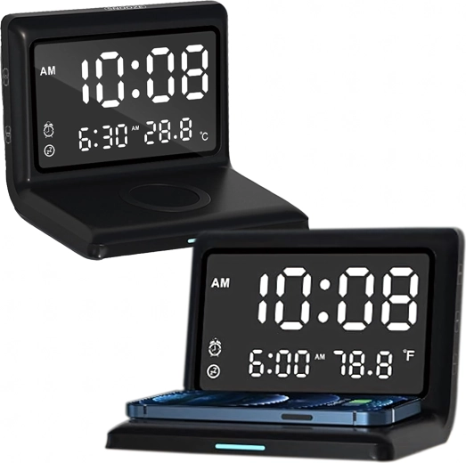 - Fonctions 3-en-1 : réveil, écran miroir, charge sans fil