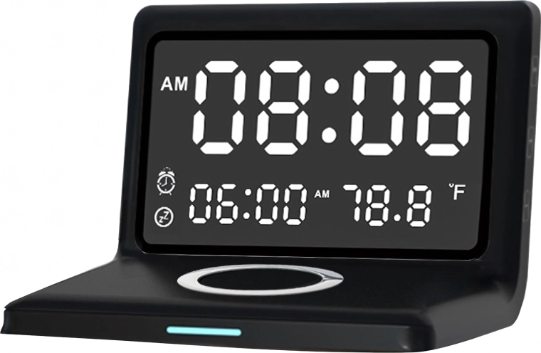 - Réveil, écran miroir, charge sans fil, thermomètre