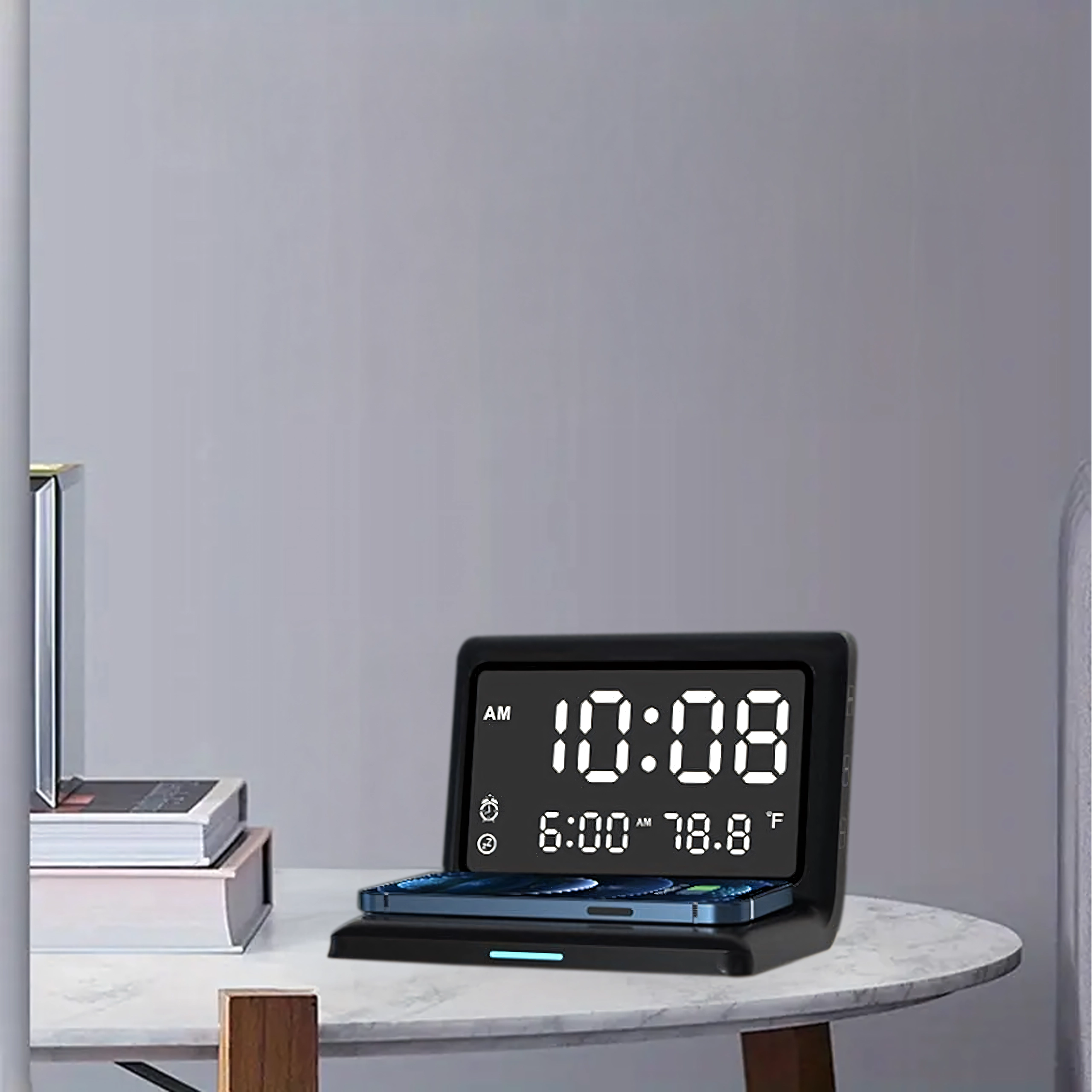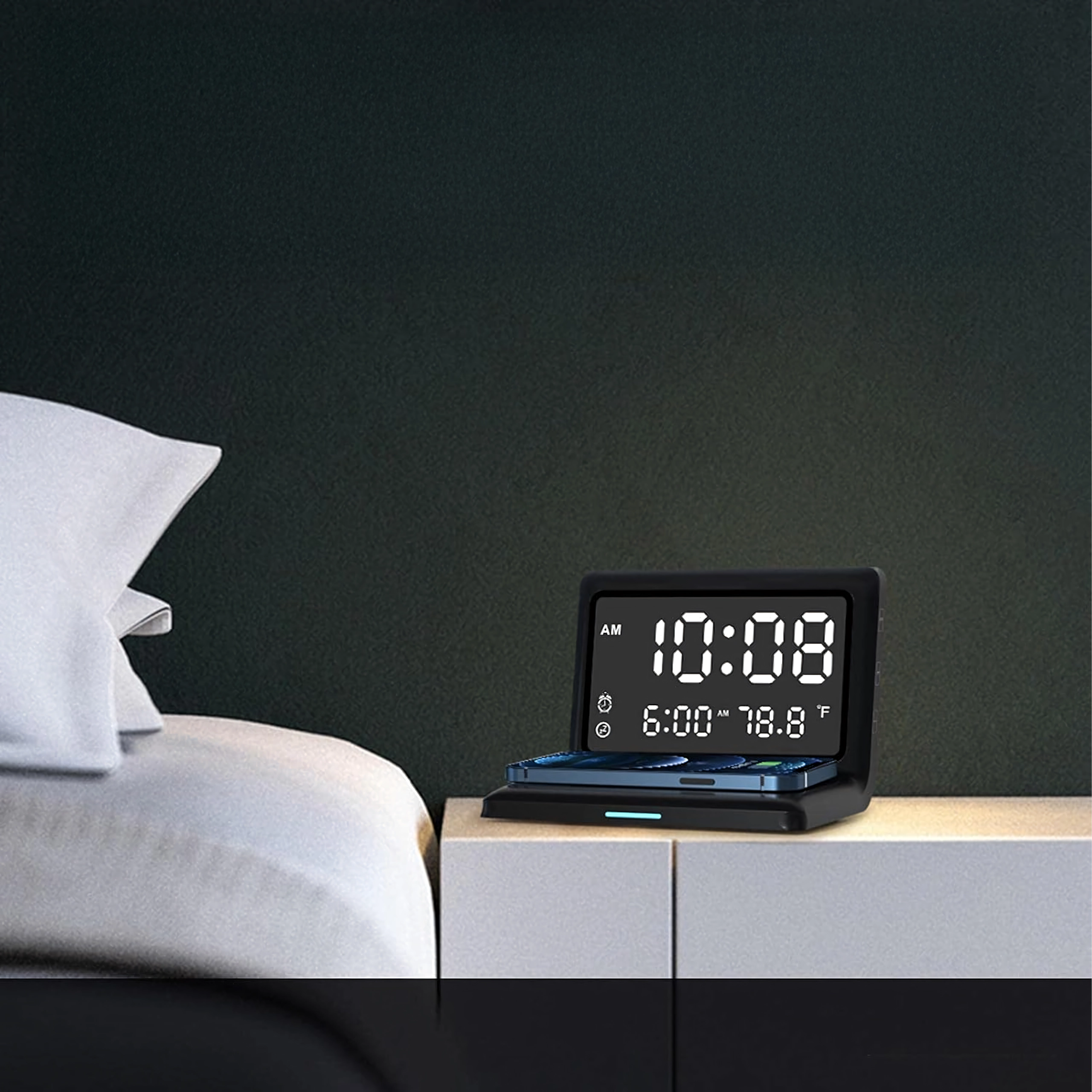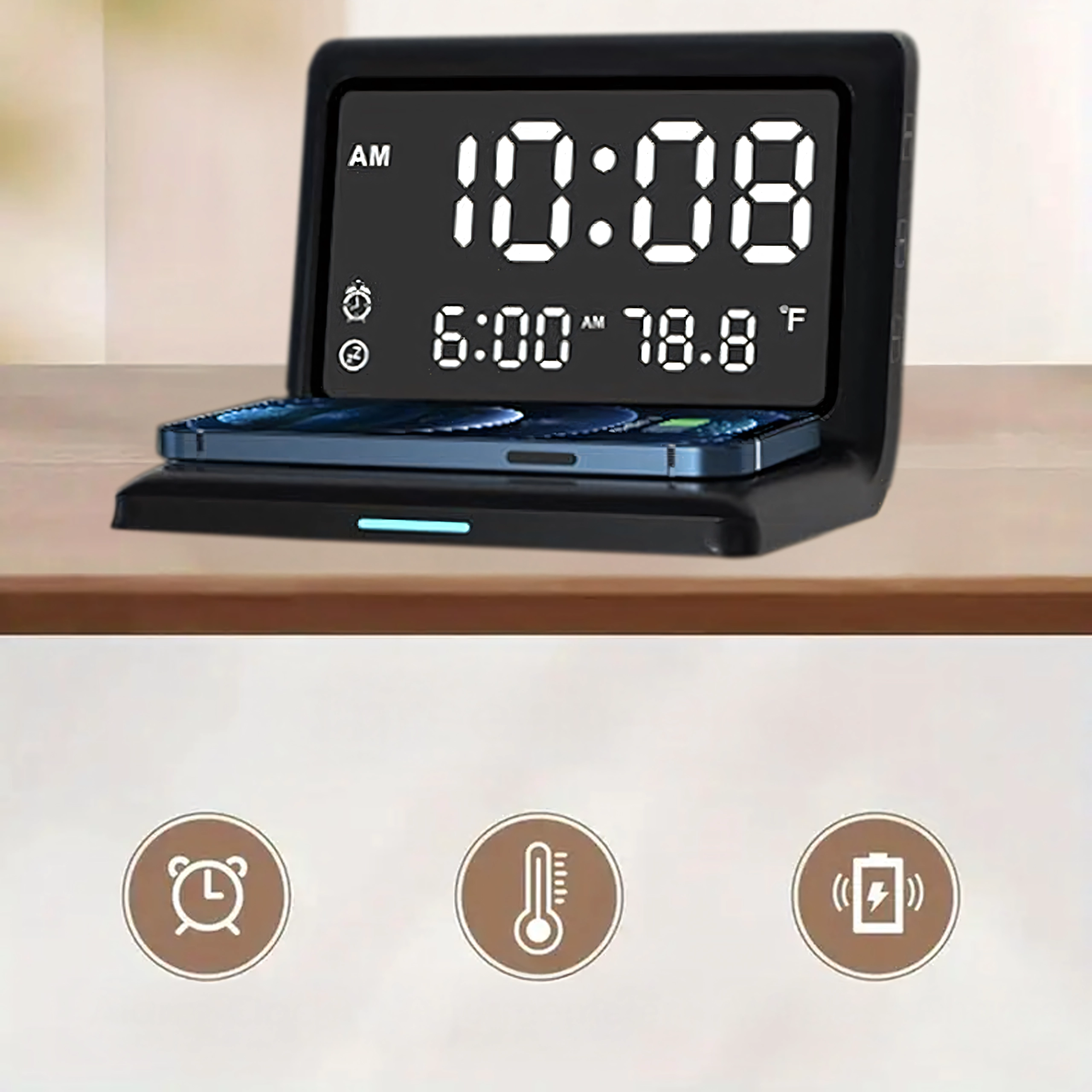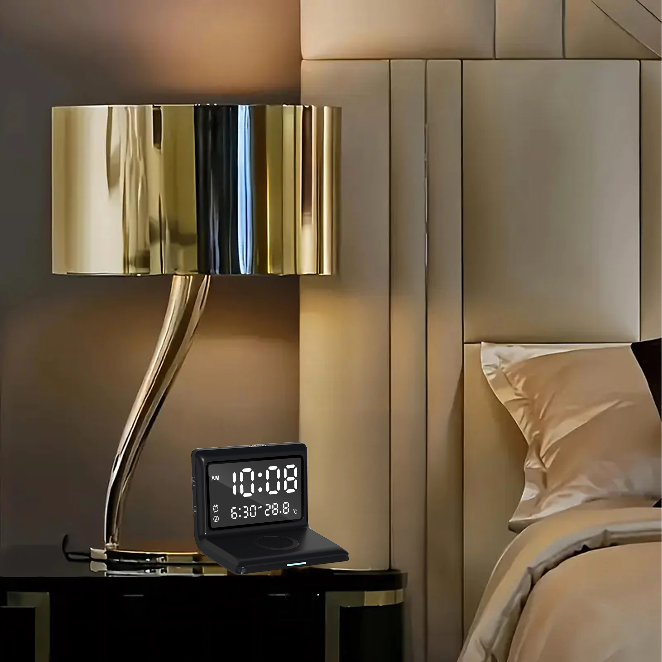 Réveil numérique 3-en-1 moderne avec charge sans fil 15 W et thermomètre intégré. Il combine réveil, écran miroir élégant et charge rapide du téléphone – idéal pour la maison, le bureau et les chambres d’hôtel.