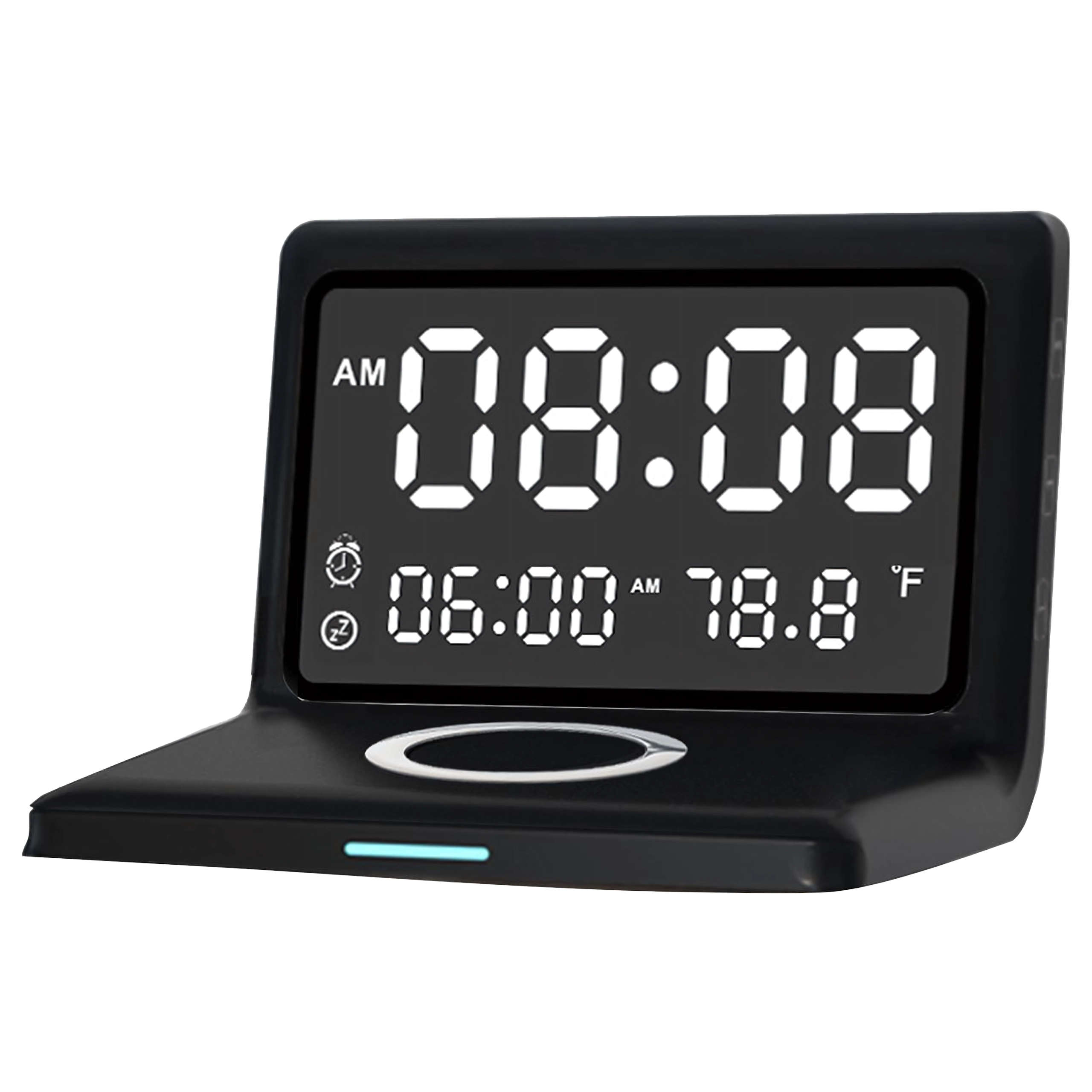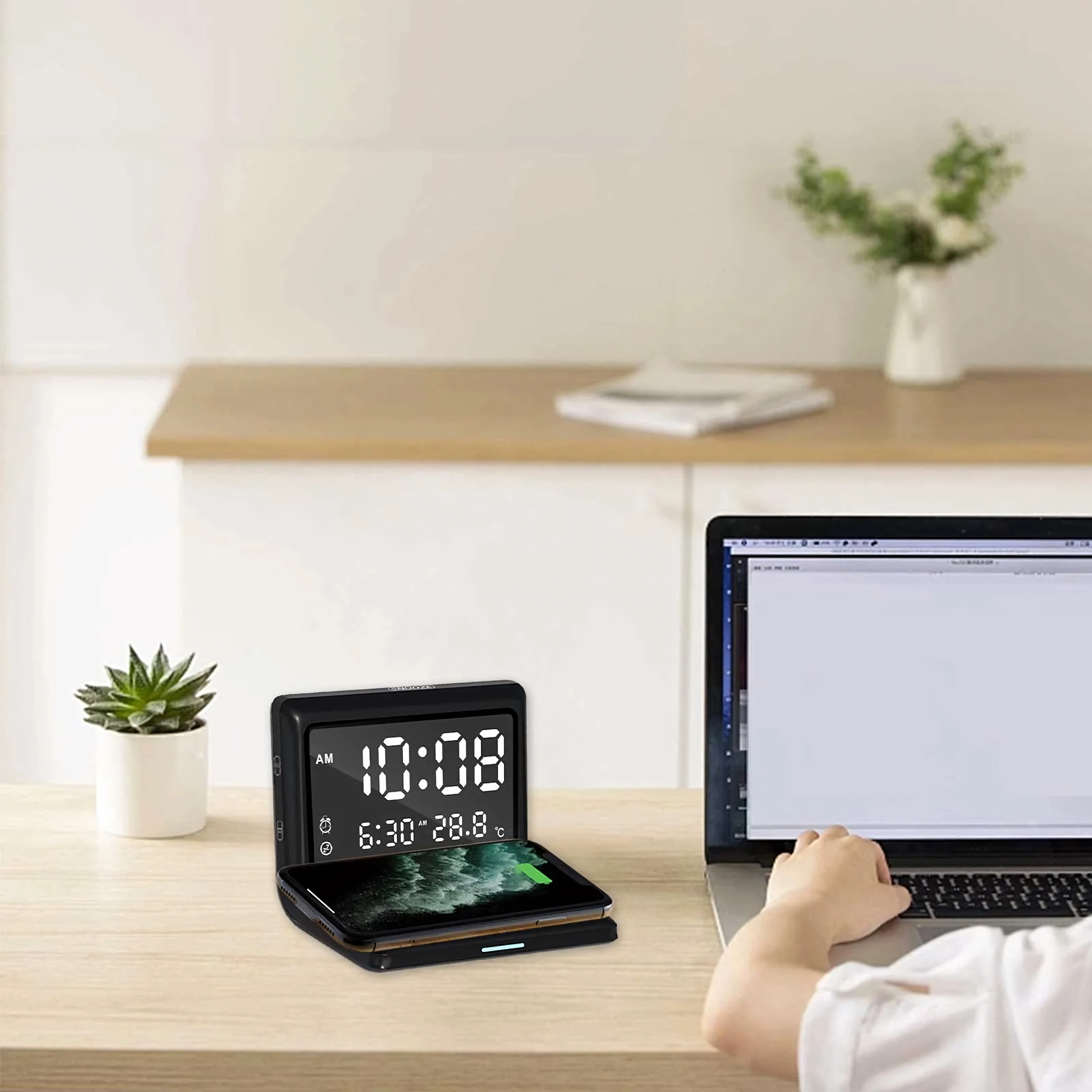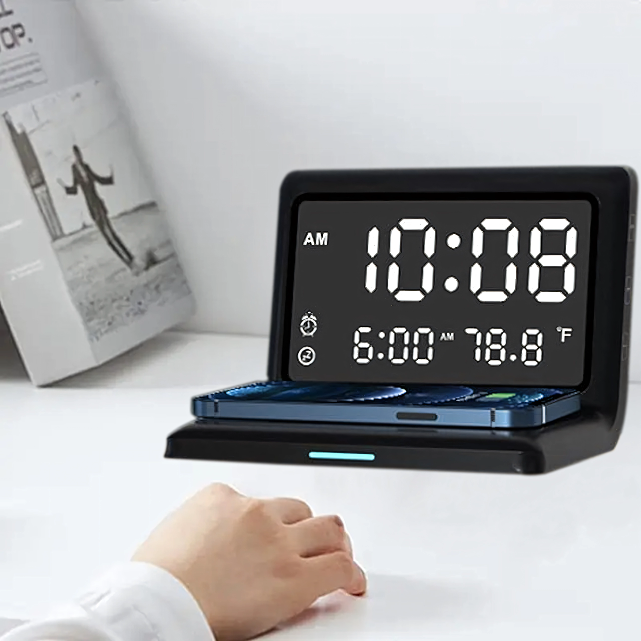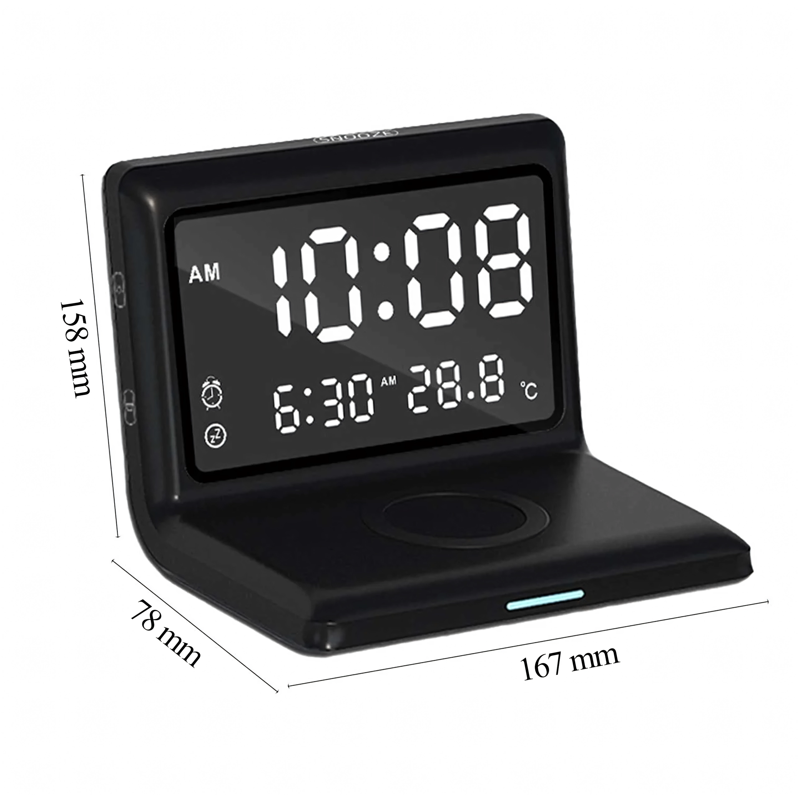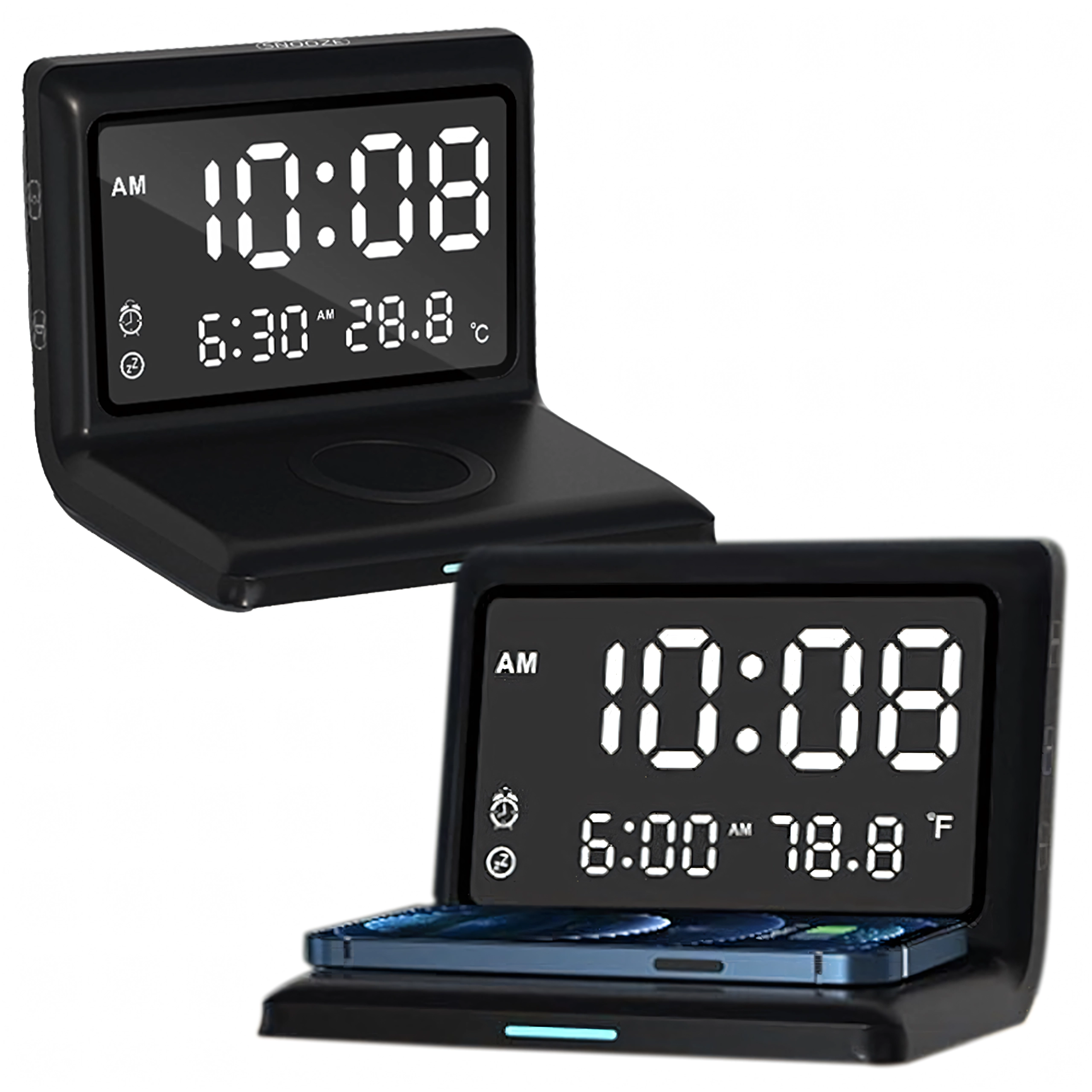 Réveil numérique 3-en-1 moderne avec charge sans fil 15 W et thermomètre intégré. Il combine réveil, écran miroir élégant et charge rapide du téléphone – idéal pour la maison, le bureau et les chambres d’hôtel.