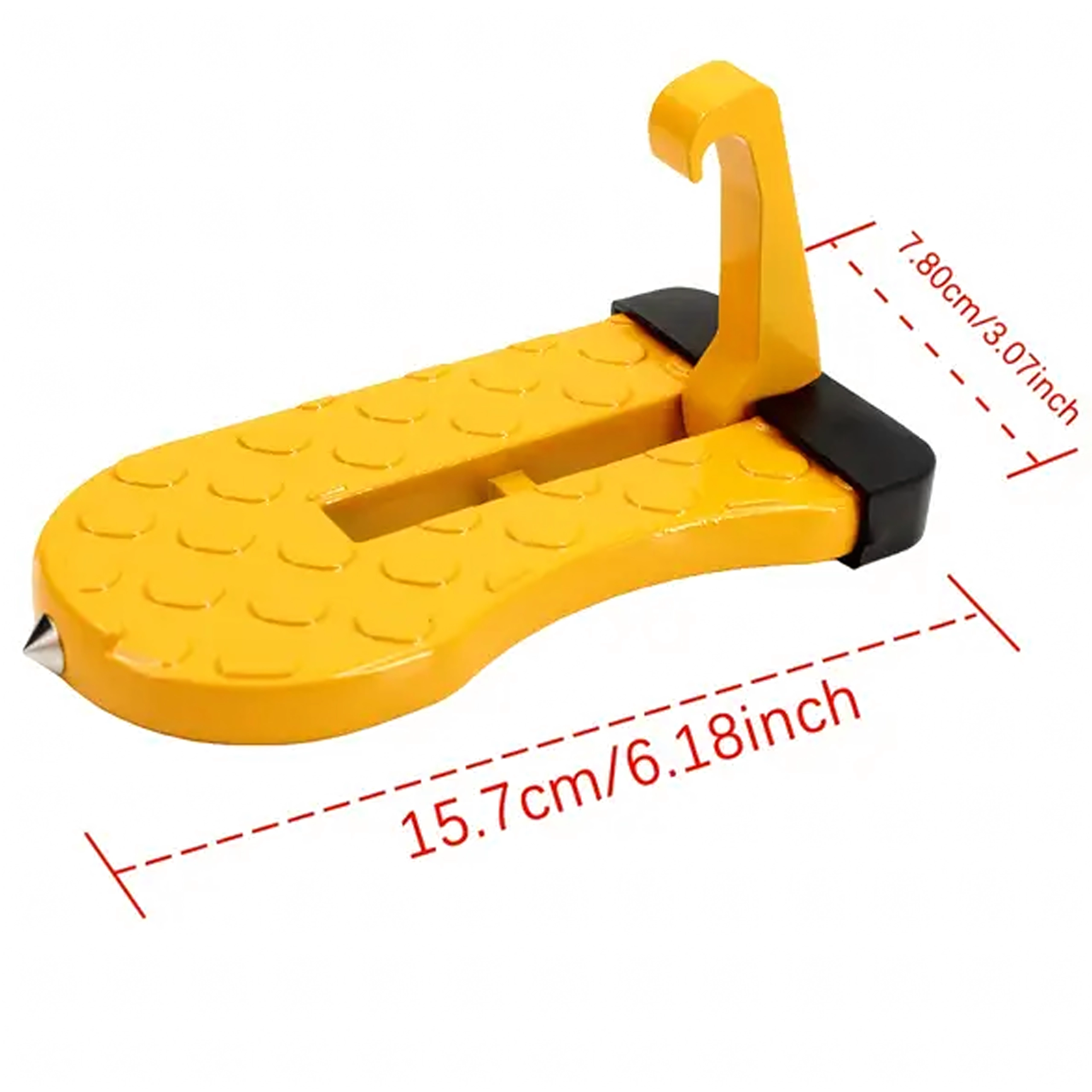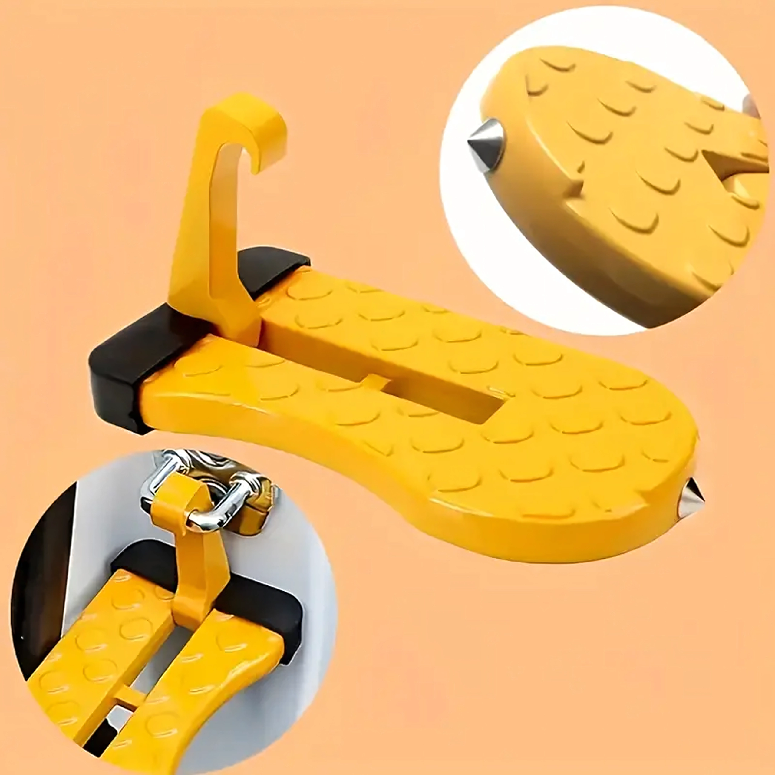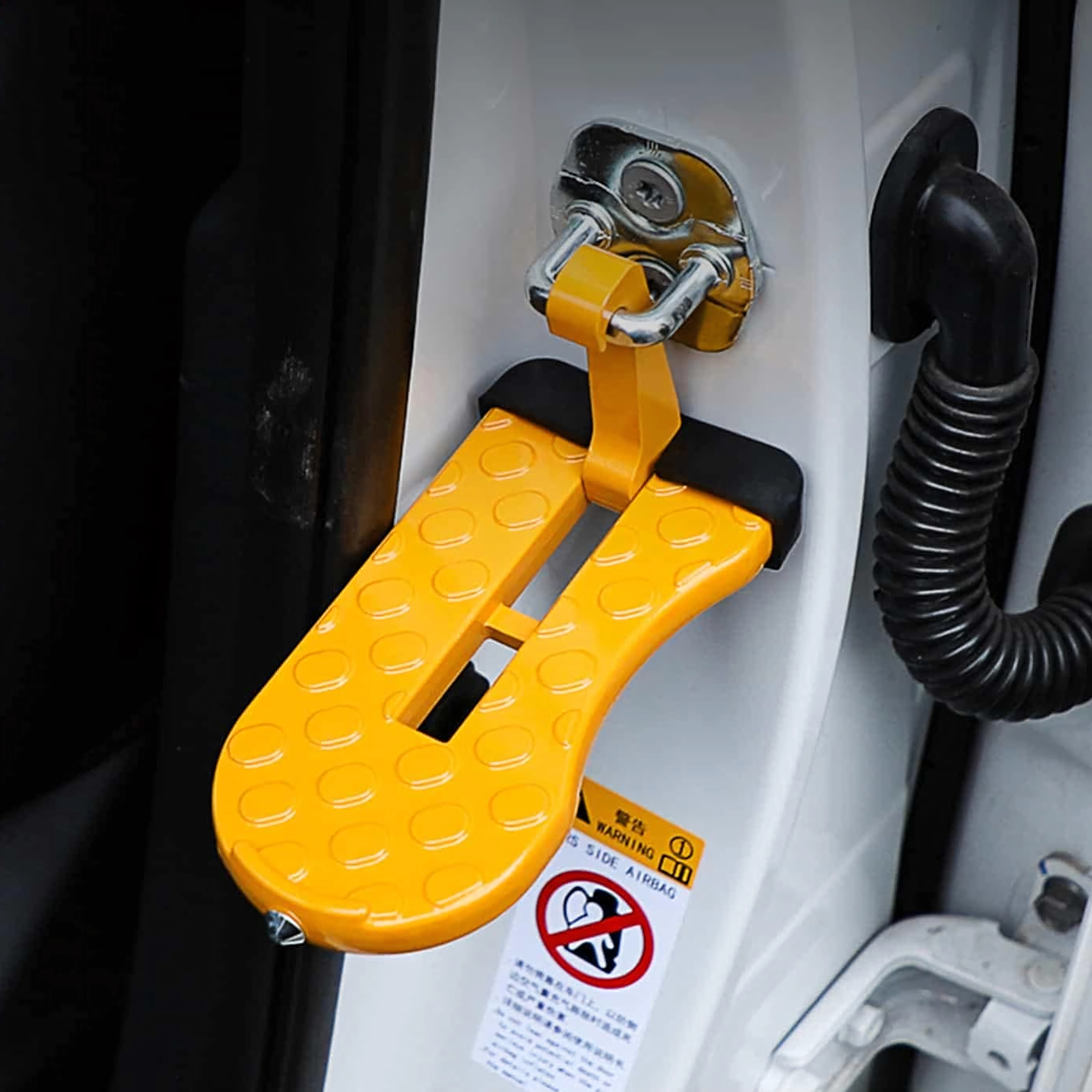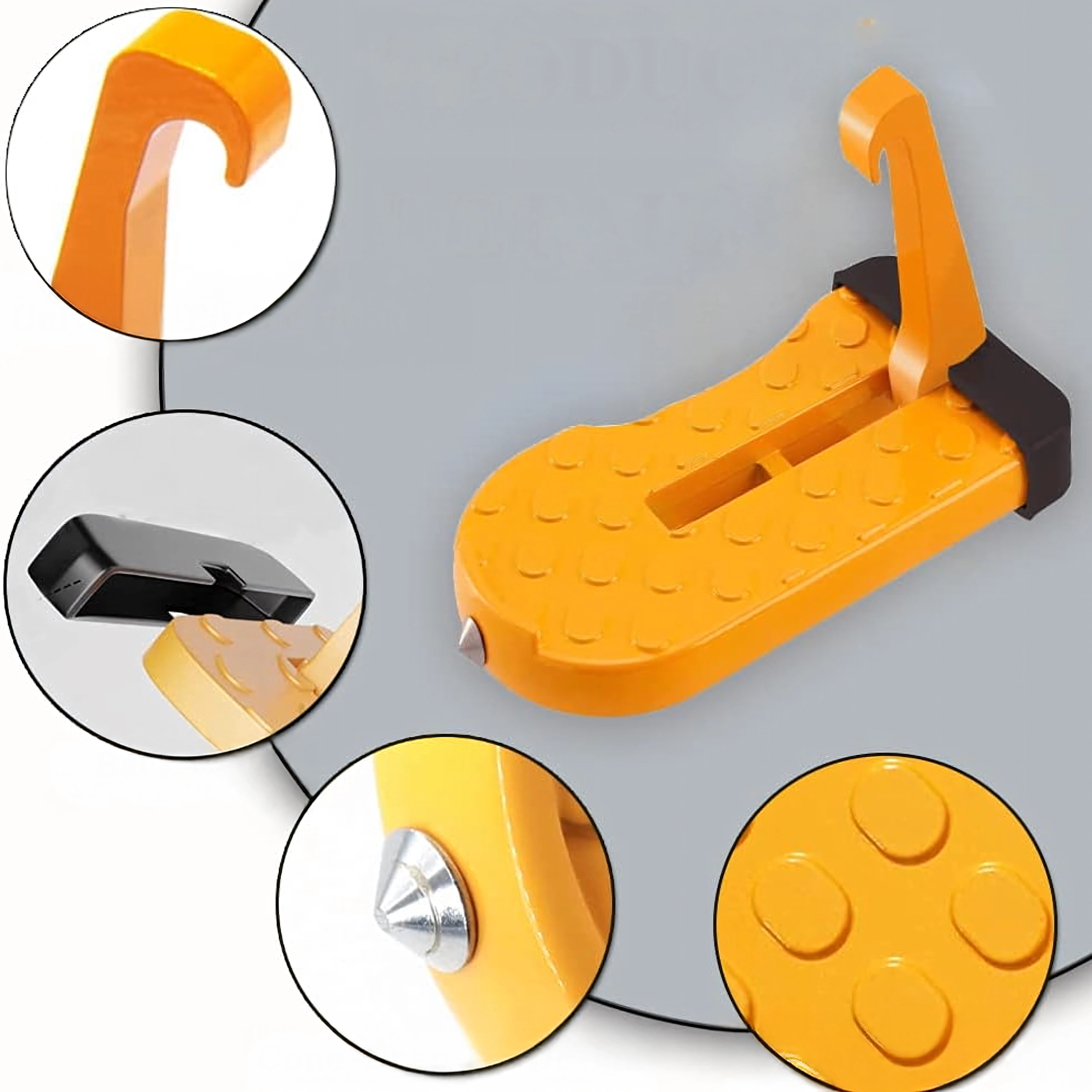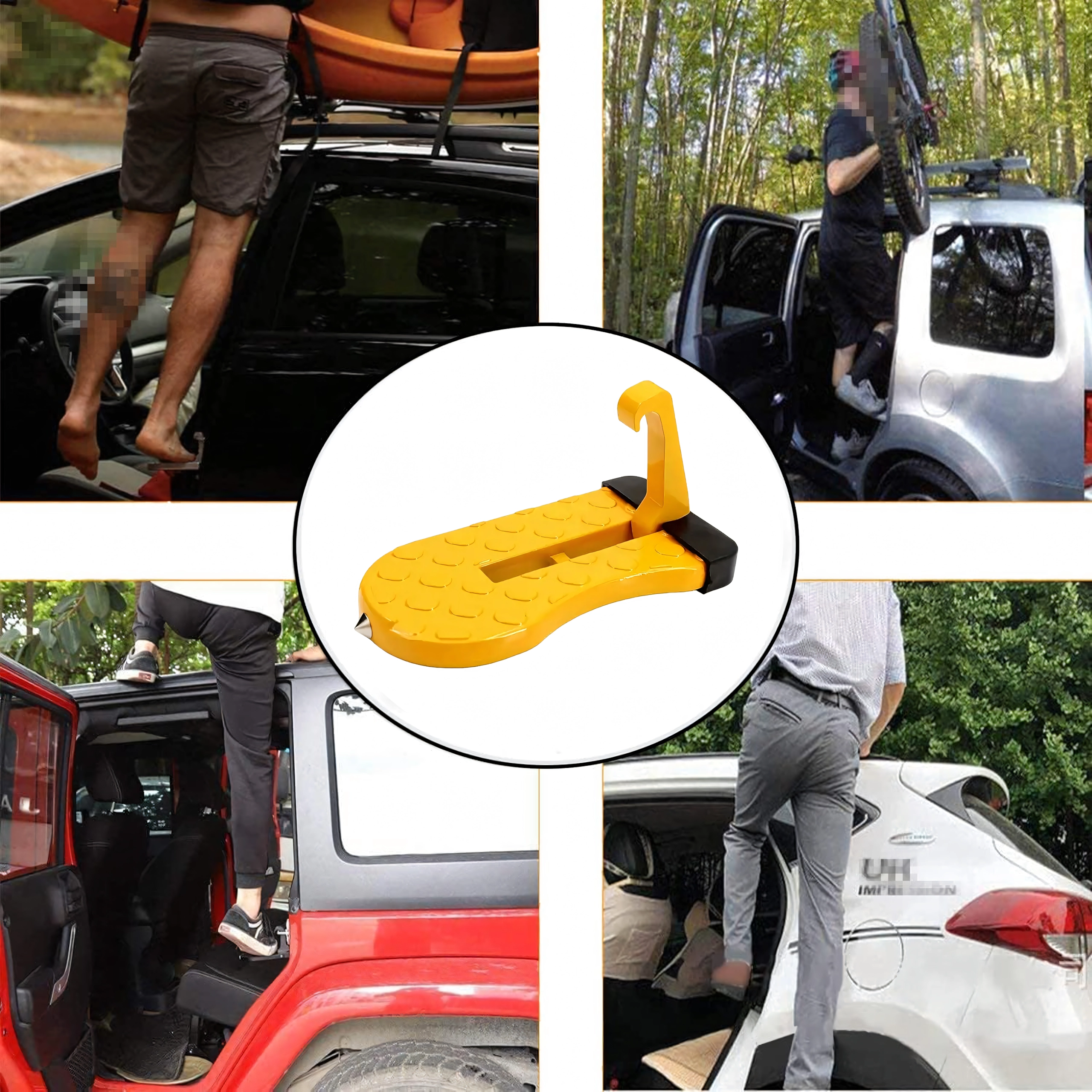 Marchepied pratique et résistant pour porte de voiture, qui facilite l’accès au toit du véhicule – idéal pour les coffres de toit, porte-charges et le nettoyage du véhicule. Il est léger, pliable, en aluminium et antidérapant, et peut également servir de marteau brise-vitre d’urgence.