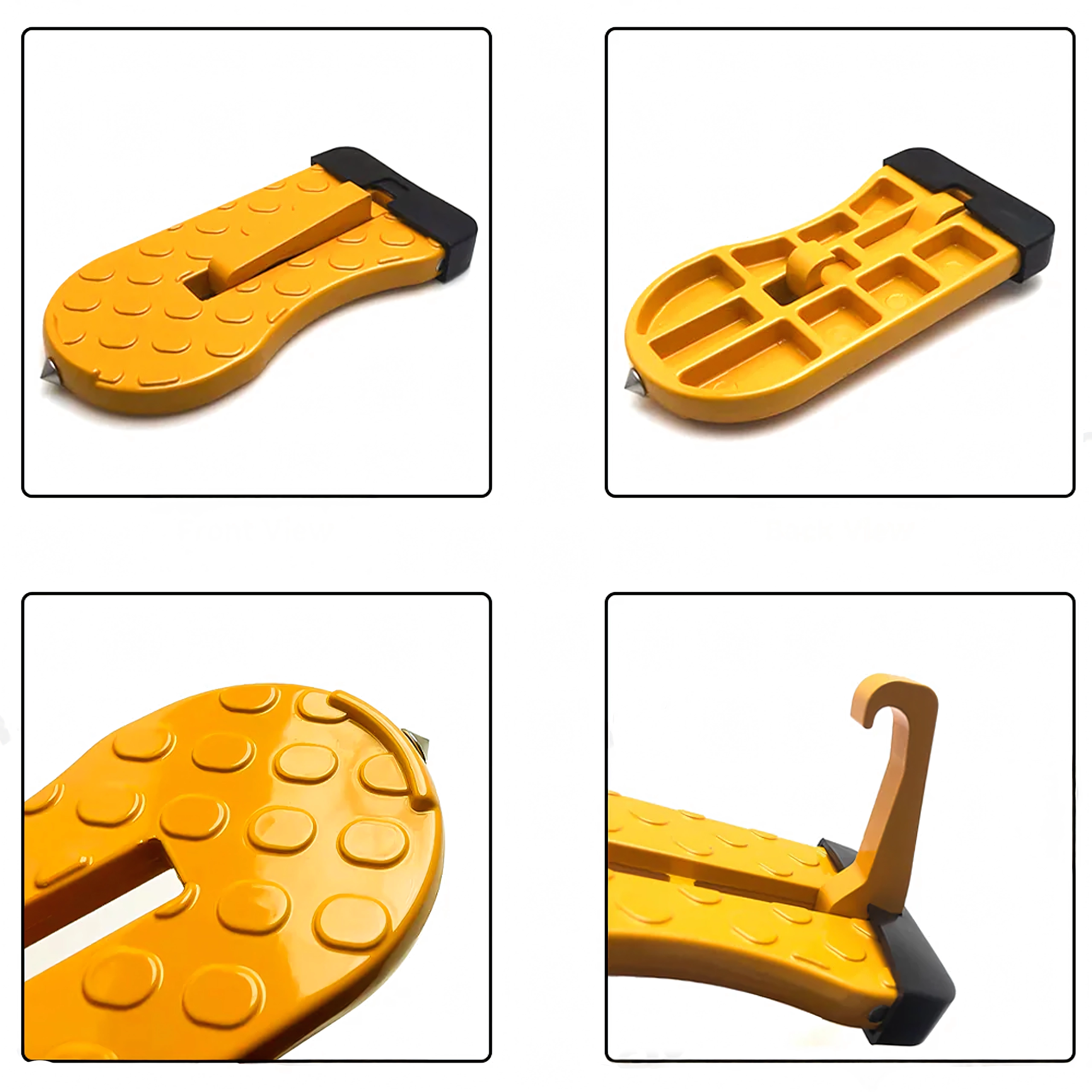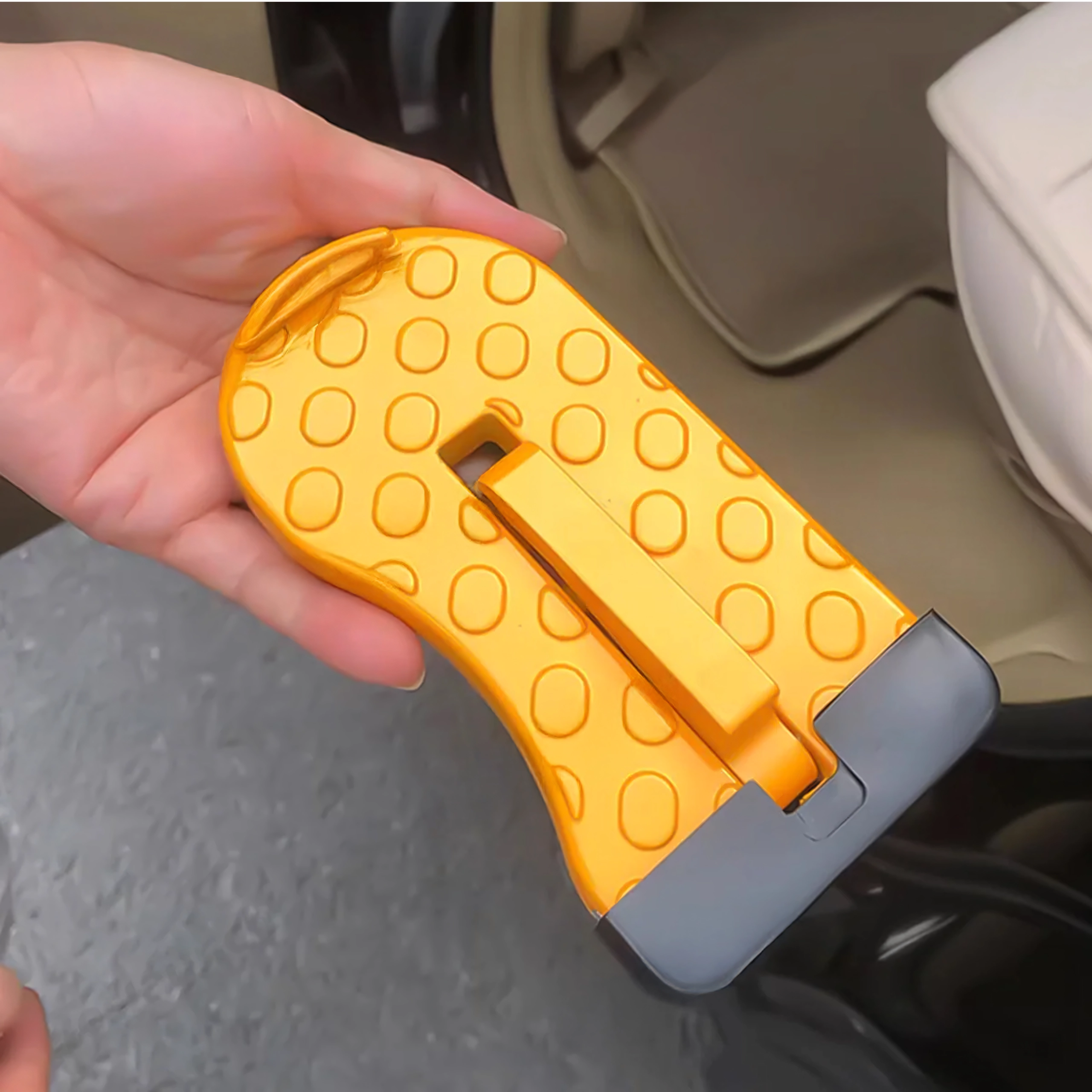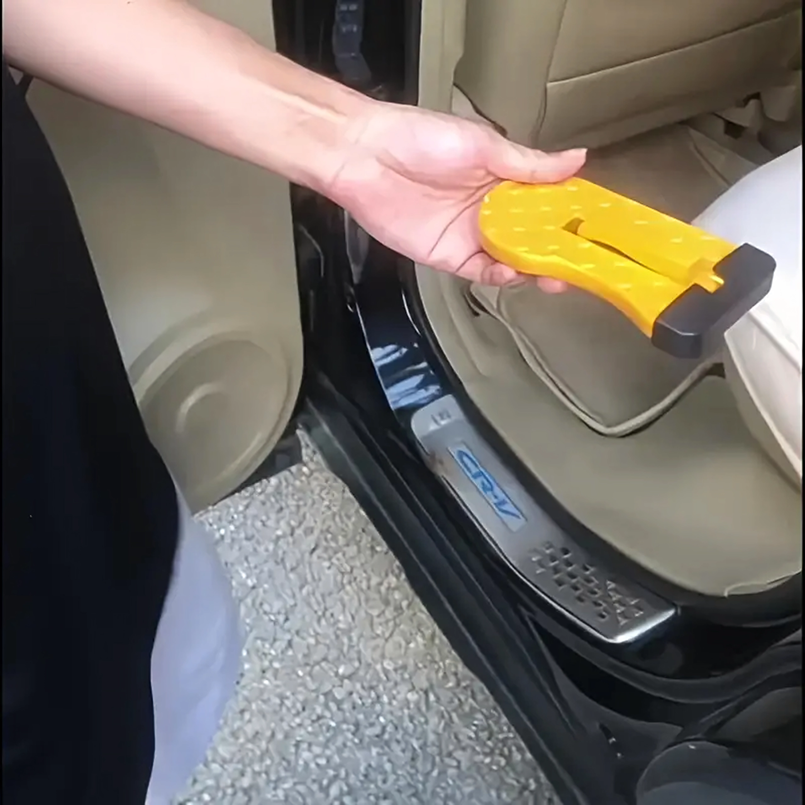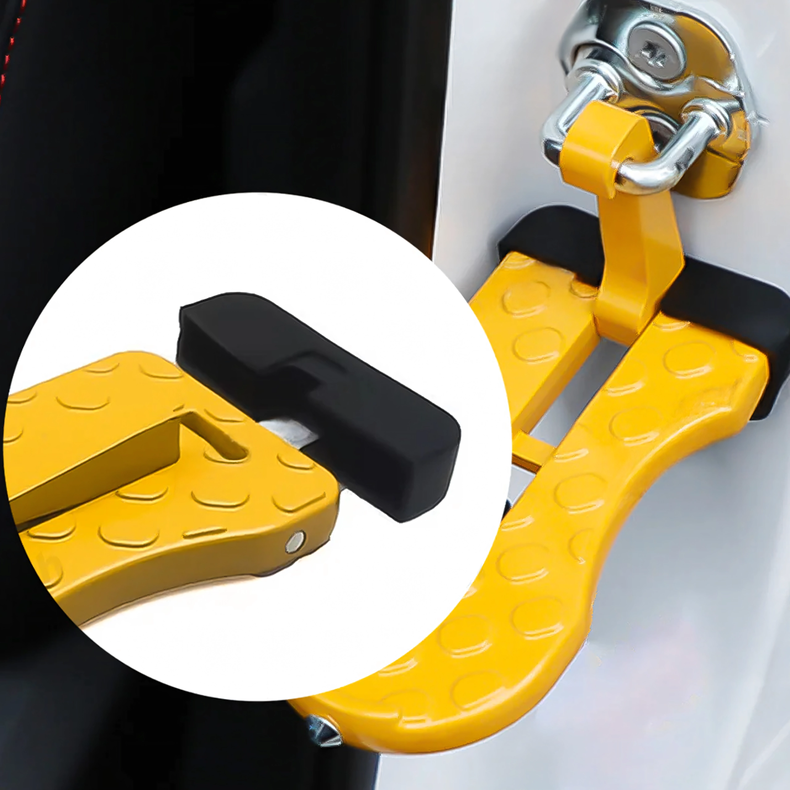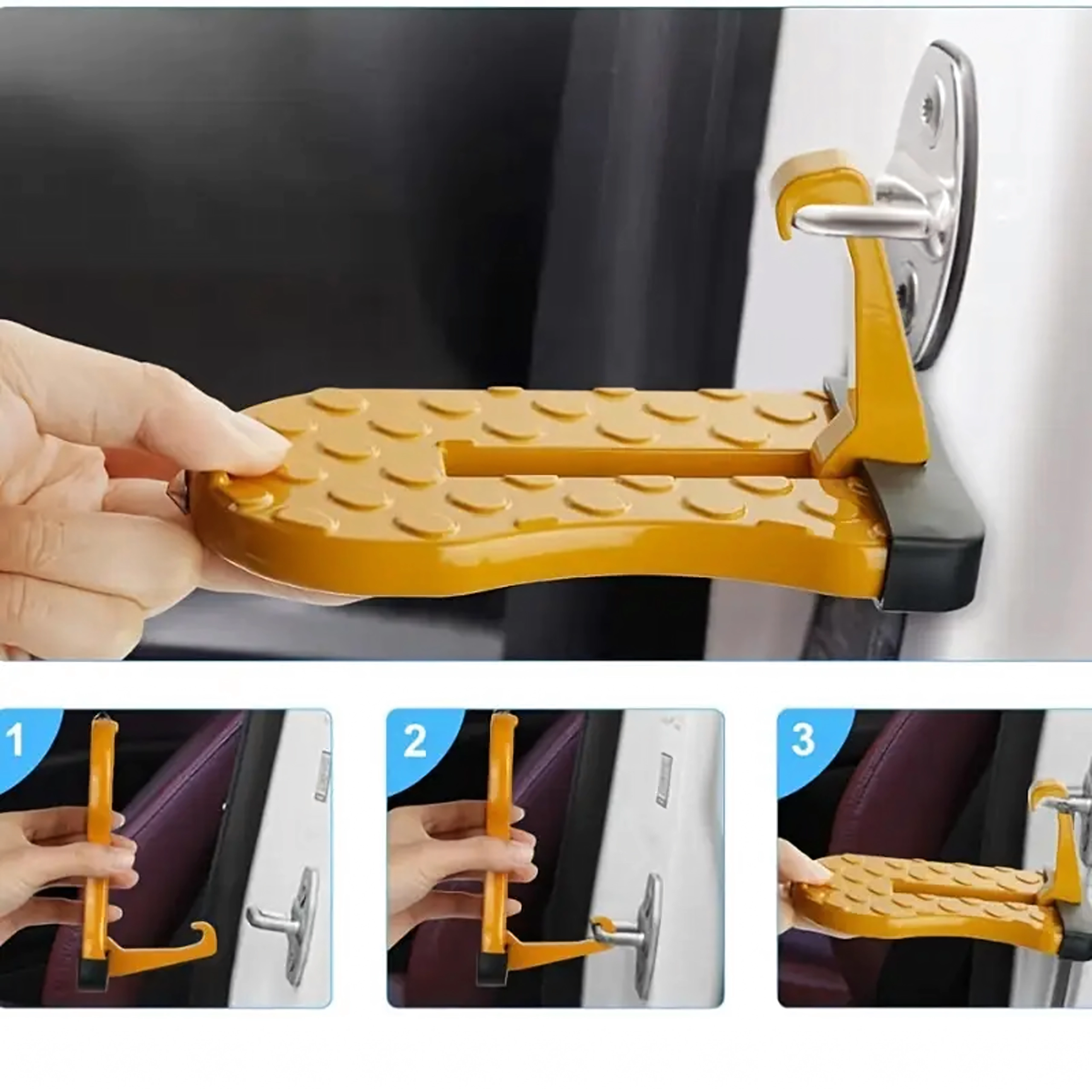 Marchepied pratique et résistant pour porte de voiture, qui facilite l’accès au toit du véhicule – idéal pour les coffres de toit, porte-charges et le nettoyage du véhicule. Il est léger, pliable, en aluminium et antidérapant, et peut également servir de marteau brise-vitre d’urgence.