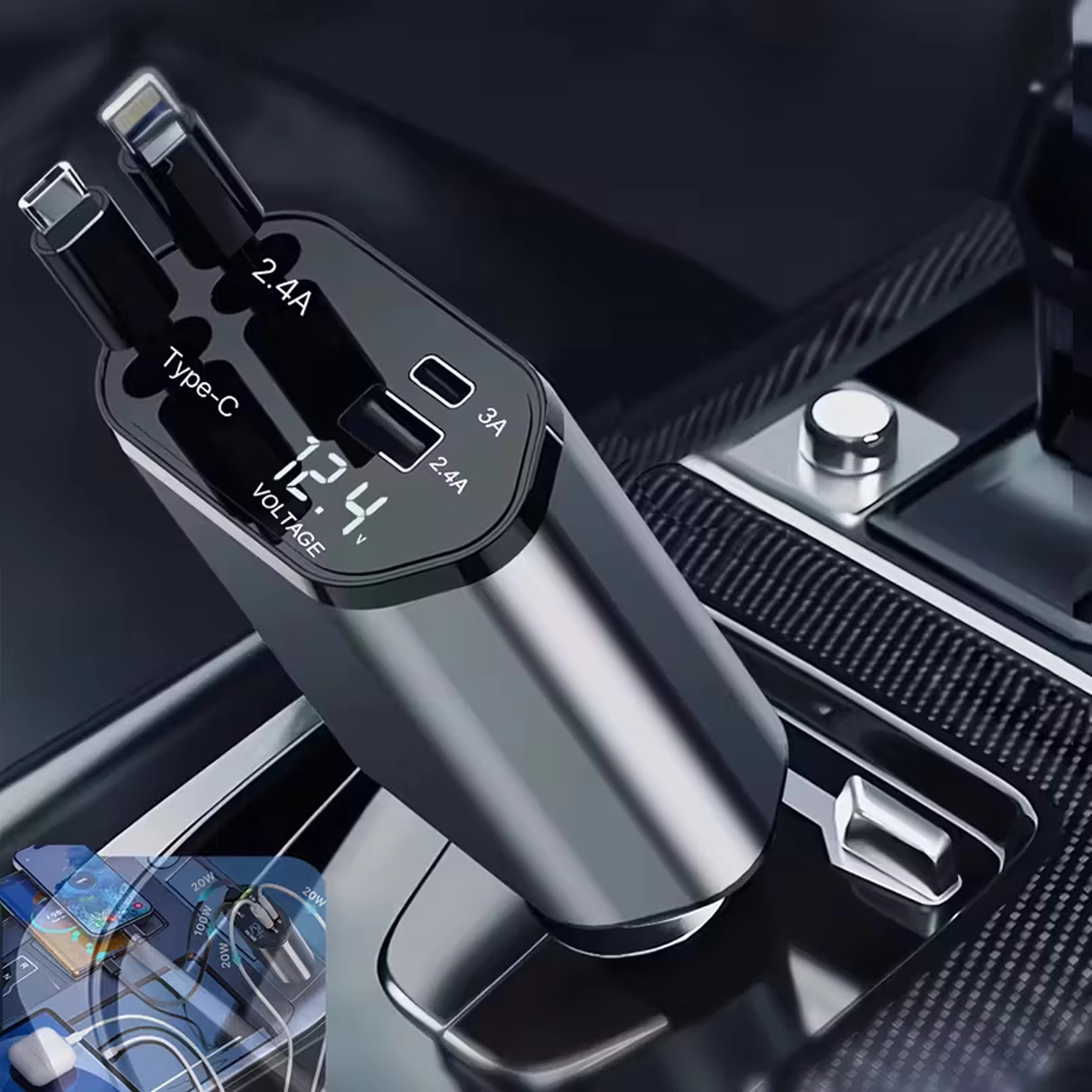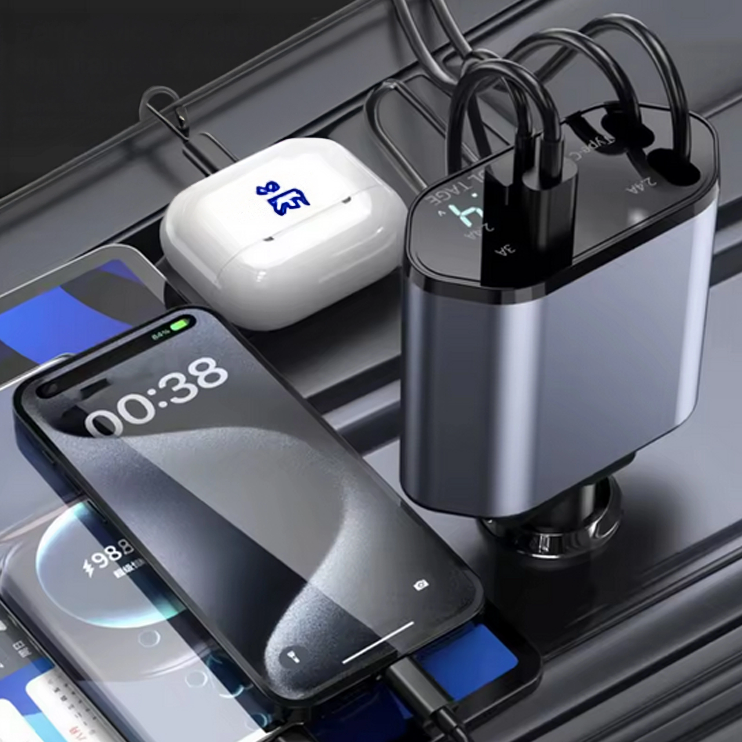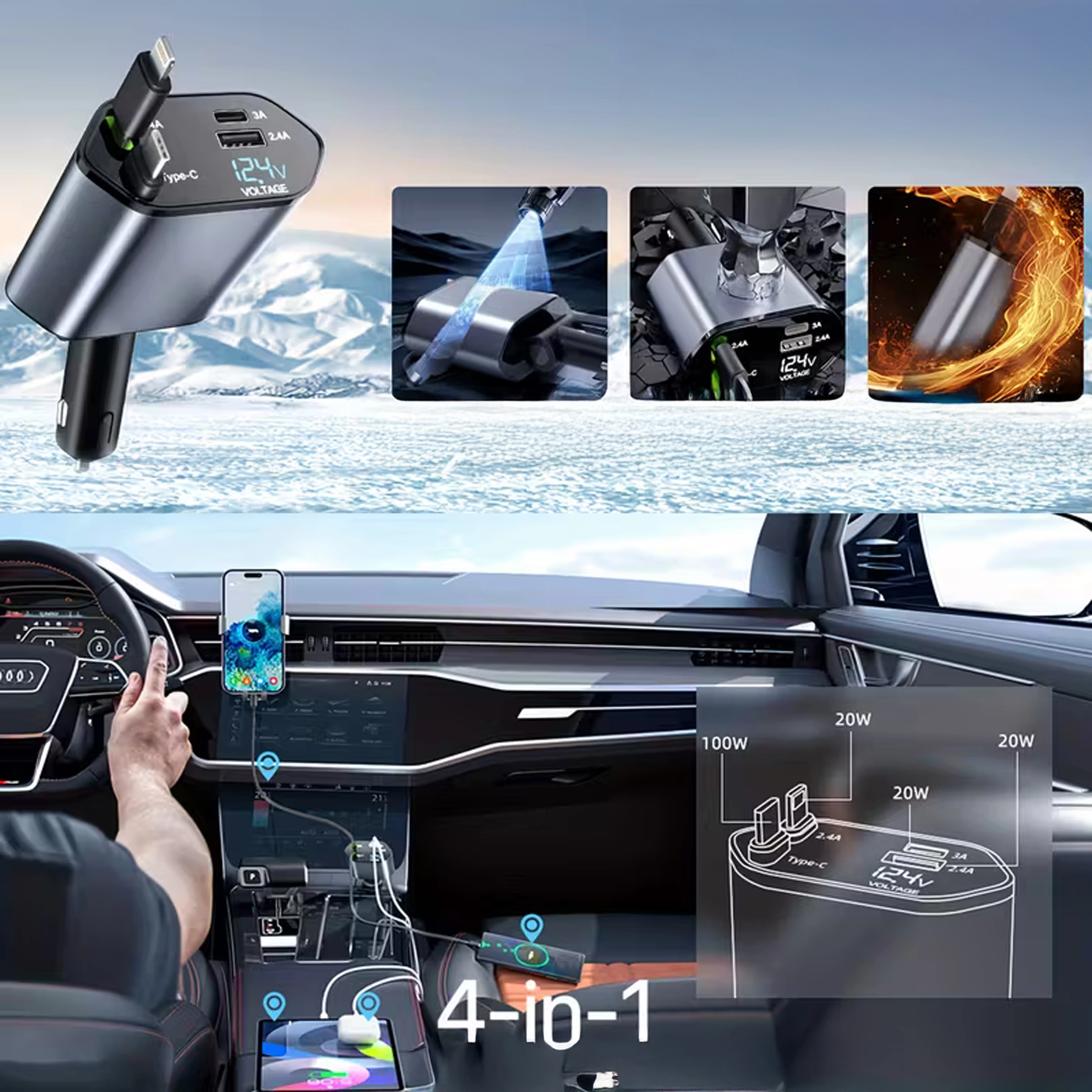 Ce chargeur auto 4‑en‑1 moderne allie haute performance et praticité. La charge rapide 100 W alimente même les appareils les plus exigeants, tandis que la puce intelligente protège contre les surtensions, la surchauffe et les courts‑circuits. Grâce aux câbles enroulables, l’habitacle reste net et les câbles toujours à la longueur idéale.