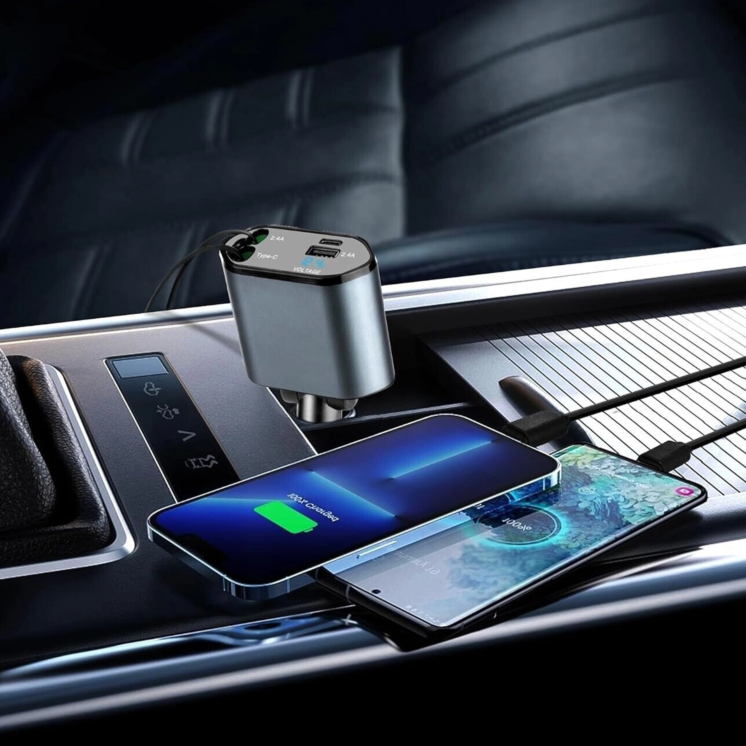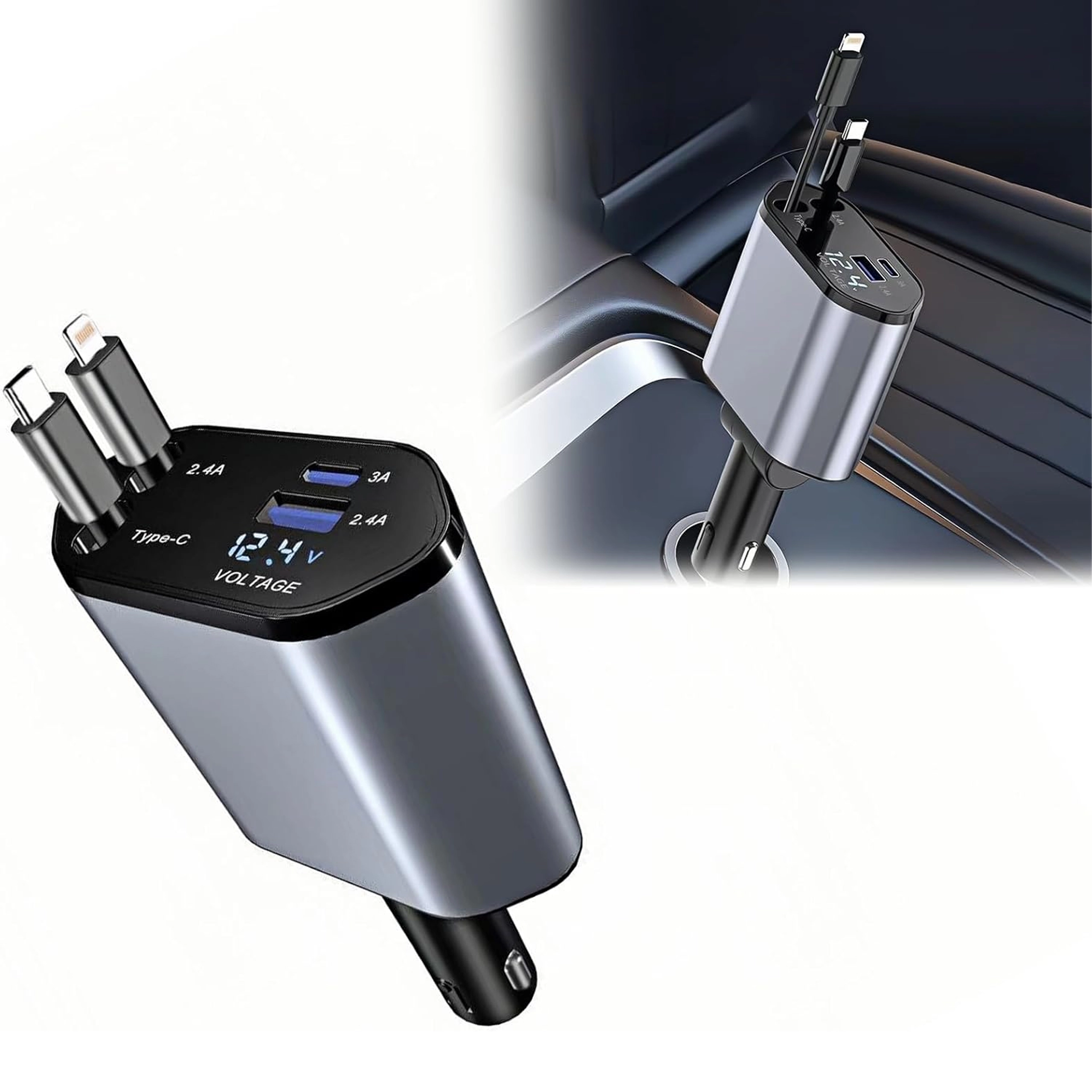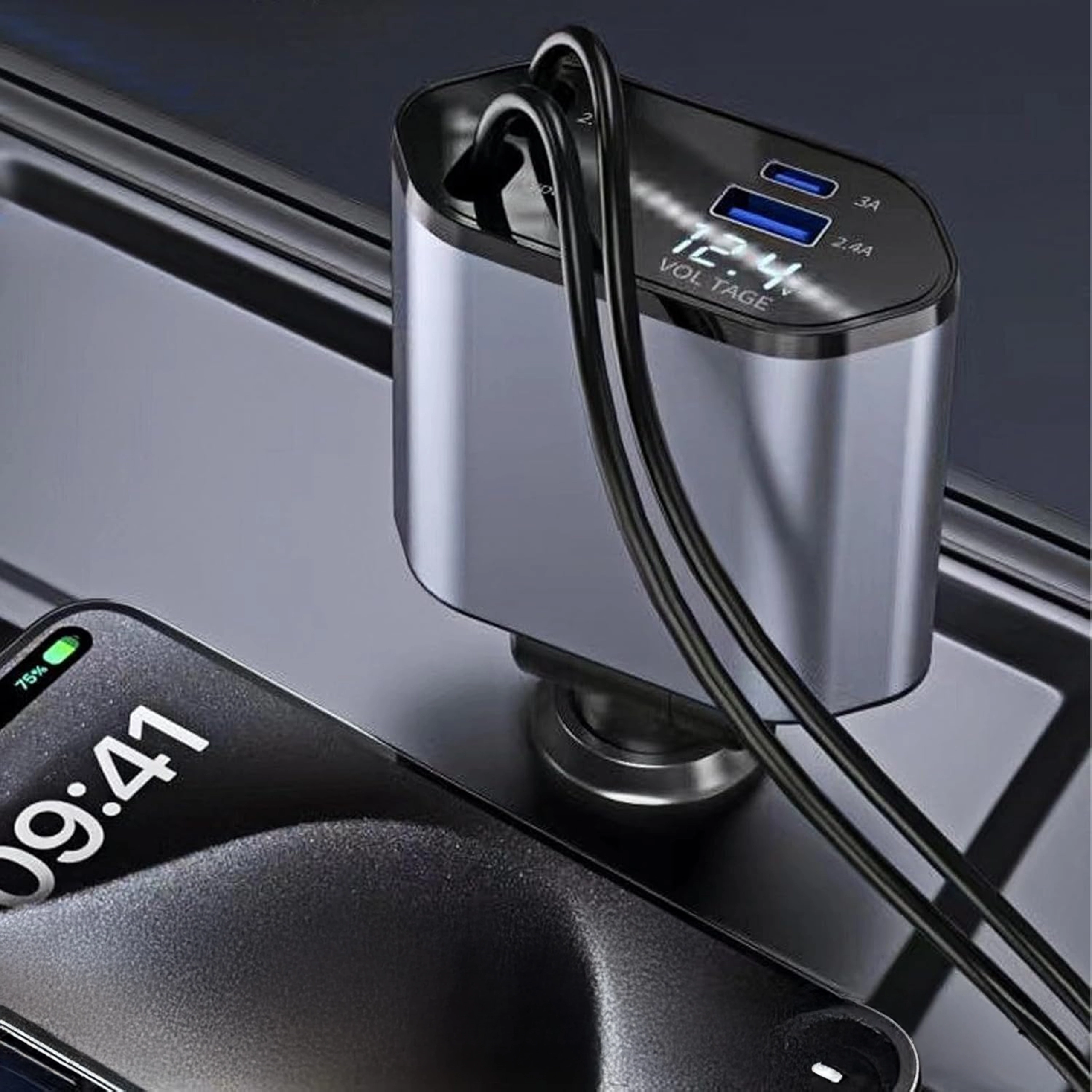 Ce chargeur auto 4‑en‑1 moderne allie haute performance et praticité. La charge rapide 100 W alimente même les appareils les plus exigeants, tandis que la puce intelligente protège contre les surtensions, la surchauffe et les courts‑circuits. Grâce aux câbles enroulables, l’habitacle reste net et les câbles toujours à la longueur idéale.
