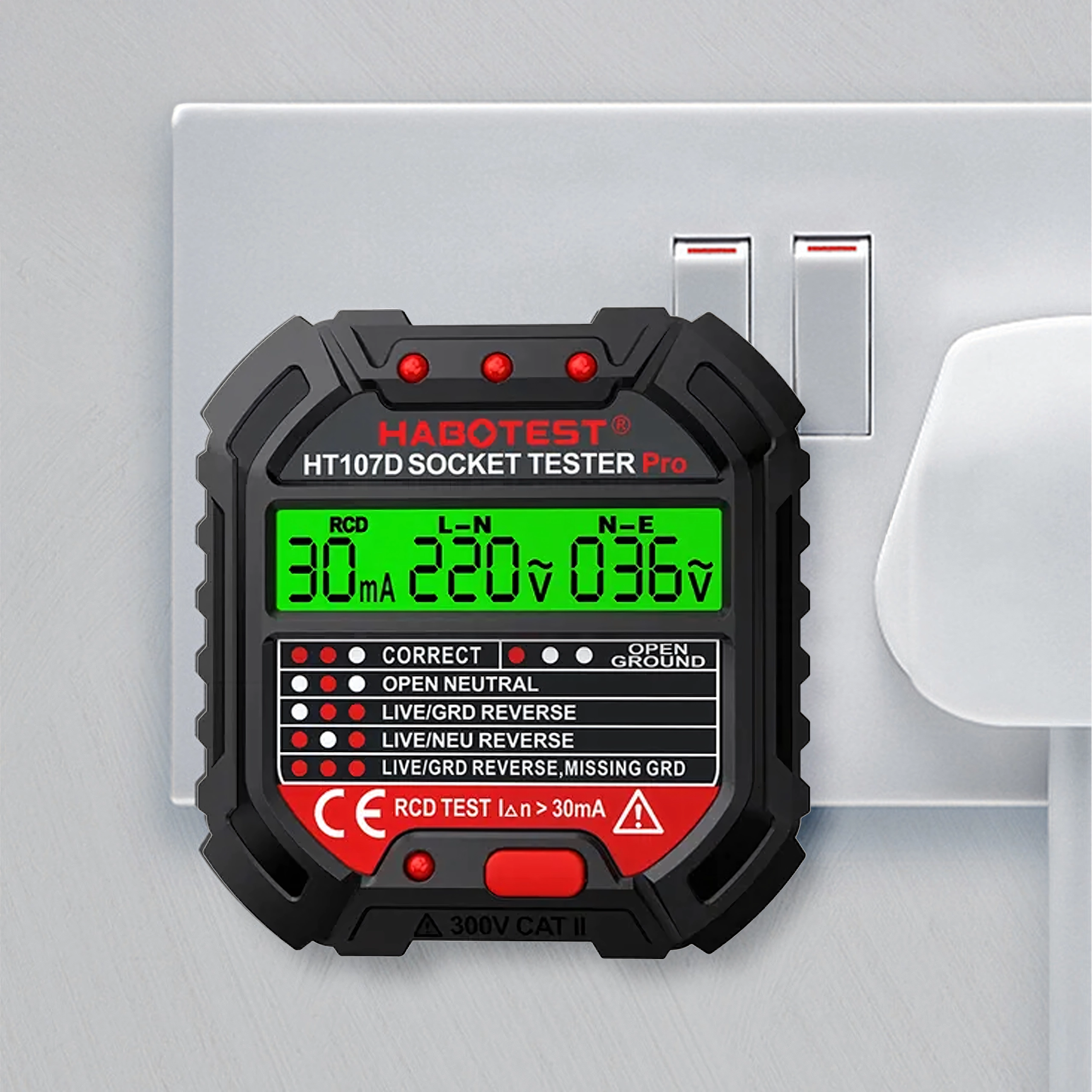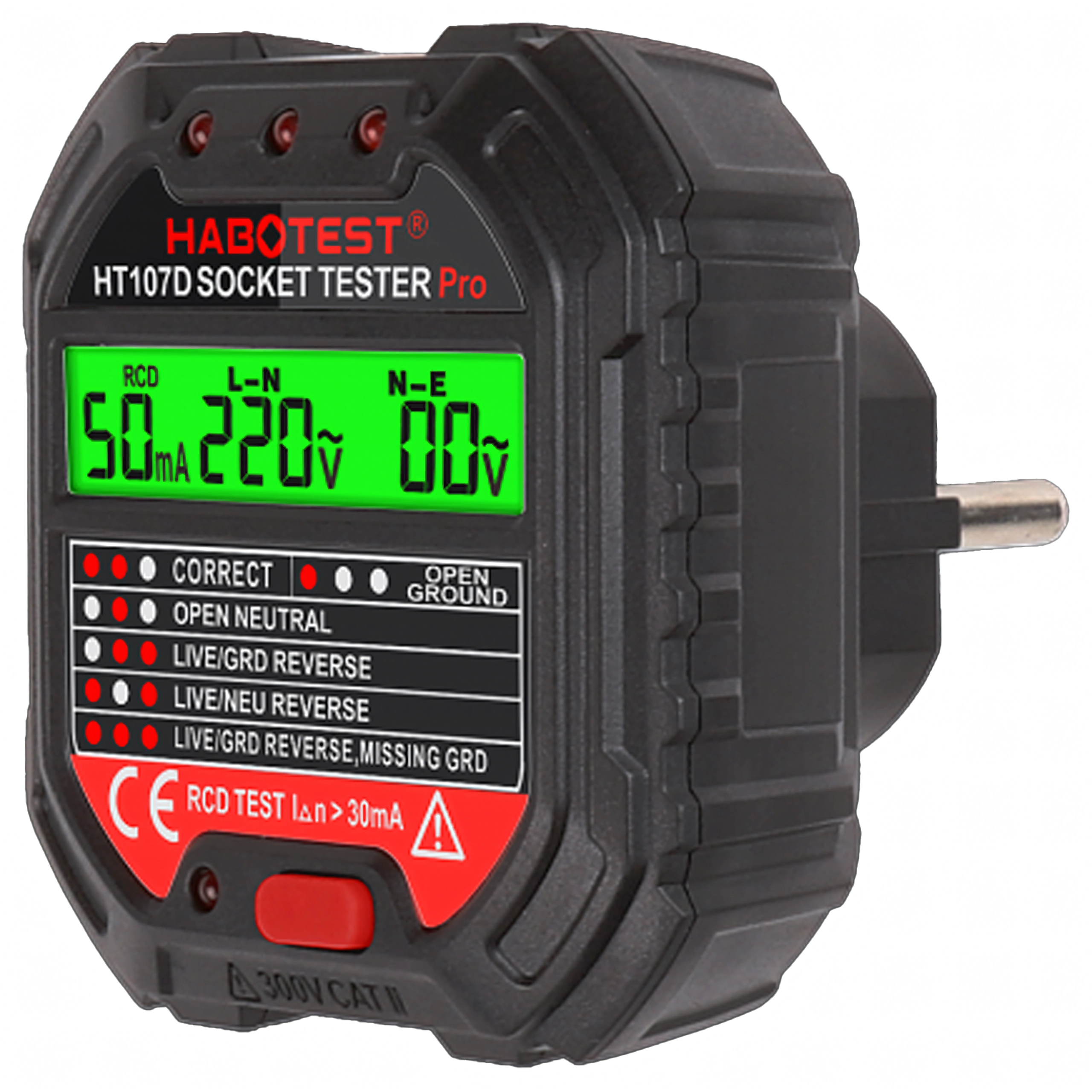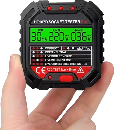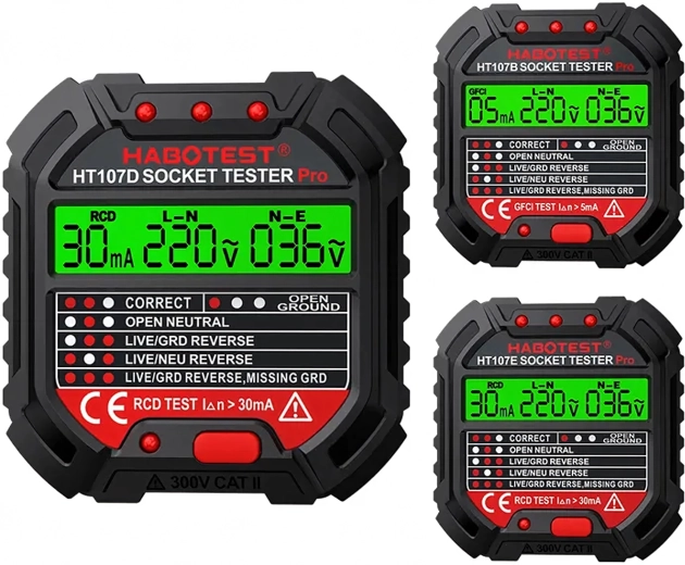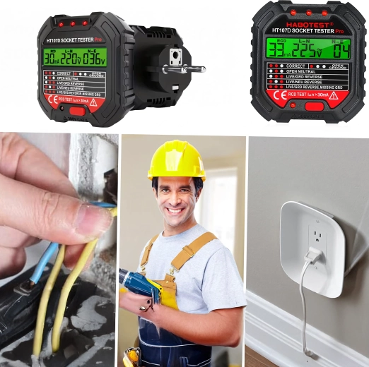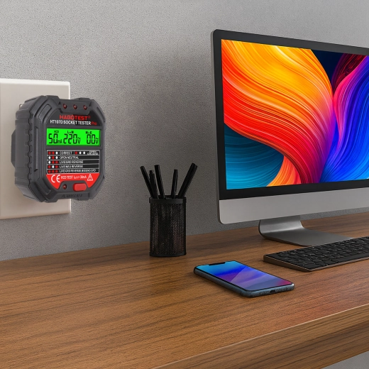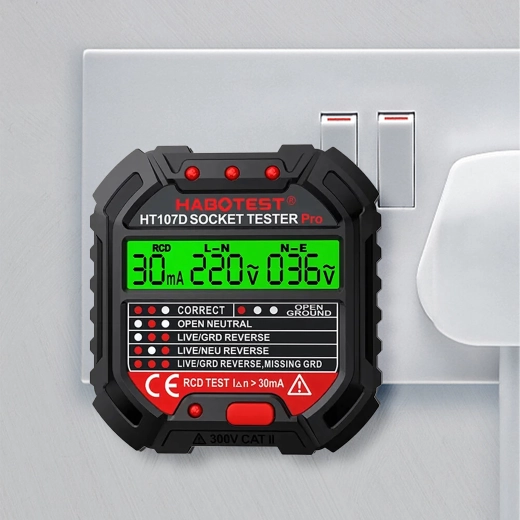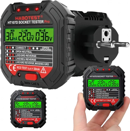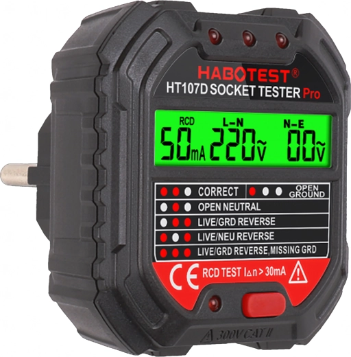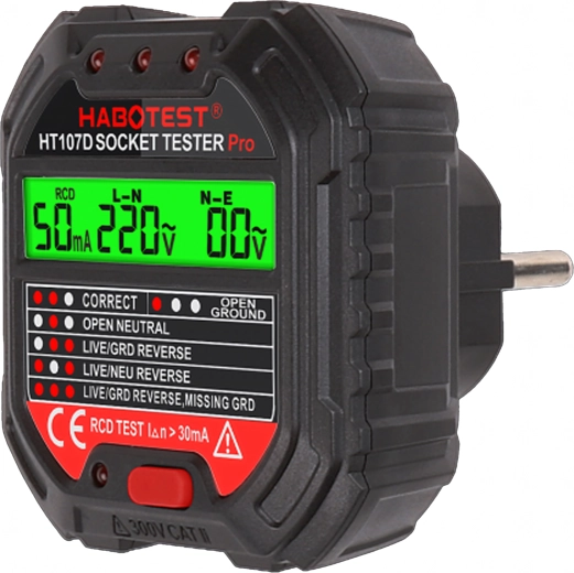 Le HABOTEST HT107D est un outil pratique pour un contrôle rapide des prises secteur. Grâce à son écran LCD clair, il fournit des informations lisibles sur l’état du câblage et la tension, afin que vous sachiez immédiatement si la prise est sûre à utiliser. Le test RCD intégré permet de vérifier le bon fonctionnement du dispositif différentiel et d’augmenter la protection contre les chocs électriques.
