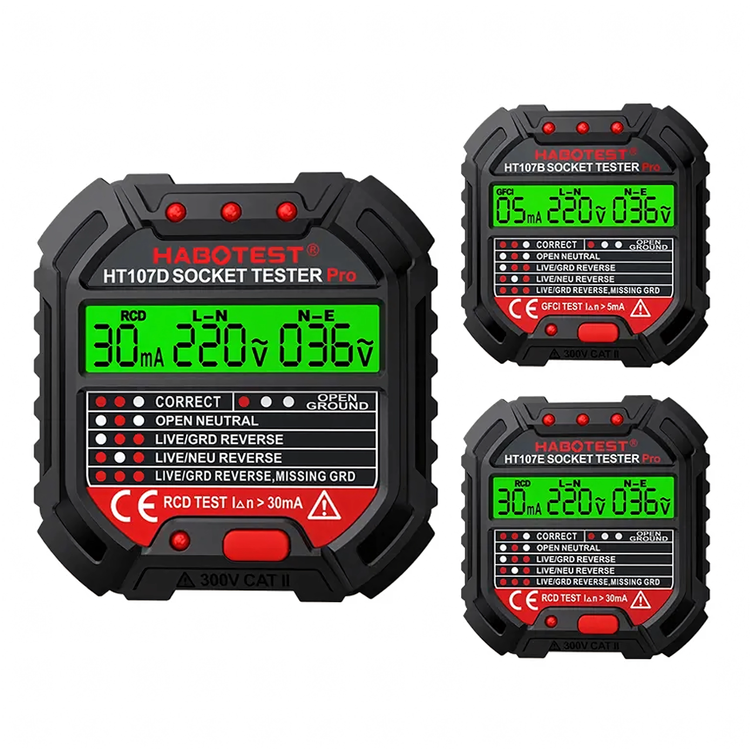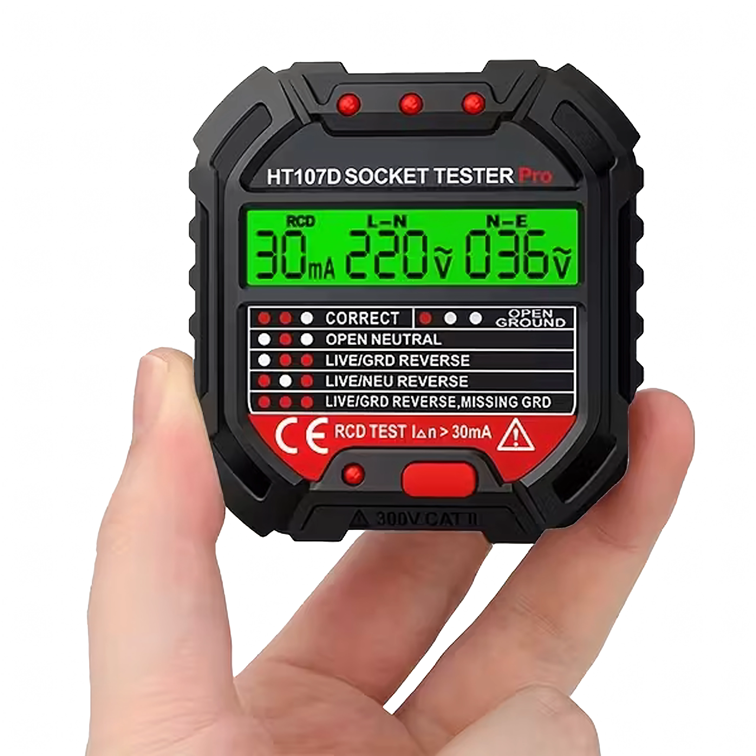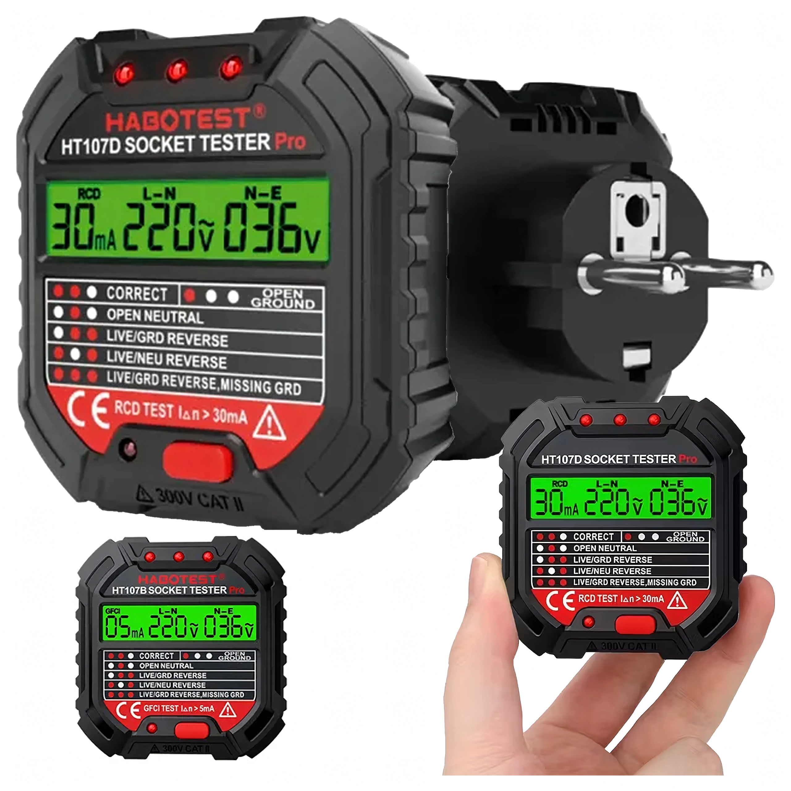 Le HABOTEST HT107D est un outil pratique pour un contrôle rapide des prises secteur. Grâce à son écran LCD clair, il fournit des informations lisibles sur l’état du câblage et la tension, afin que vous sachiez immédiatement si la prise est sûre à utiliser. Le test RCD intégré permet de vérifier le bon fonctionnement du dispositif différentiel et d’augmenter la protection contre les chocs électriques.