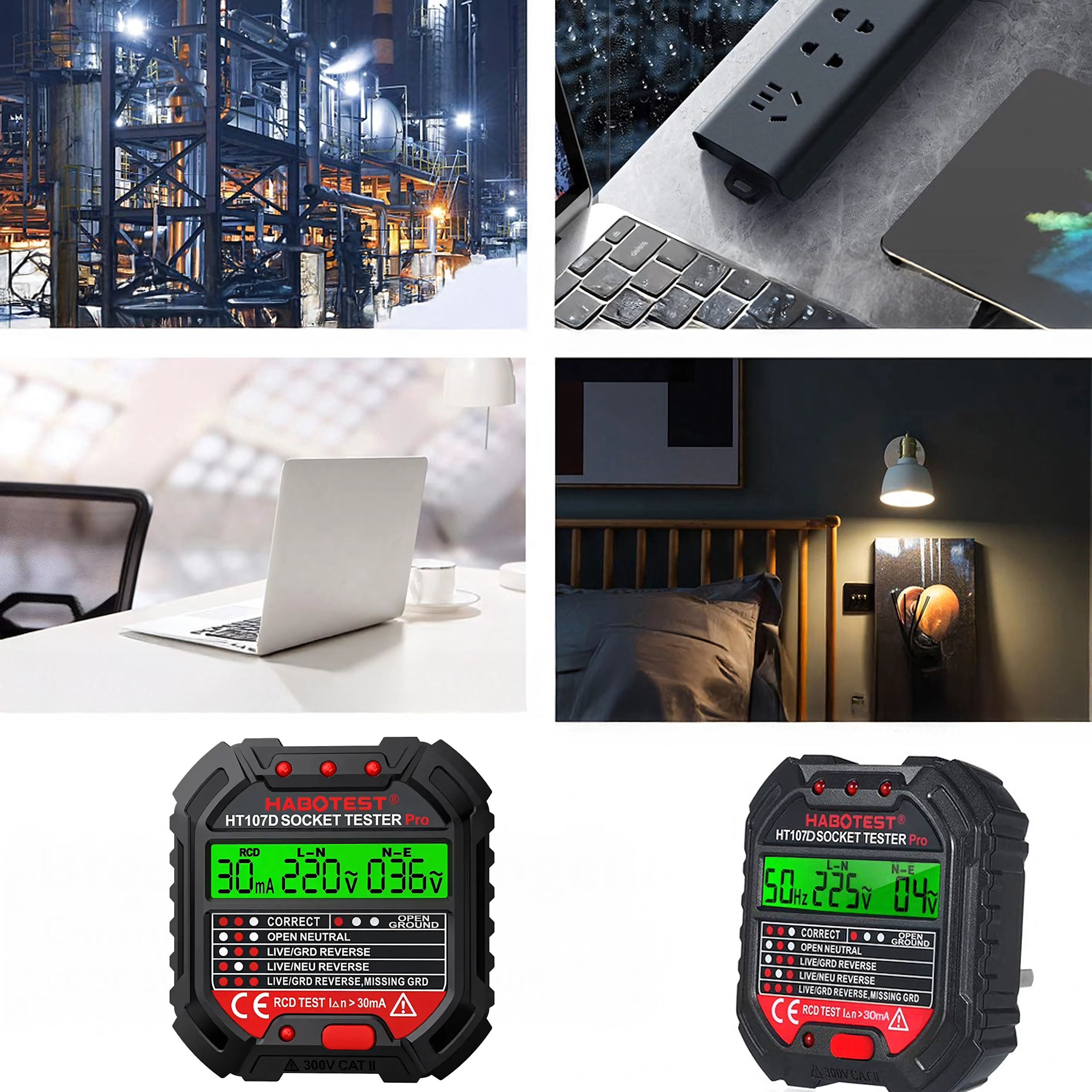 Assurez votre sécurité à la maison, au bureau et à l’atelier grâce au testeur de tension intelligent HABOTEST HT107D. Ce testeur de prises compact et très fonctionnel avec écran LCD détecte rapidement les erreurs d’installation électrique et aide à prévenir les pannes et réparations coûteuses. Il prend également en charge le test RCD (dispositif différentiel résiduel) pour vérifier la protection correcte du circuit.