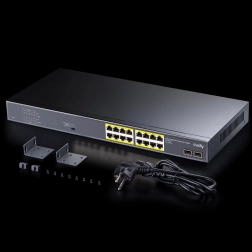 Commutateur gigabit 16 ports performant avec prise en charge PoE+, budget PoE total 200 W et deux ports SFP gigabit. Il offre un mode CCTV jusqu’à 250 m pour l’alimentation et les données, une isolation VLAN des ports pour une sécurité accrue, des indicateurs LED clairs et un châssis métallique 19" robuste avec alimentation interne.