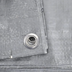 Des œillets métalliques sont répartis sur tout le pourtour pour une tension sûre et un arrimage de la bâche à des cadres, piquets ou chargements. La couleur argentée aide en outre à réfléchir les rayons du soleil et à réduire la surchauffe des objets couverts.