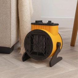 Des boutons de commande intuitifs permettent un réglage continu du thermostat et la sélection des modes. La grille de sécurité frontale protège du contact avec l’élément chauffant, tandis que la construction robuste et le support inclinable assurent un flux d’air chaud orienté là où c’est nécessaire.