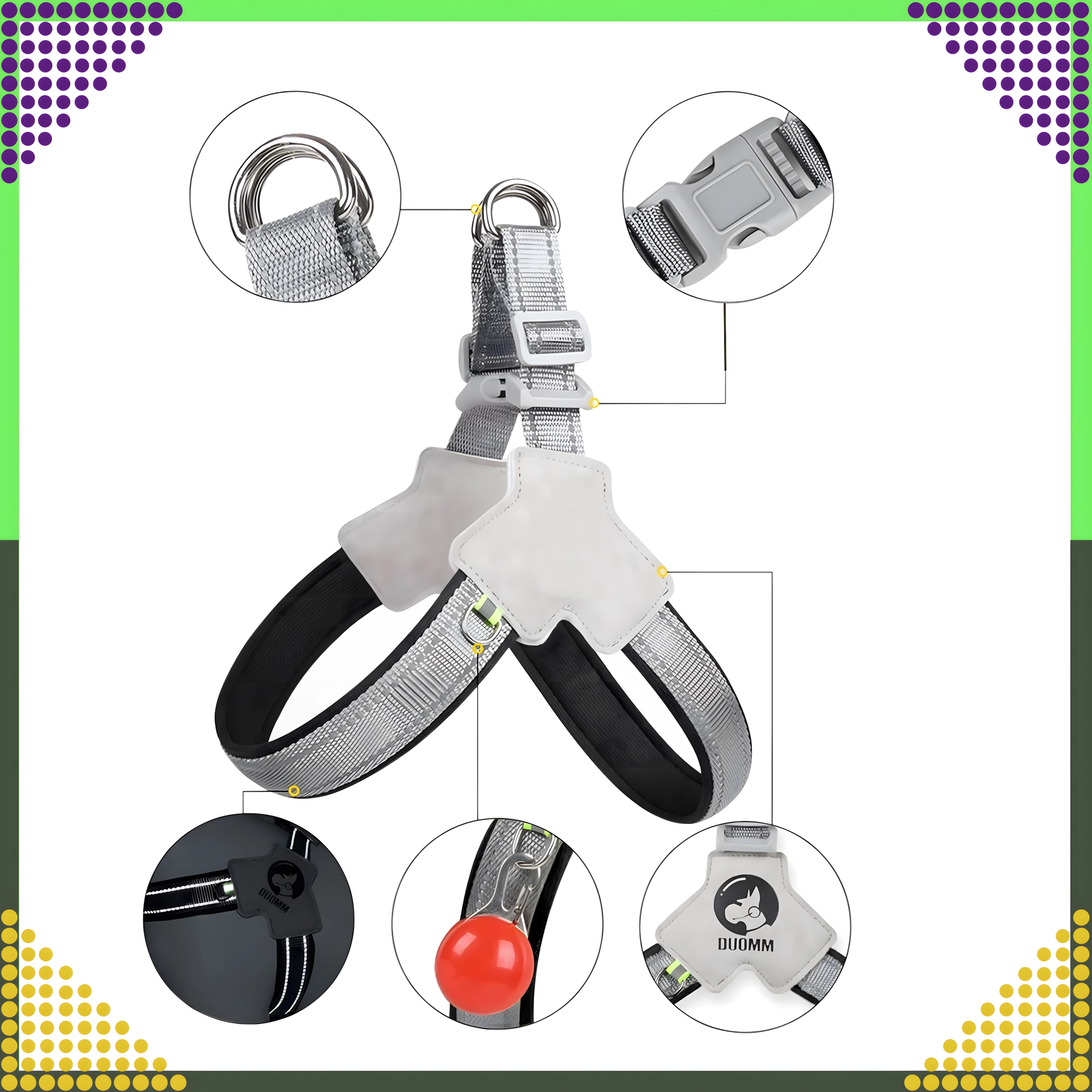 Le harnais est fabriqué dans des matériaux durables et résistants à l’abrasion avec une doublure douce pour un confort tout au long de la journée. Des éléments réfléchissants assurent une meilleure visibilité après la tombée de la nuit. Sangles entièrement réglables et boucle de sécurité à double verrouillage maintiennent l’ensemble bien en place, tandis que les deux anneaux en D métalliques offrent une attache de laisse sûre.