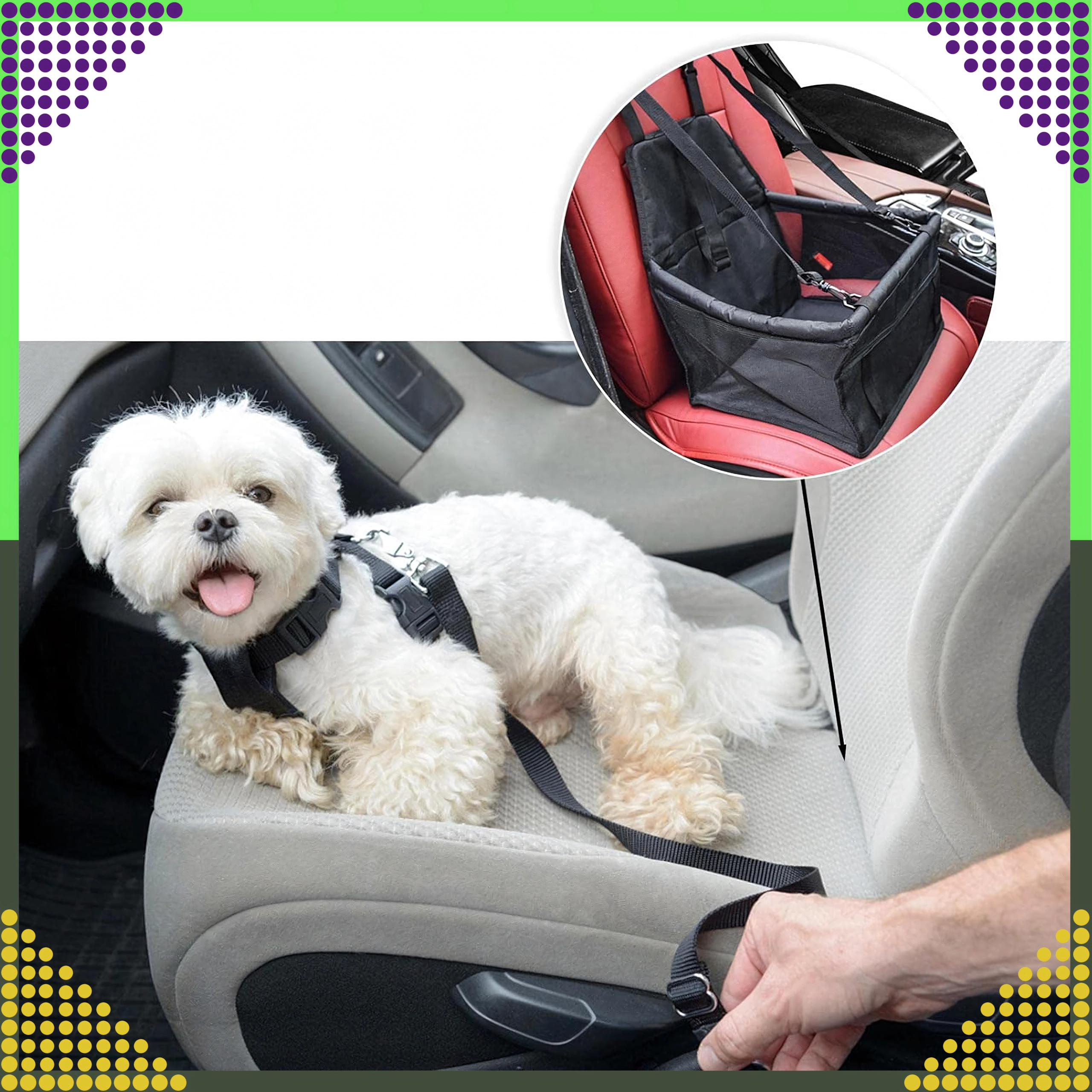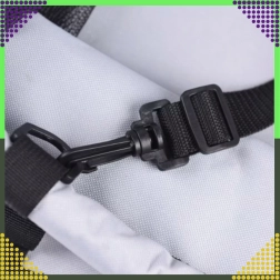Les sangles réglables fixent le siège à l’appuie-tête et à l’assise, tandis que le mousqueton intérieur se clipse au harnais pour maintenir l’animal à sa place même lors des freinages.