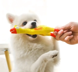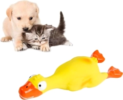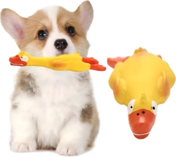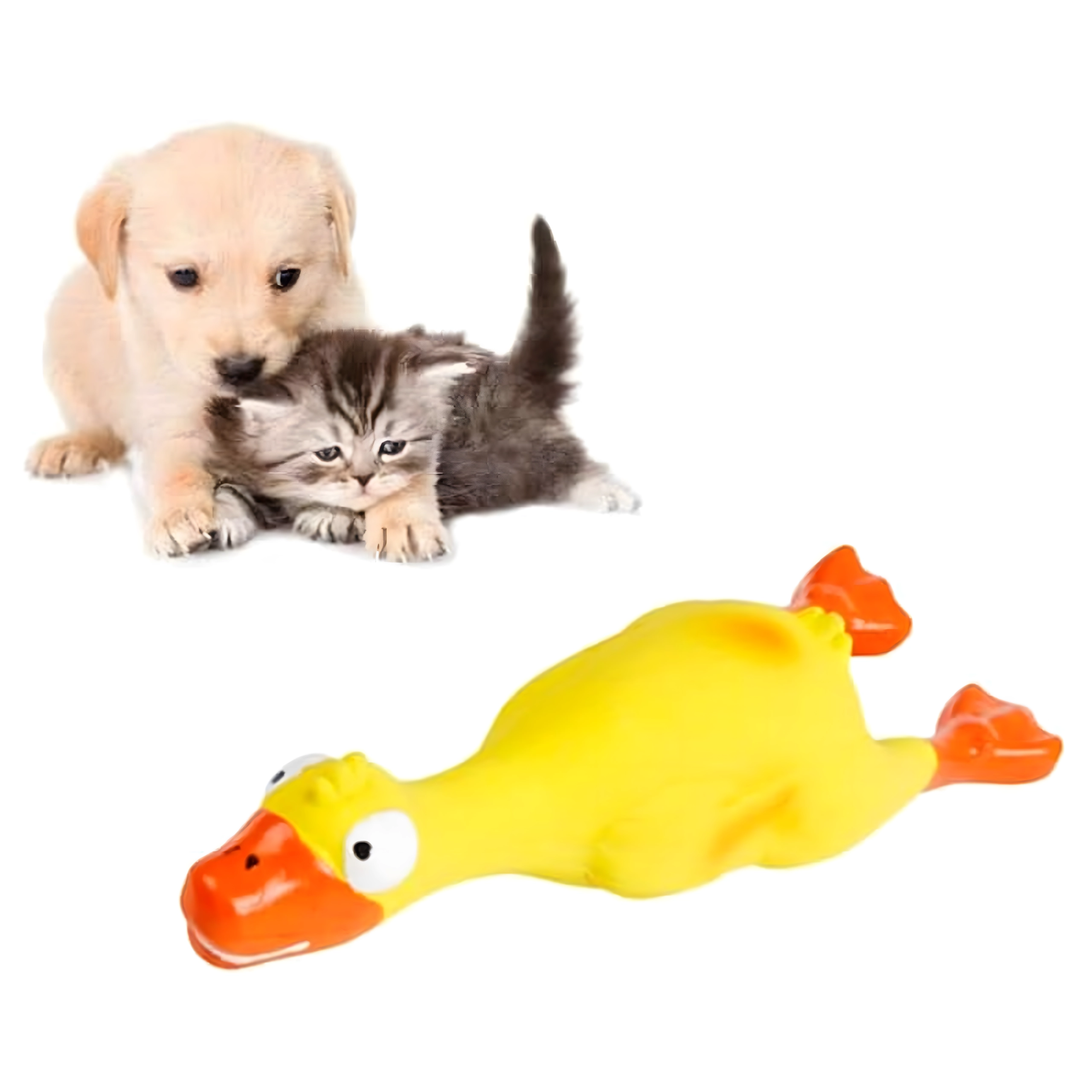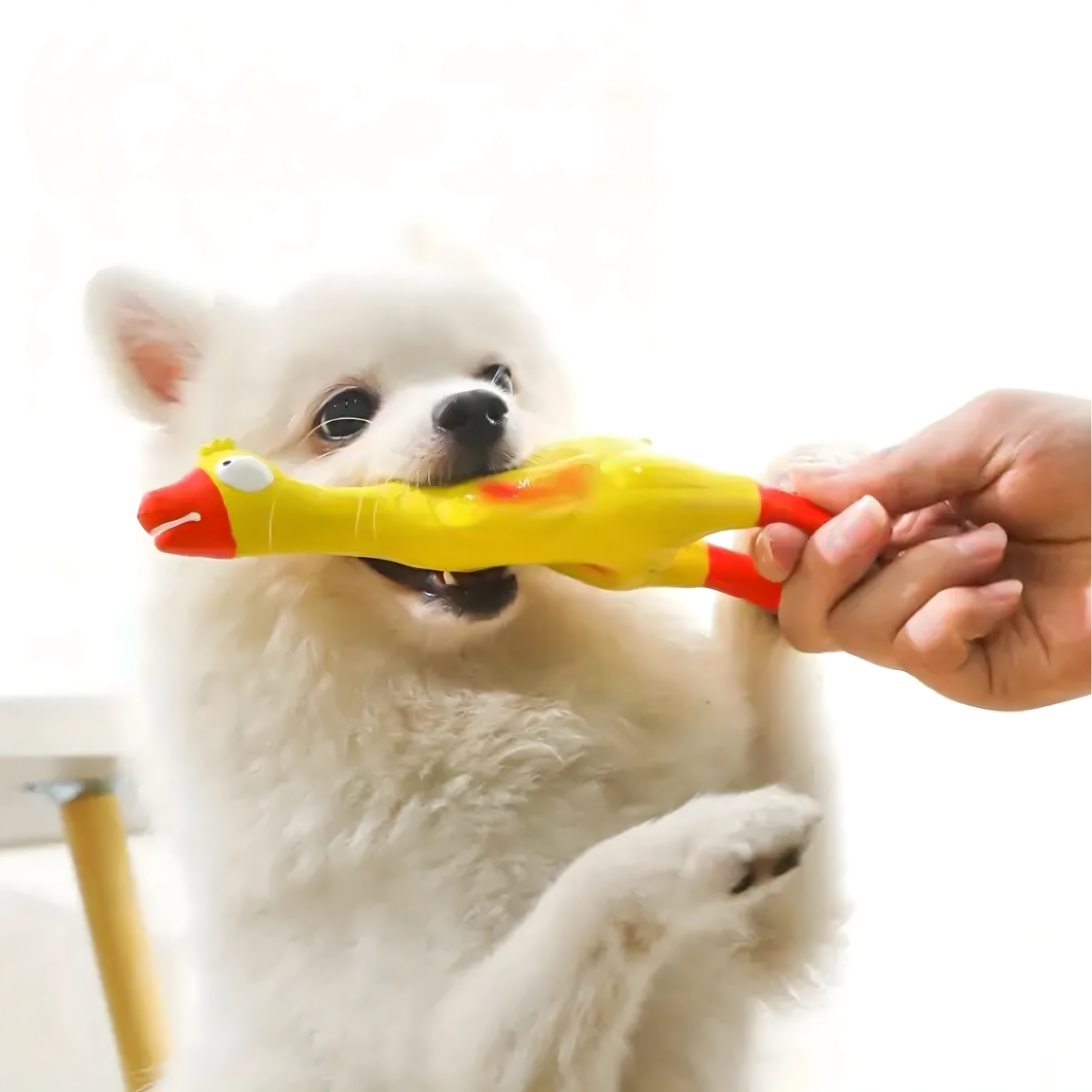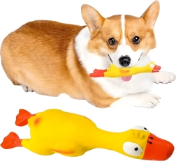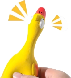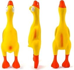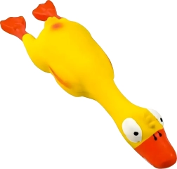 Jouet couineur amusant en forme de poulet de 22 cm pour chiens de toutes tailles. Caoutchouc résistant et flexible qui invite à mâcher, tirer et rapporter; lorsqu’on le presse, il couine et motive à l’activité. Idéal pour dépenser de l’énergie et lutter contre l’ennui, convient aussi aux chats.