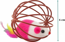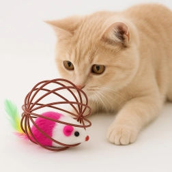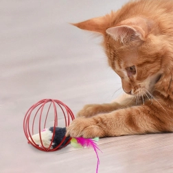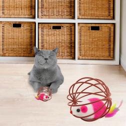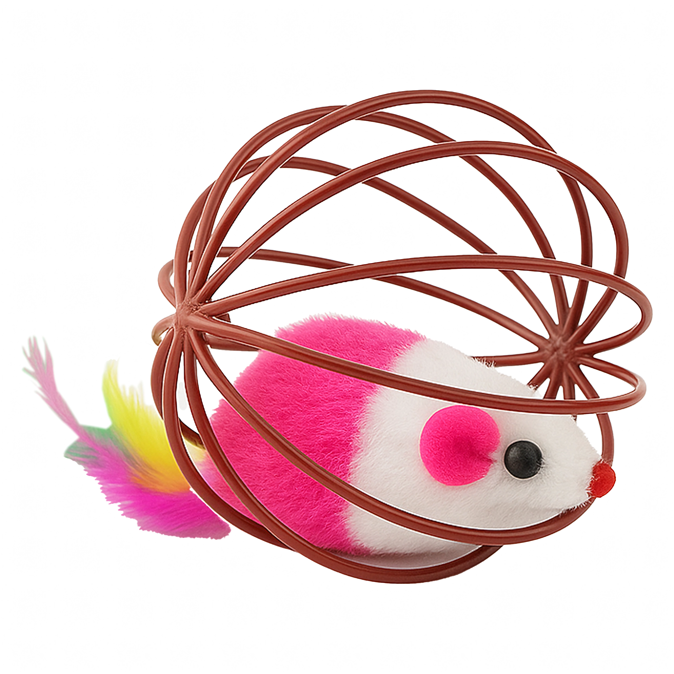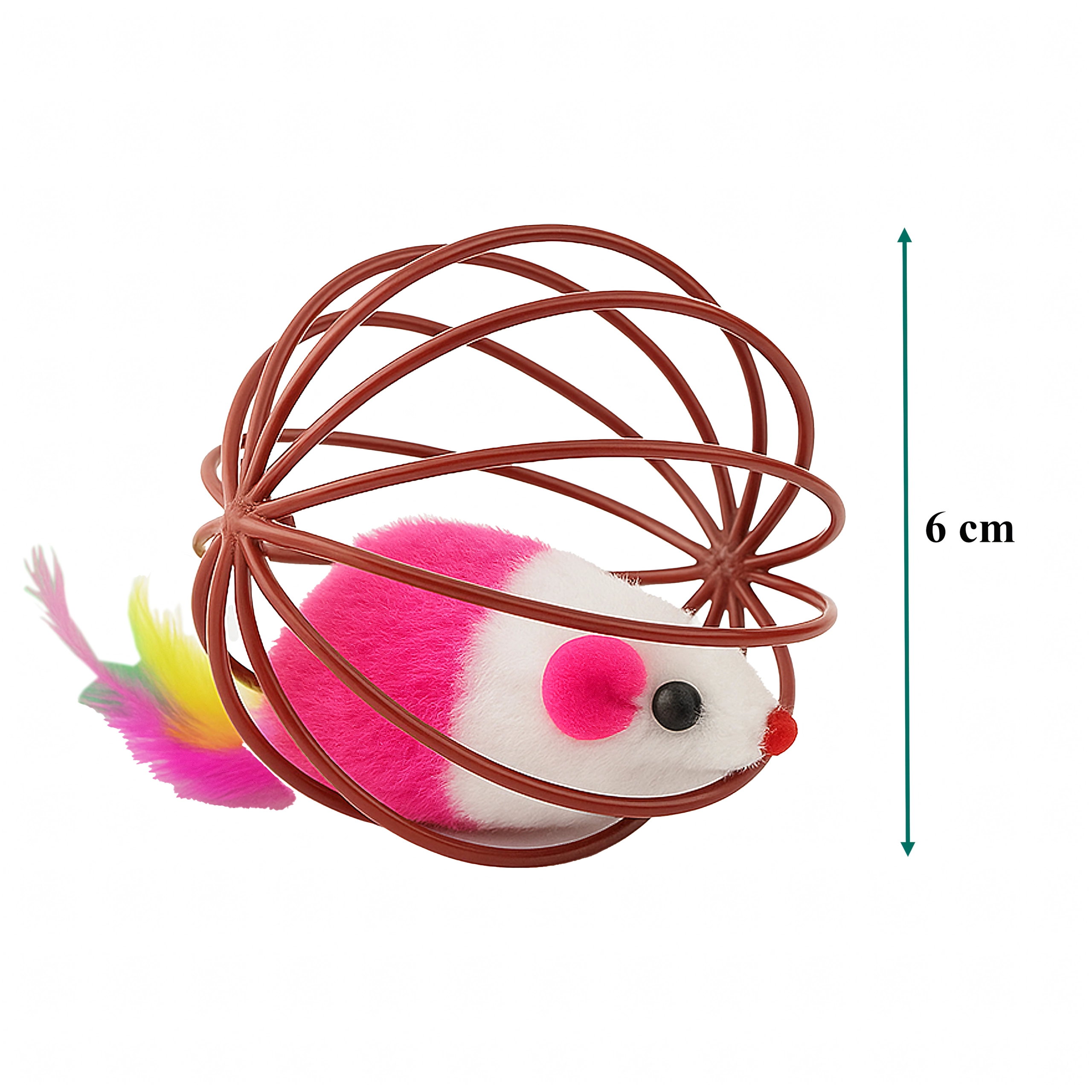 La souris douce à l’intérieur de la boule, avec des plumes colorées et un léger bruissement, éveille la curiosité et prolonge le temps de jeu. Idéale pour une stimulation visuelle et sonore.
