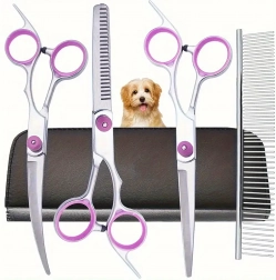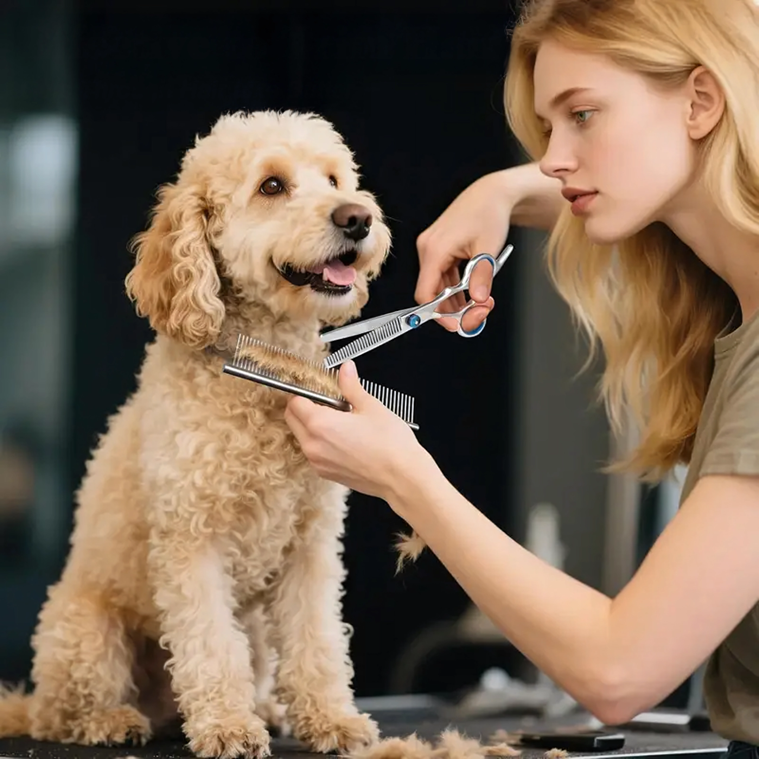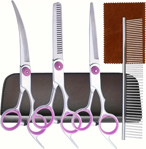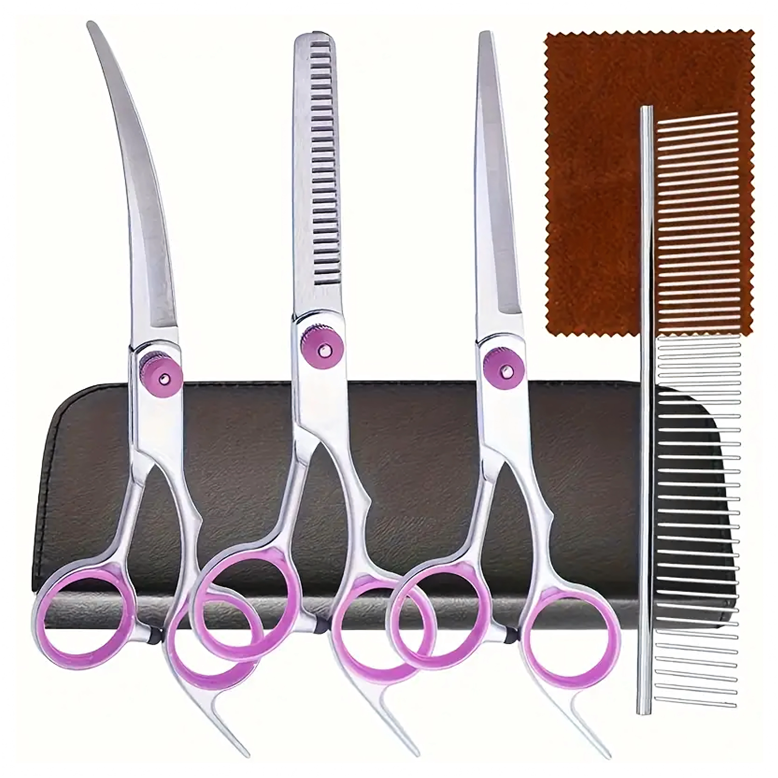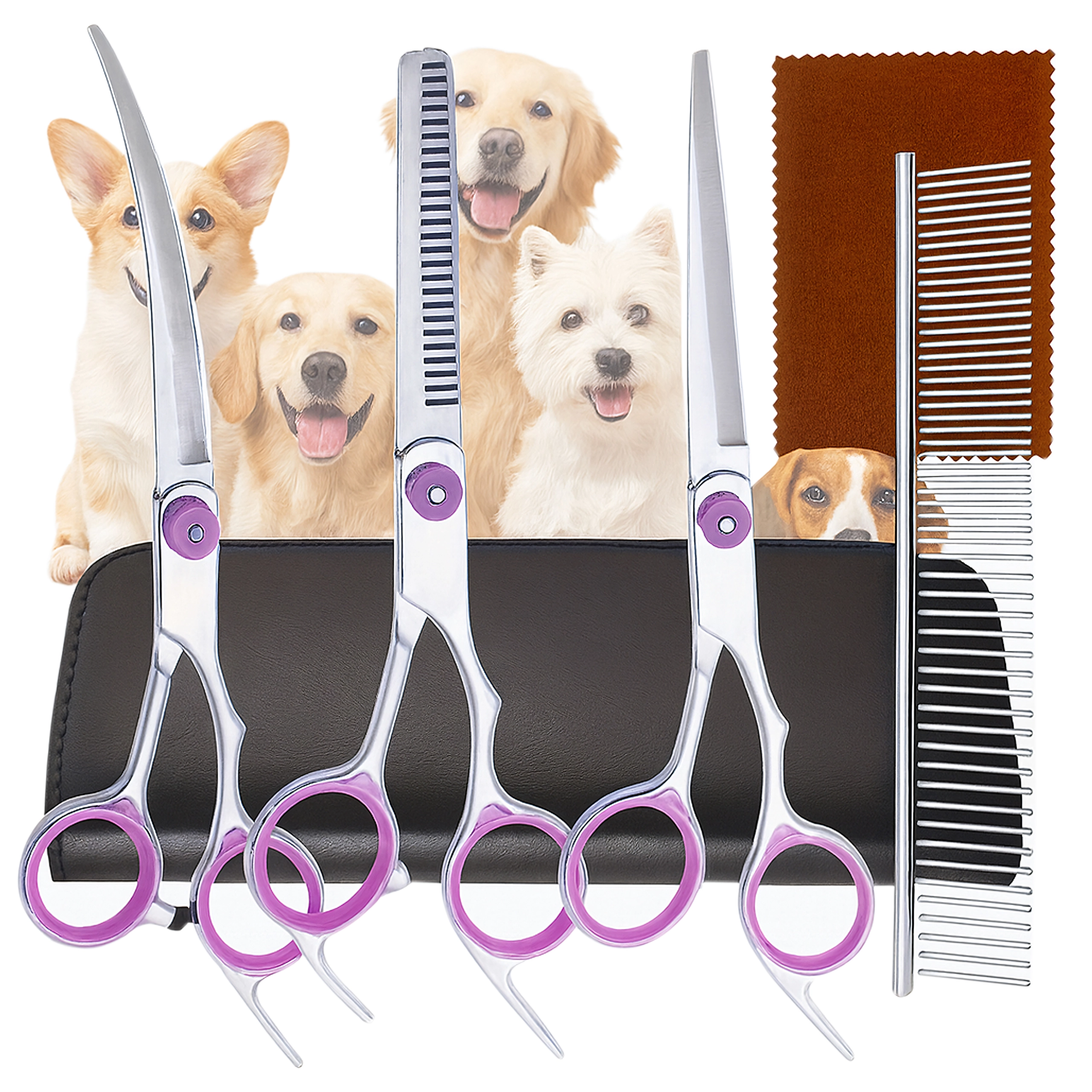 Le set contient tout le nécessaire pour un soin complet du pelage : ciseaux droits pour des lignes précises, ciseaux courbés pour un modelage sûr autour des pattes, des oreilles et du visage, ciseaux effileurs pour adoucir les transitions et un peigne métallique fin pour le démêlage et la finition.