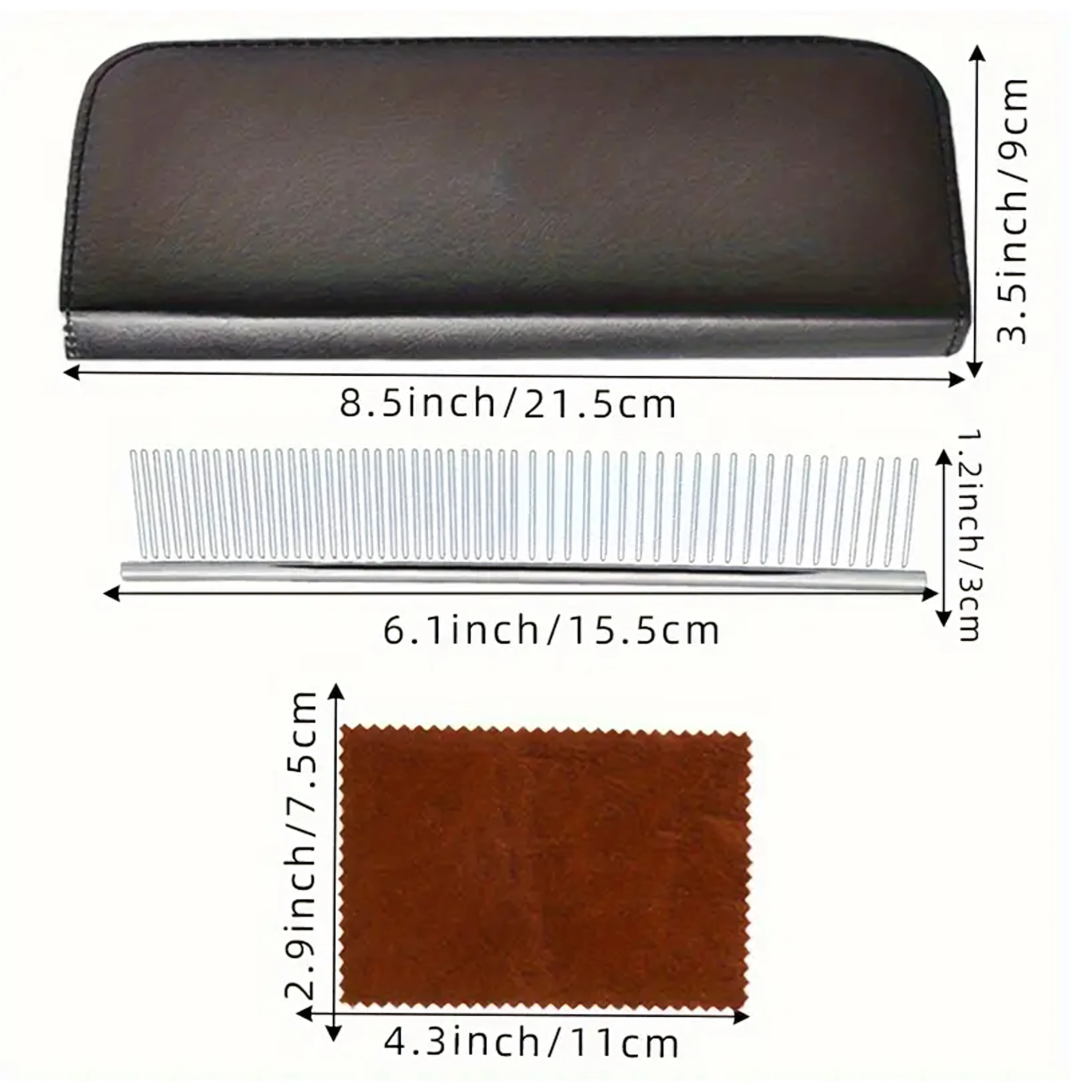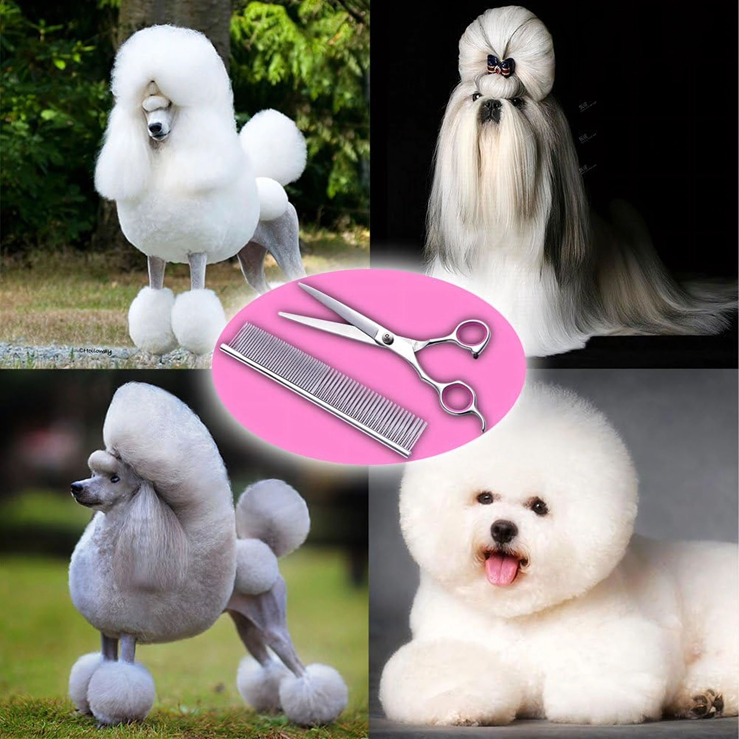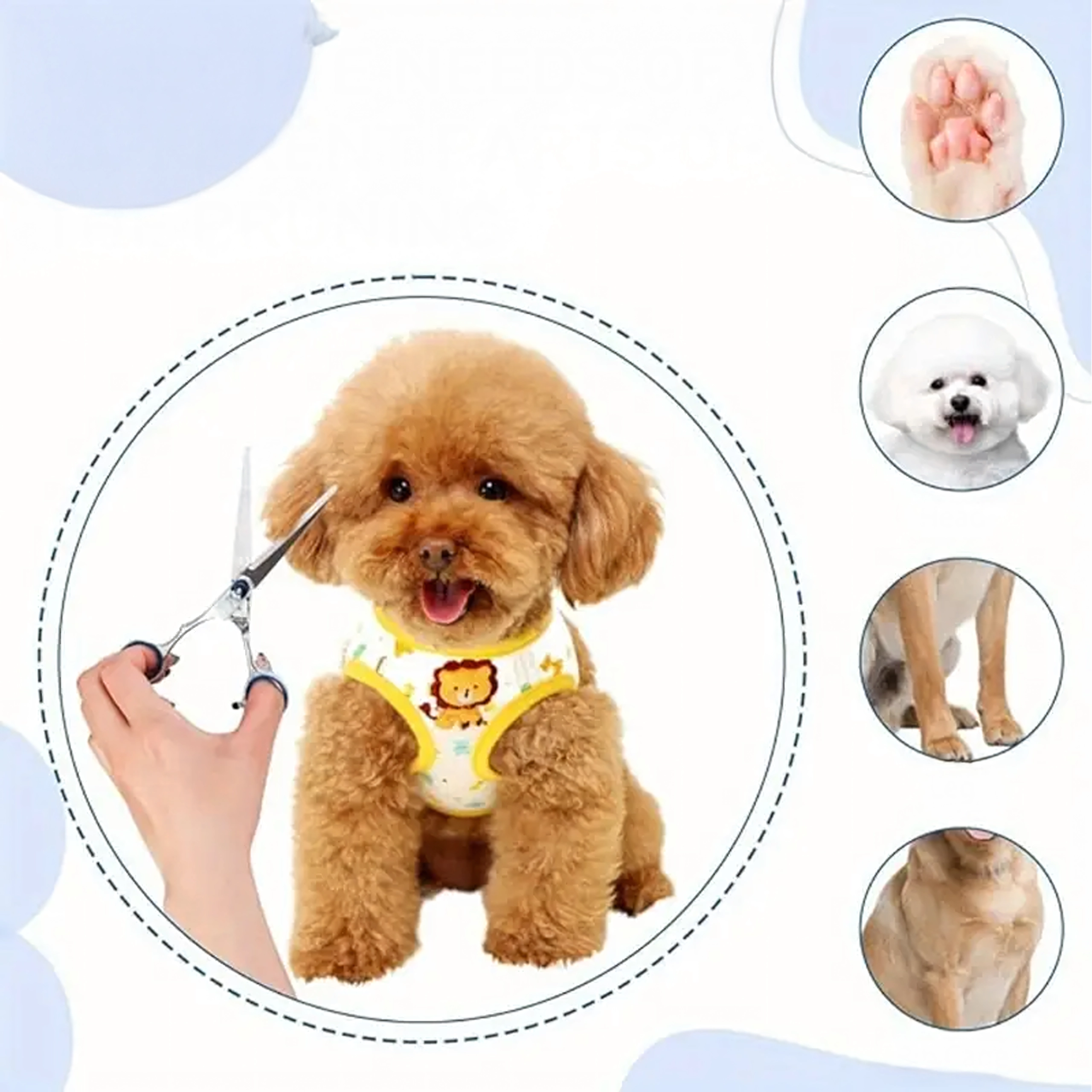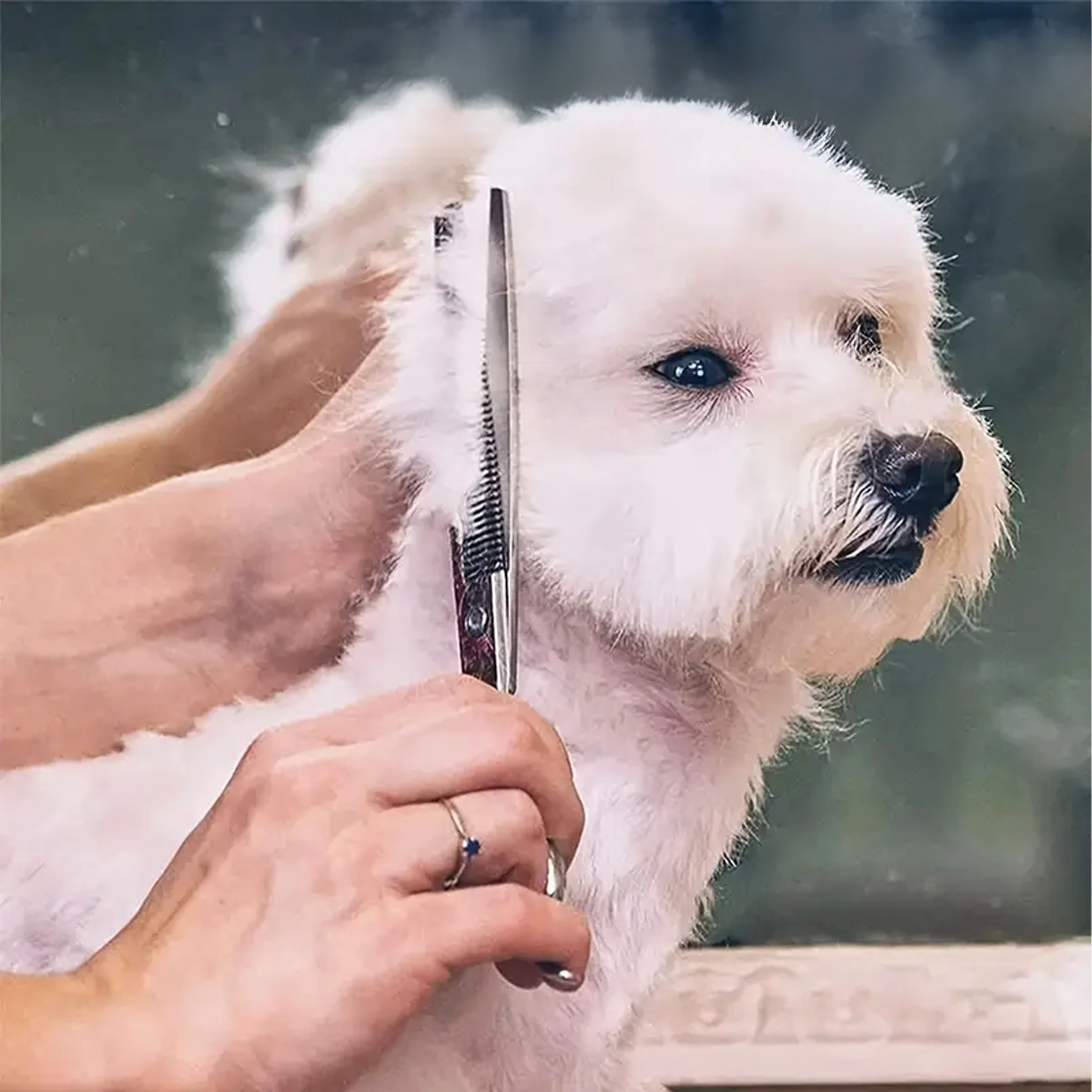 Le set contient tout le nécessaire pour un soin complet du pelage : ciseaux droits pour des lignes précises, ciseaux courbés pour un modelage sûr autour des pattes, des oreilles et du visage, ciseaux effileurs pour adoucir les transitions et un peigne métallique fin pour le démêlage et la finition.