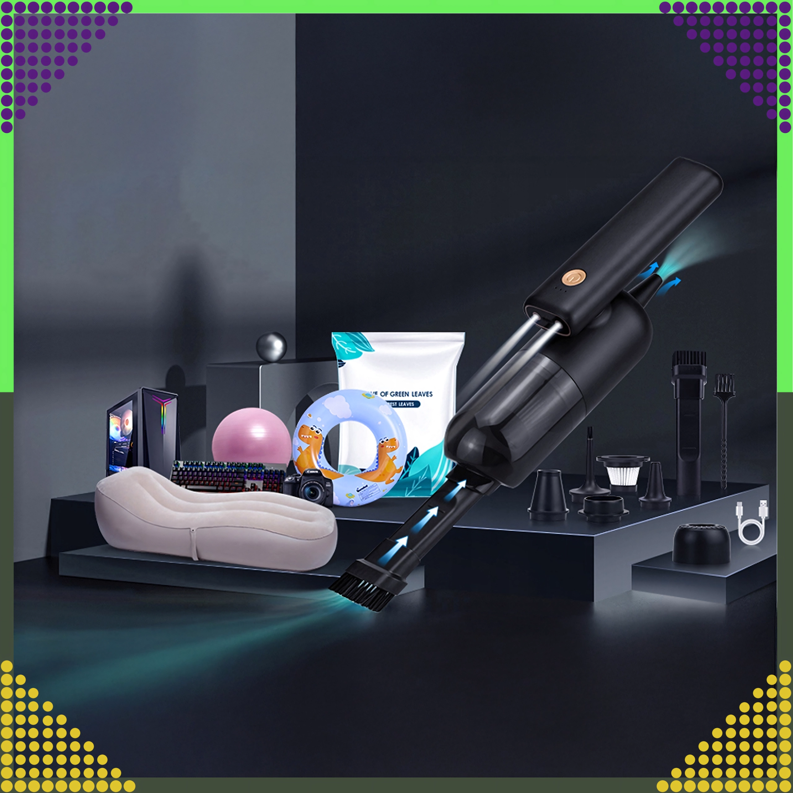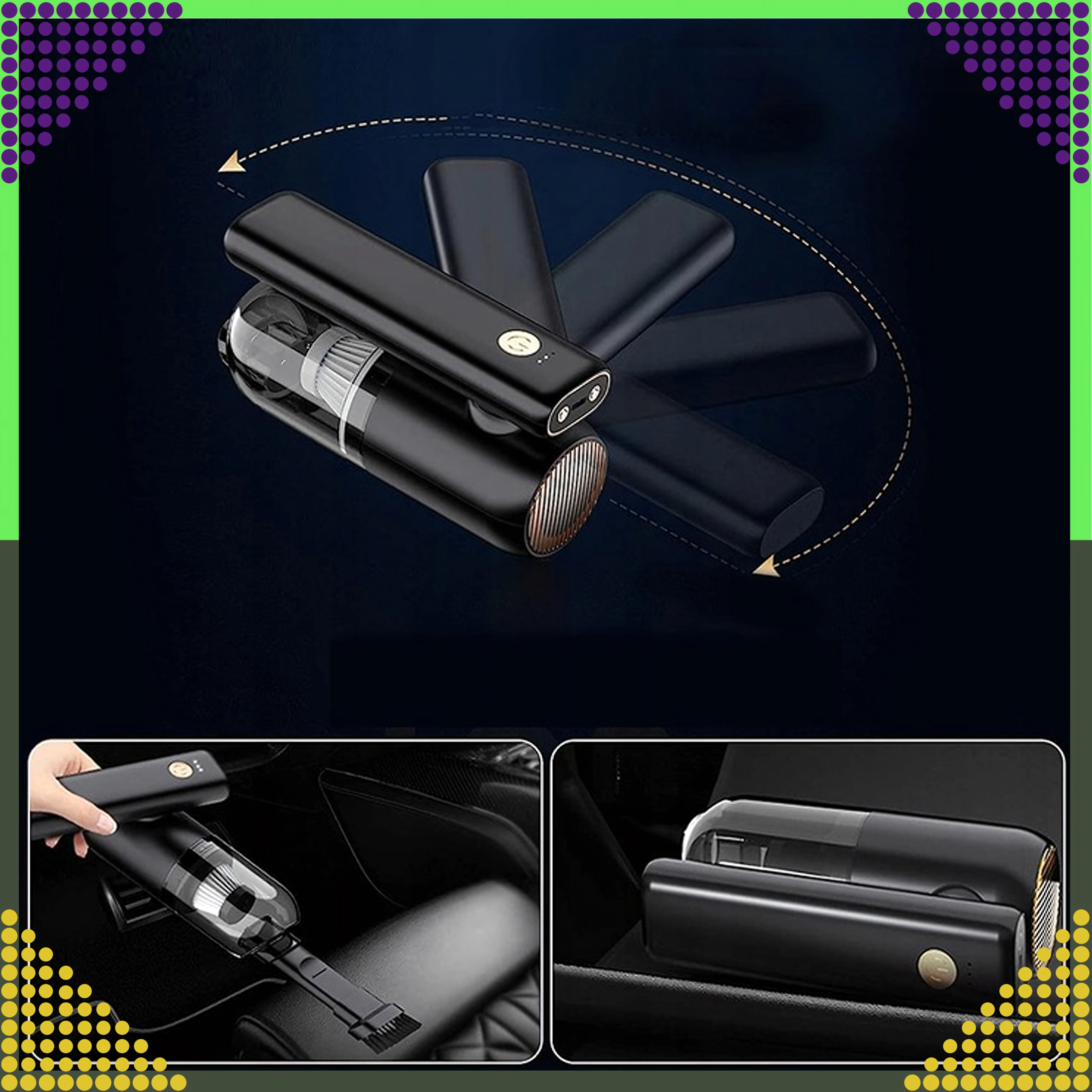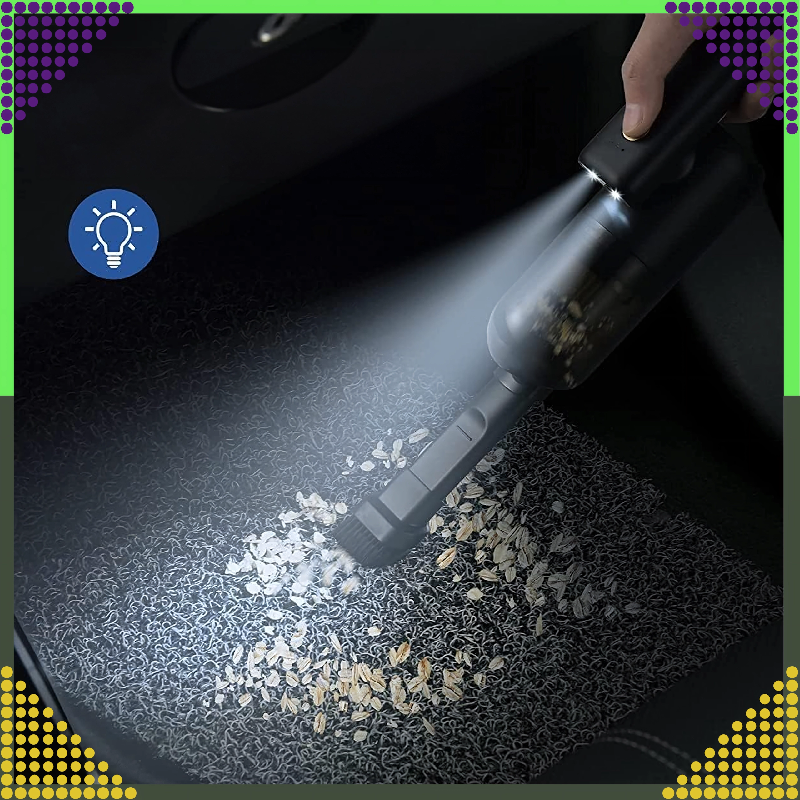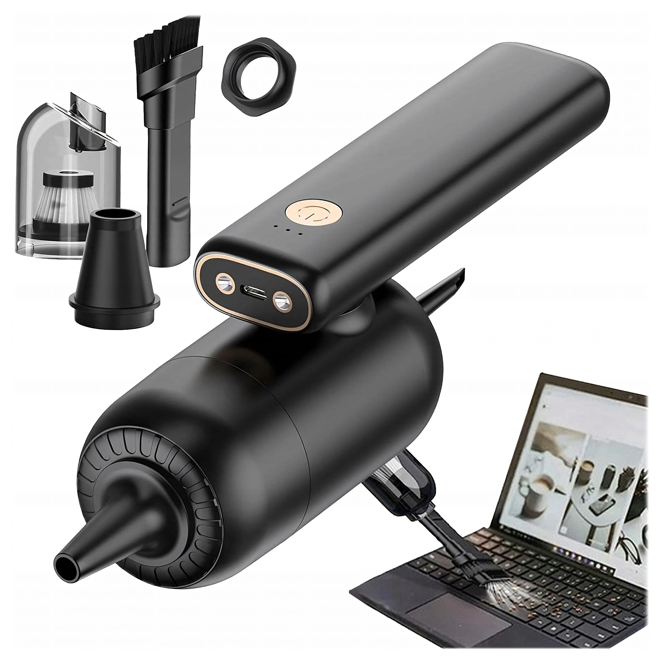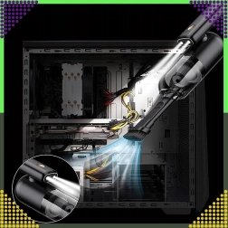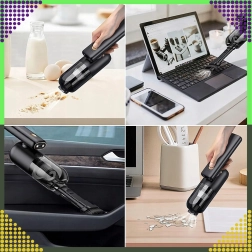 Aspirateur à main 2-en-1 compact et puissant pour la voiture et la maison, combinant utilisation sans fil, forte puissance d’aspiration et fonction de soufflage dans un seul appareil. Grâce au filtre HEPA, il capture efficacement la poussière, le pollen et les particules fines, tandis que l’éclairage LED aide à voir même dans les zones sombres. Idéal pour un nettoyage rapide du sable, de la poussière, des miettes et des poils d’animaux dans la voiture, sur la table ou autour du clavier.