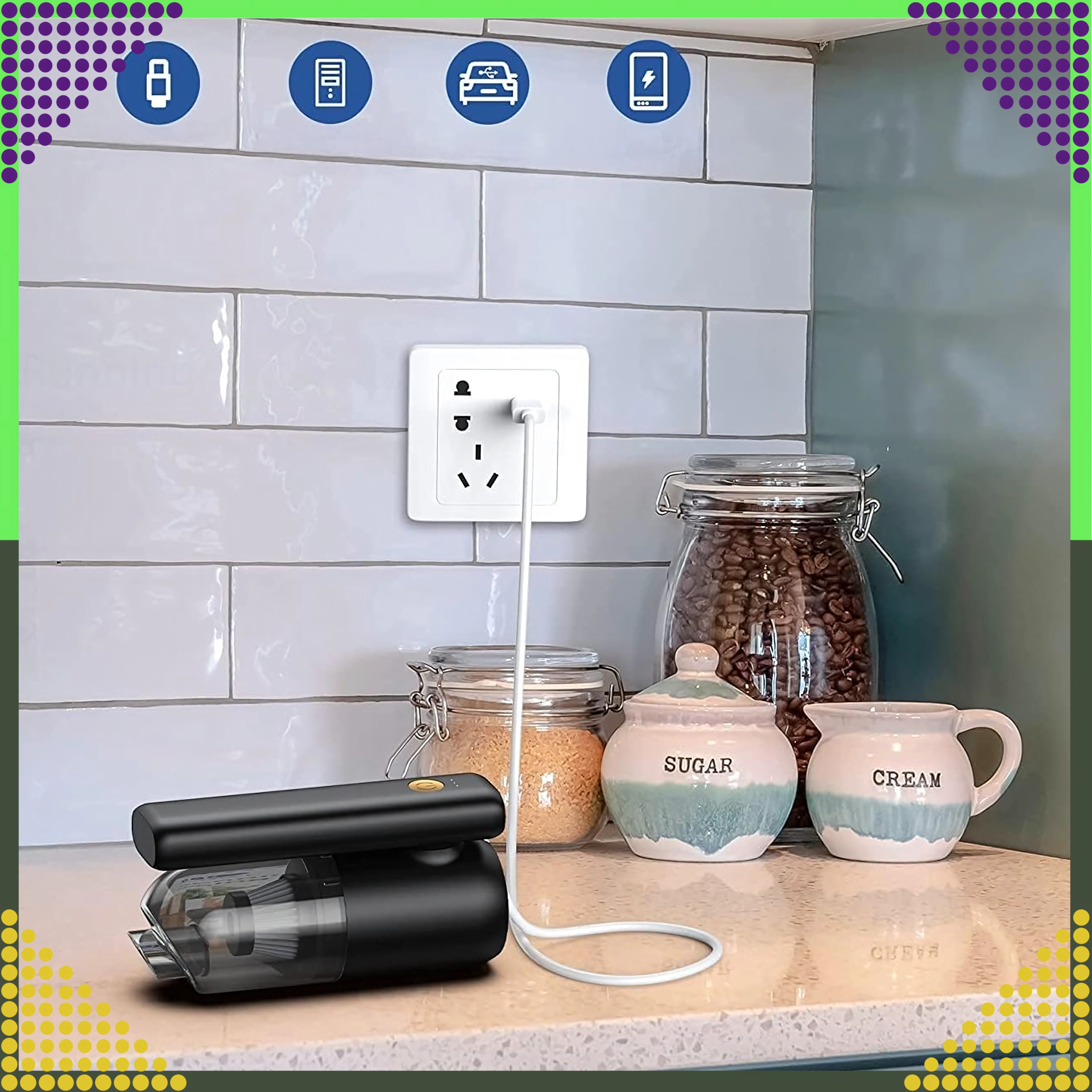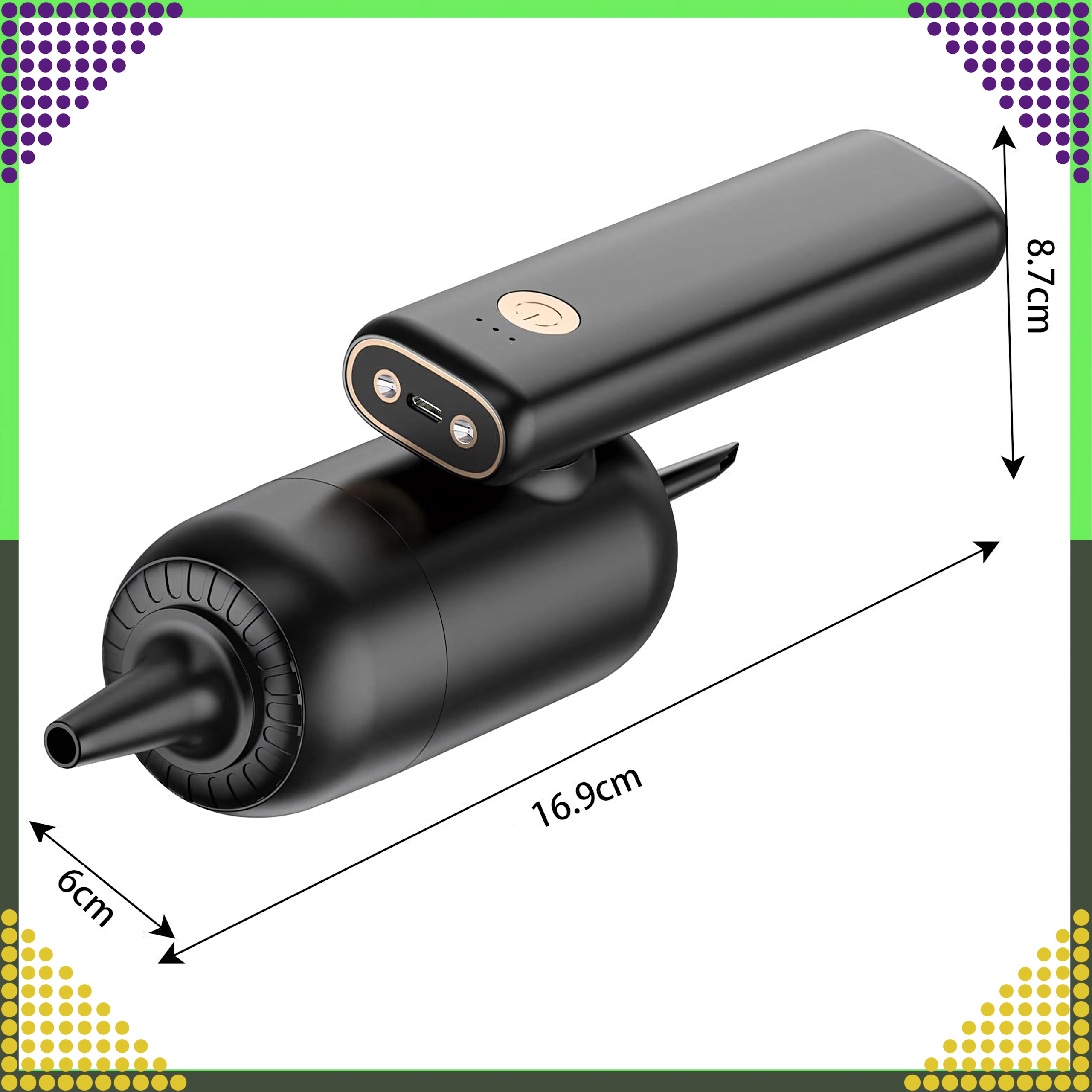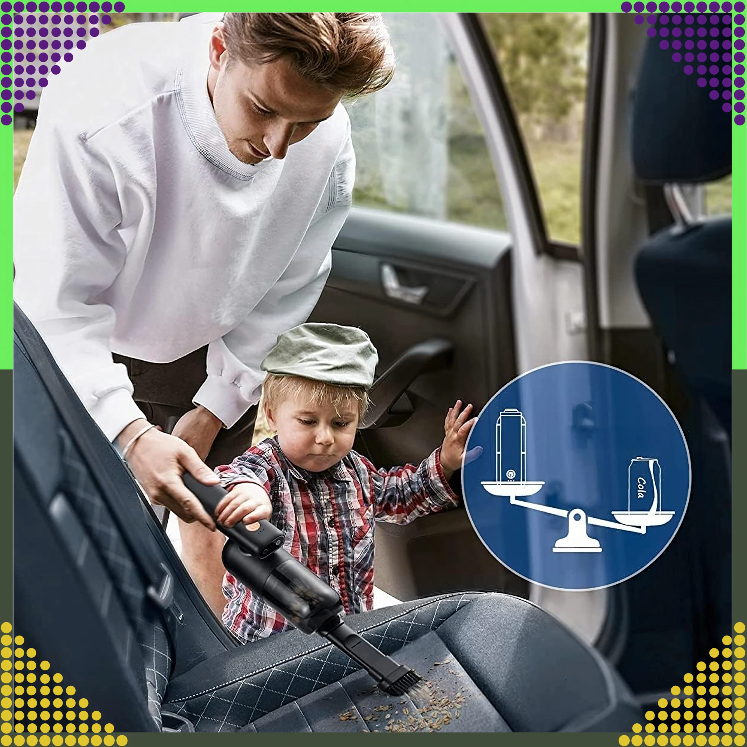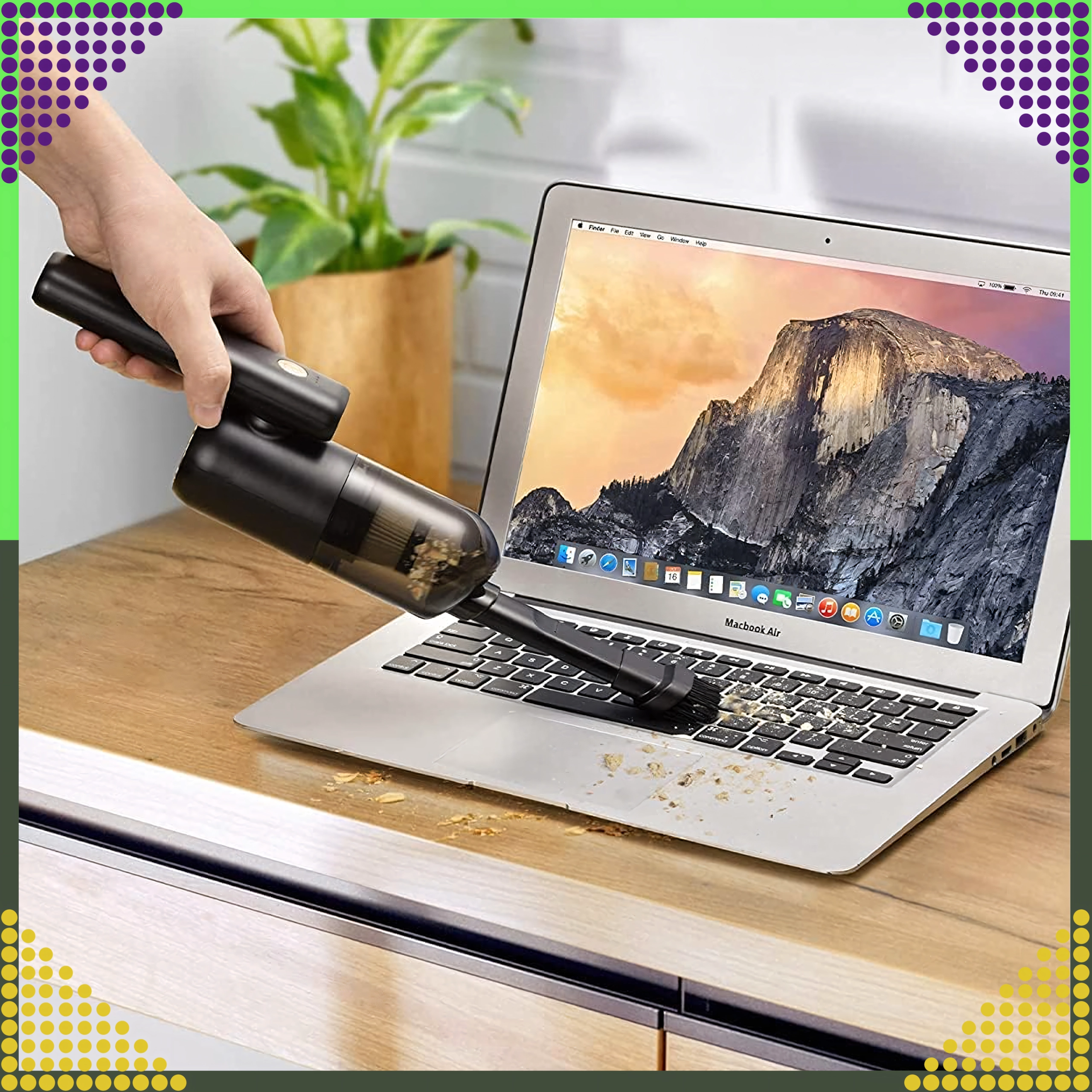 Aspirateur à main 2-en-1 compact et puissant pour la voiture et la maison, combinant utilisation sans fil, forte puissance d’aspiration et fonction de soufflage dans un seul appareil. Grâce au filtre HEPA, il capture efficacement la poussière, le pollen et les particules fines, tandis que l’éclairage LED aide à voir même dans les zones sombres. Idéal pour un nettoyage rapide du sable, de la poussière, des miettes et des poils d’animaux dans la voiture, sur la table ou autour du clavier.