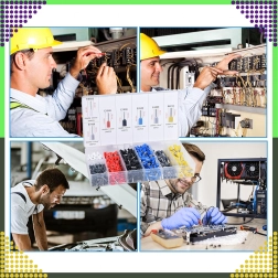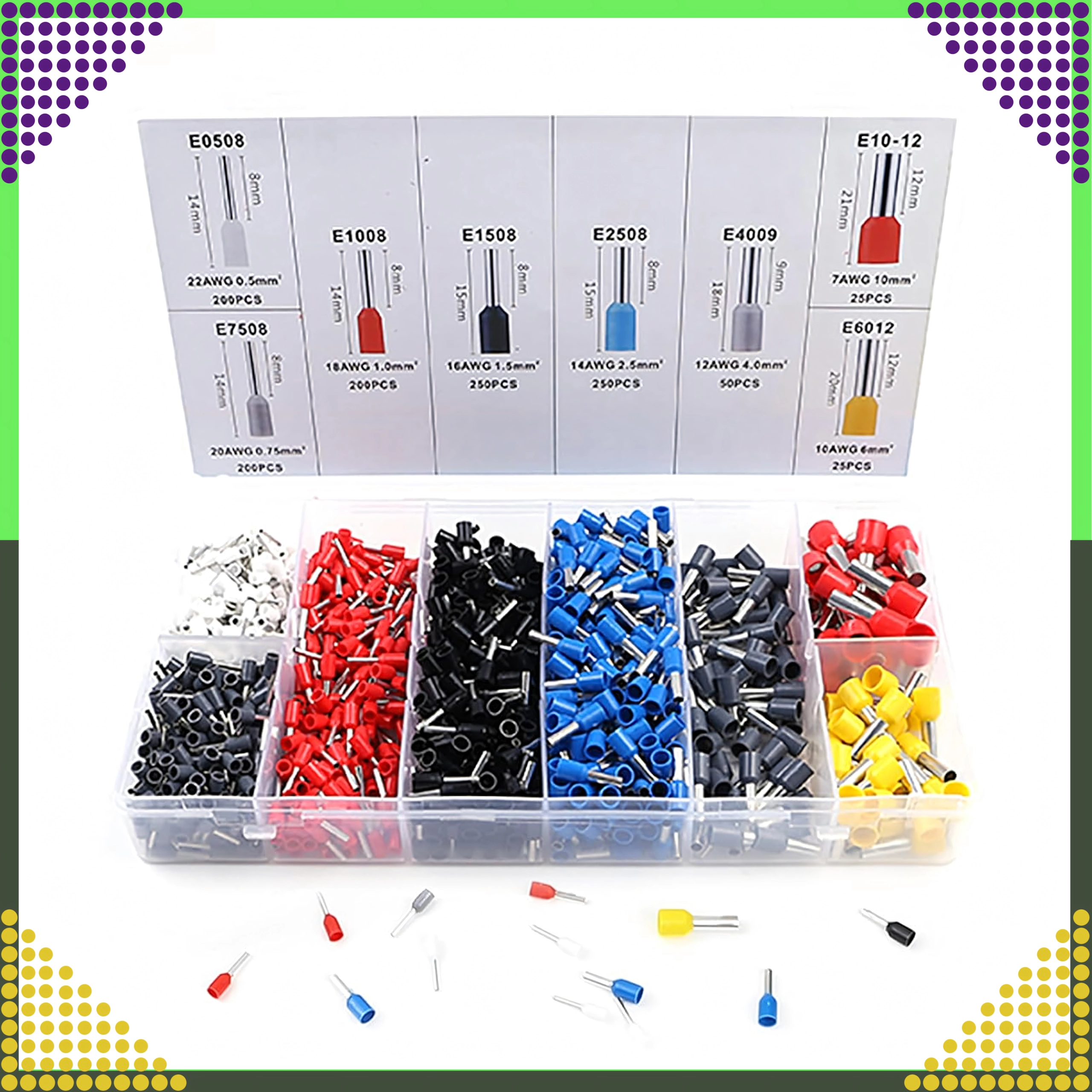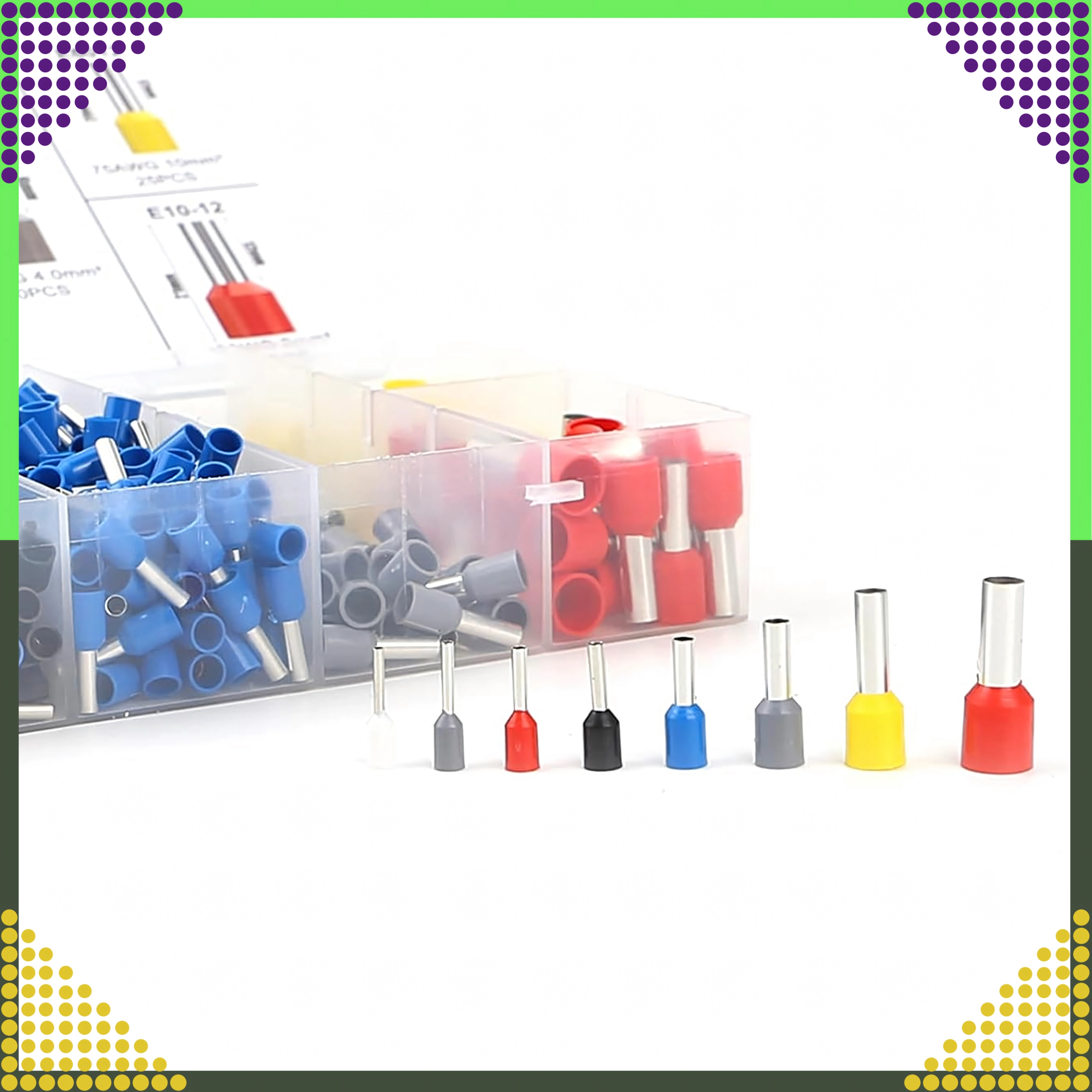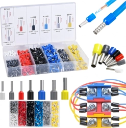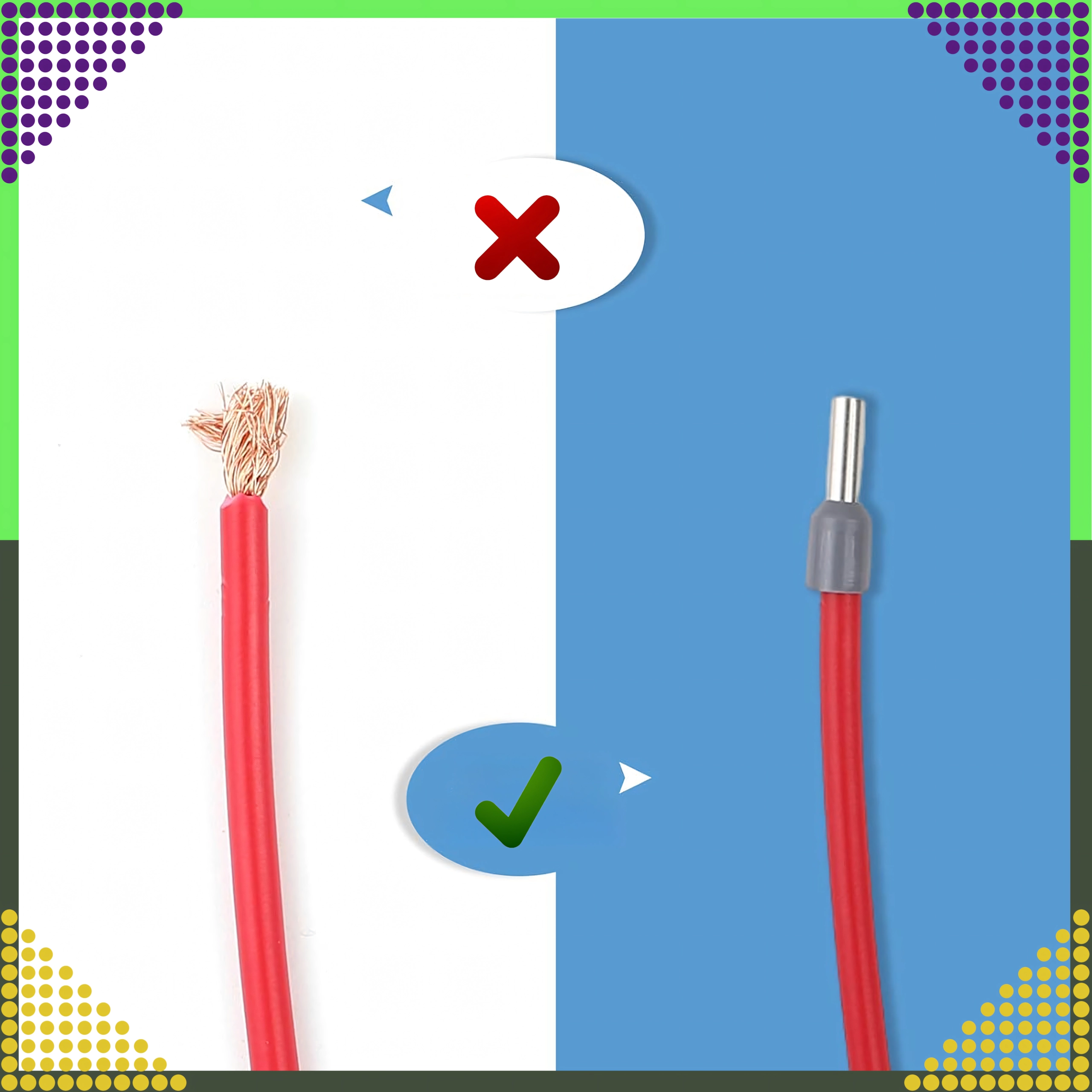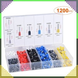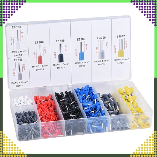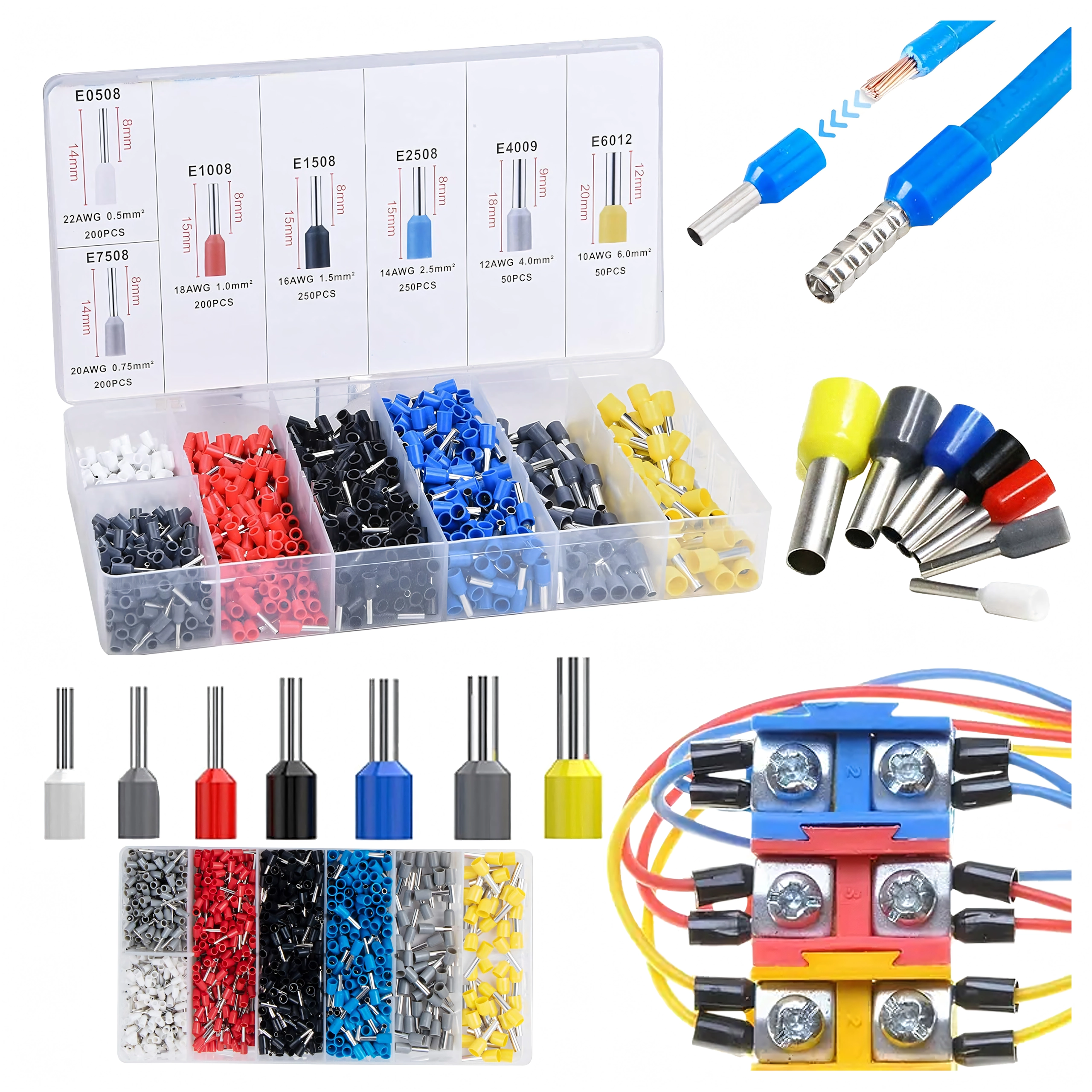 Dans un organiseur rigide, vous trouverez 1200 pcs de cosses en 7 tailles courantes, clairement séparées dans des compartiments. L’utilisation est simple : après dénudage de l’extrémité du conducteur, enfilez la cosse et sertissez avec une pince à sertir. L’extrémité ainsi préparée tient ensuite de manière fiable dans les bornes à vis et garantit un contact électrique stable.