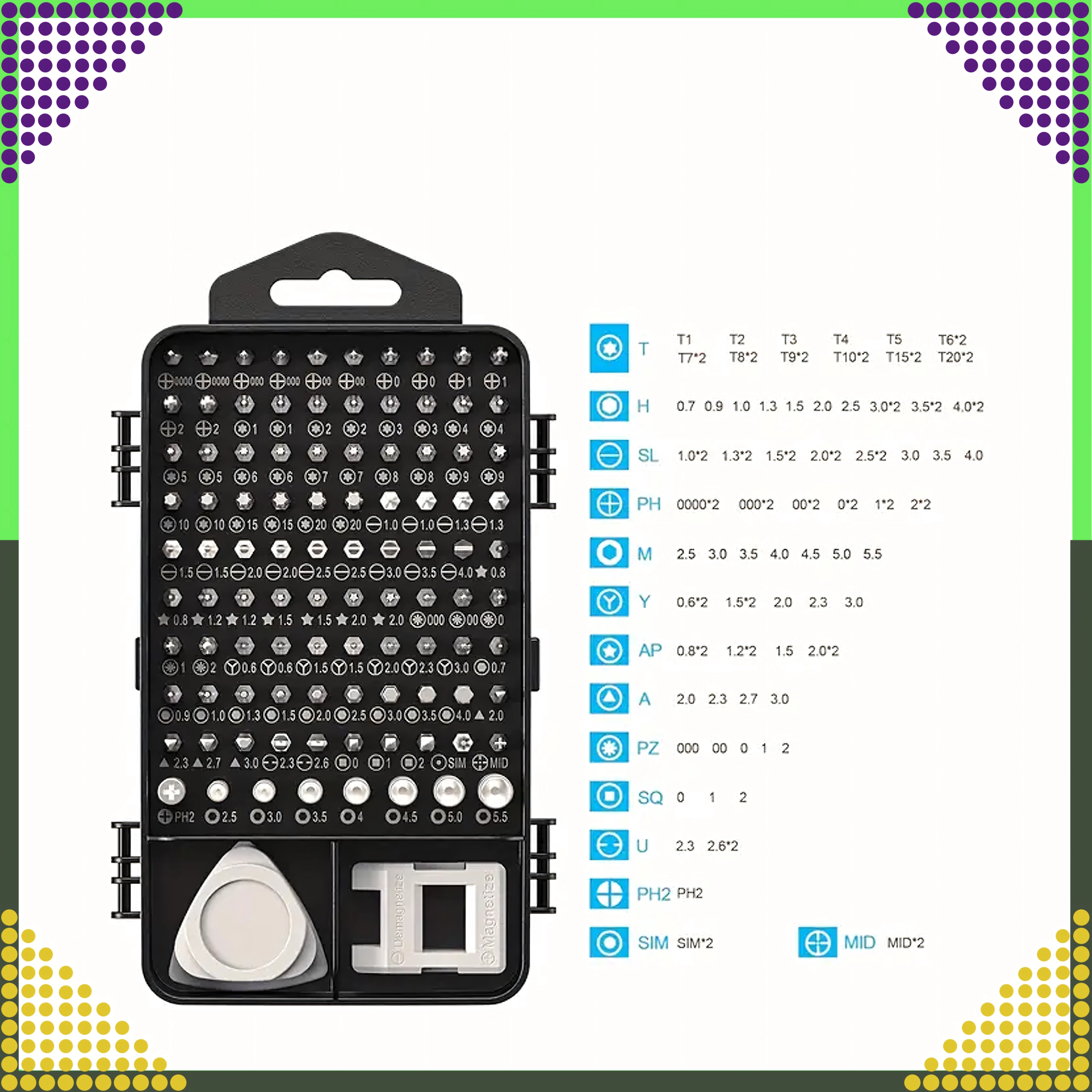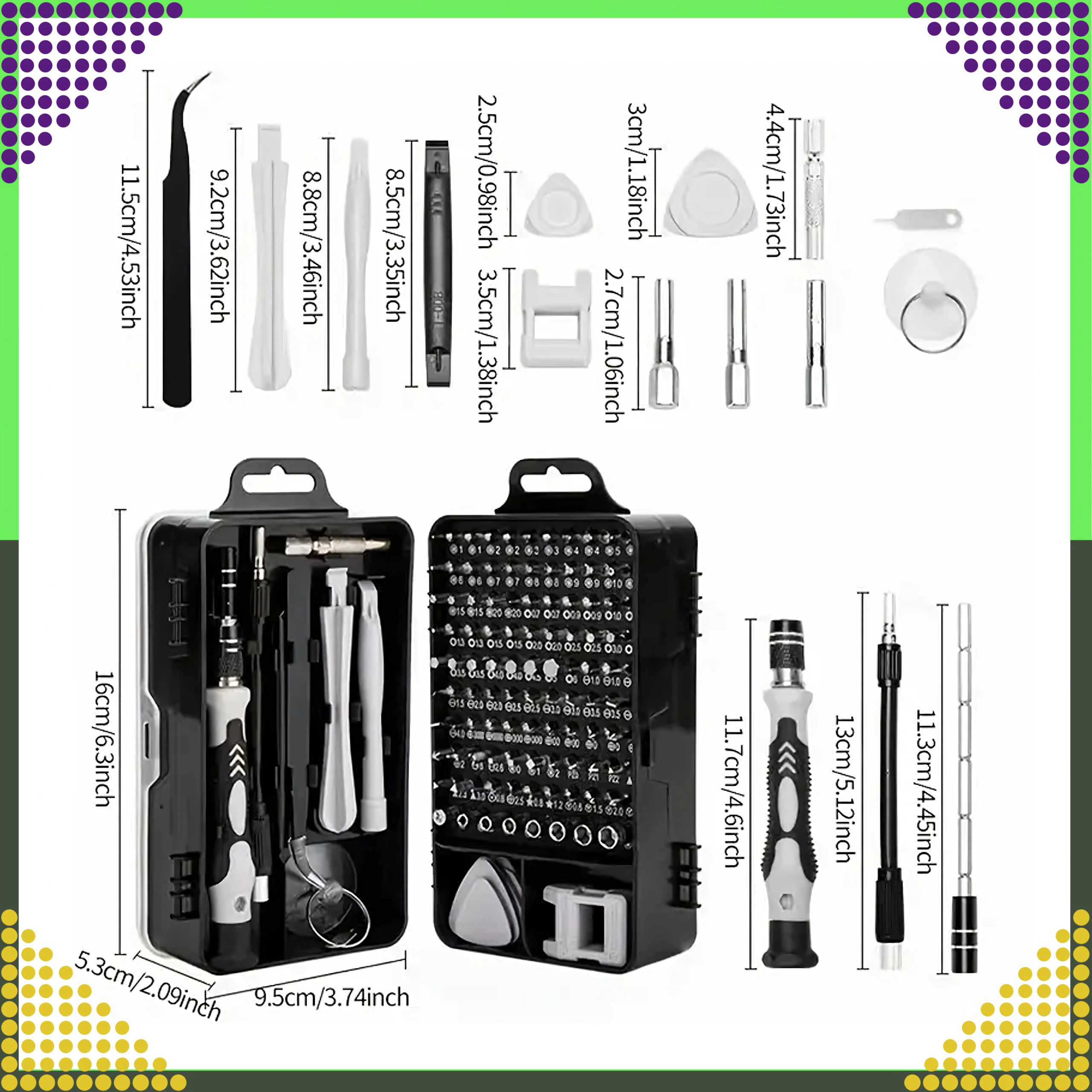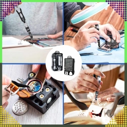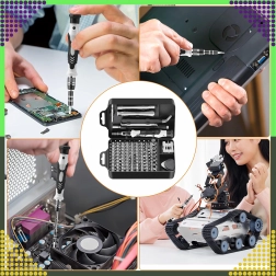Vous y trouverez 100 embouts magnétiques à tiges plus longues pour une meilleure portée, une poignée avec rallonge, une pince, une ventouse, des leviers et des outils d’ouverture triangulaires, ainsi qu’un magnétiseur/démagnétiseur. Le kit est idéal pour les réparations de téléphones, d’ordinateurs portables, de PC, de montres, de lunettes, d’appareils photo et de petits modèles.