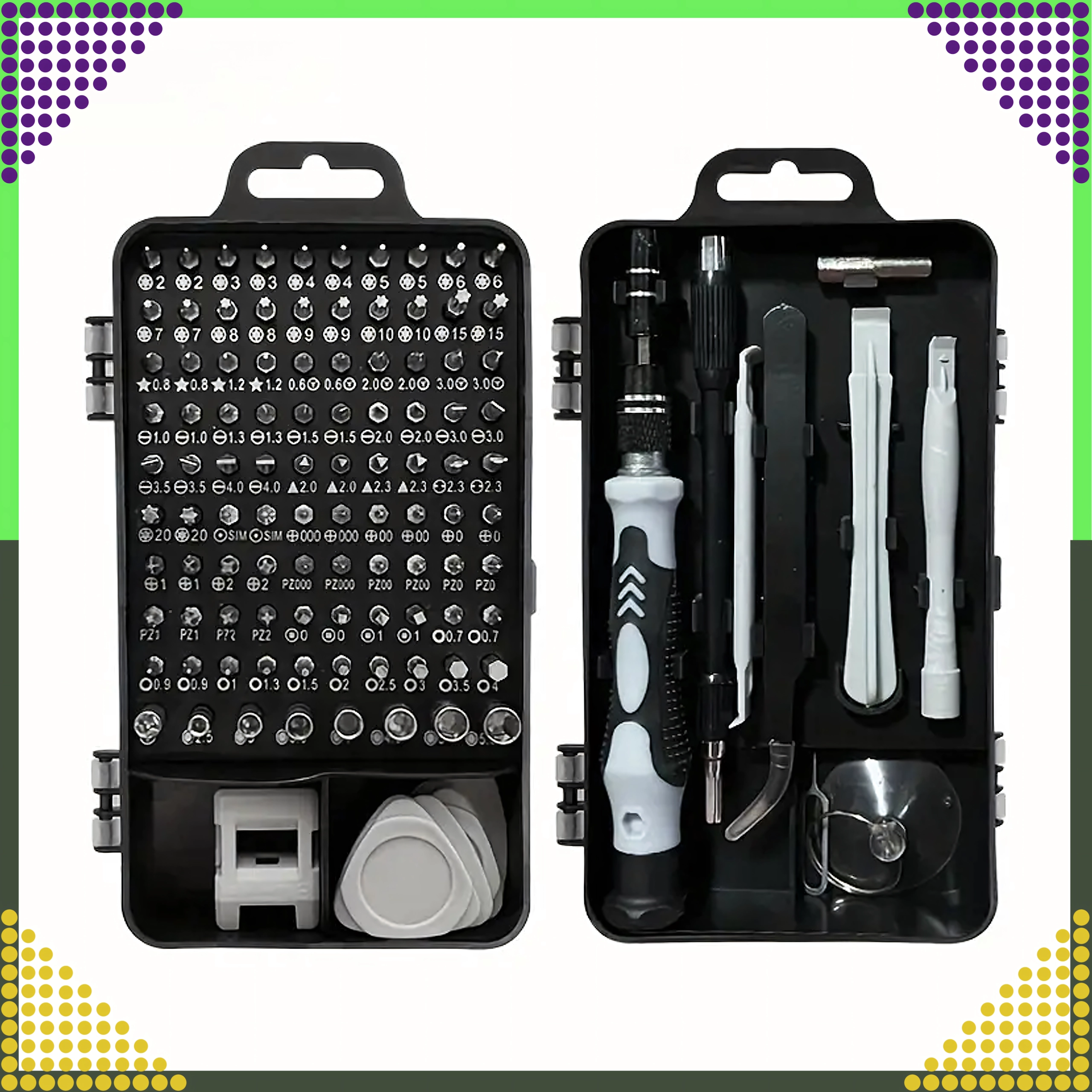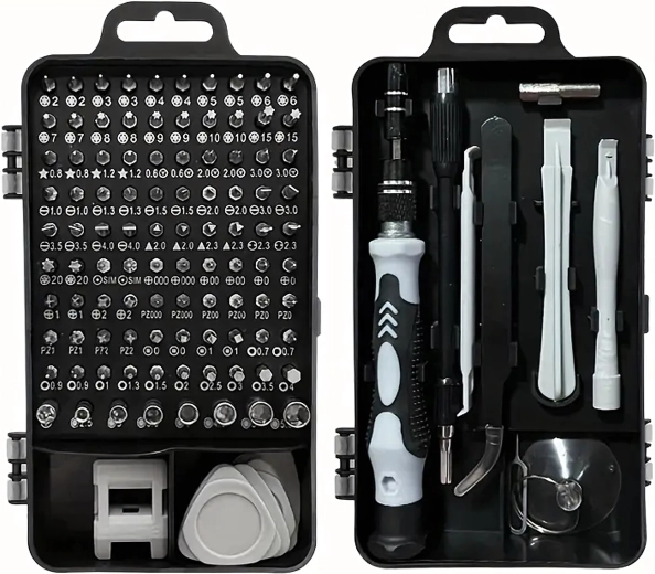 Vous cherchez un seul kit pour tout faire ? Ce set 115 en 1 combine un large choix d’embouts de précision avec des outils pratiques pour ouvrir les appareils en toute sécurité. Le tout est rangé dans un étui compact à deux volets qui assure ordre, accès rapide et transport facile.
