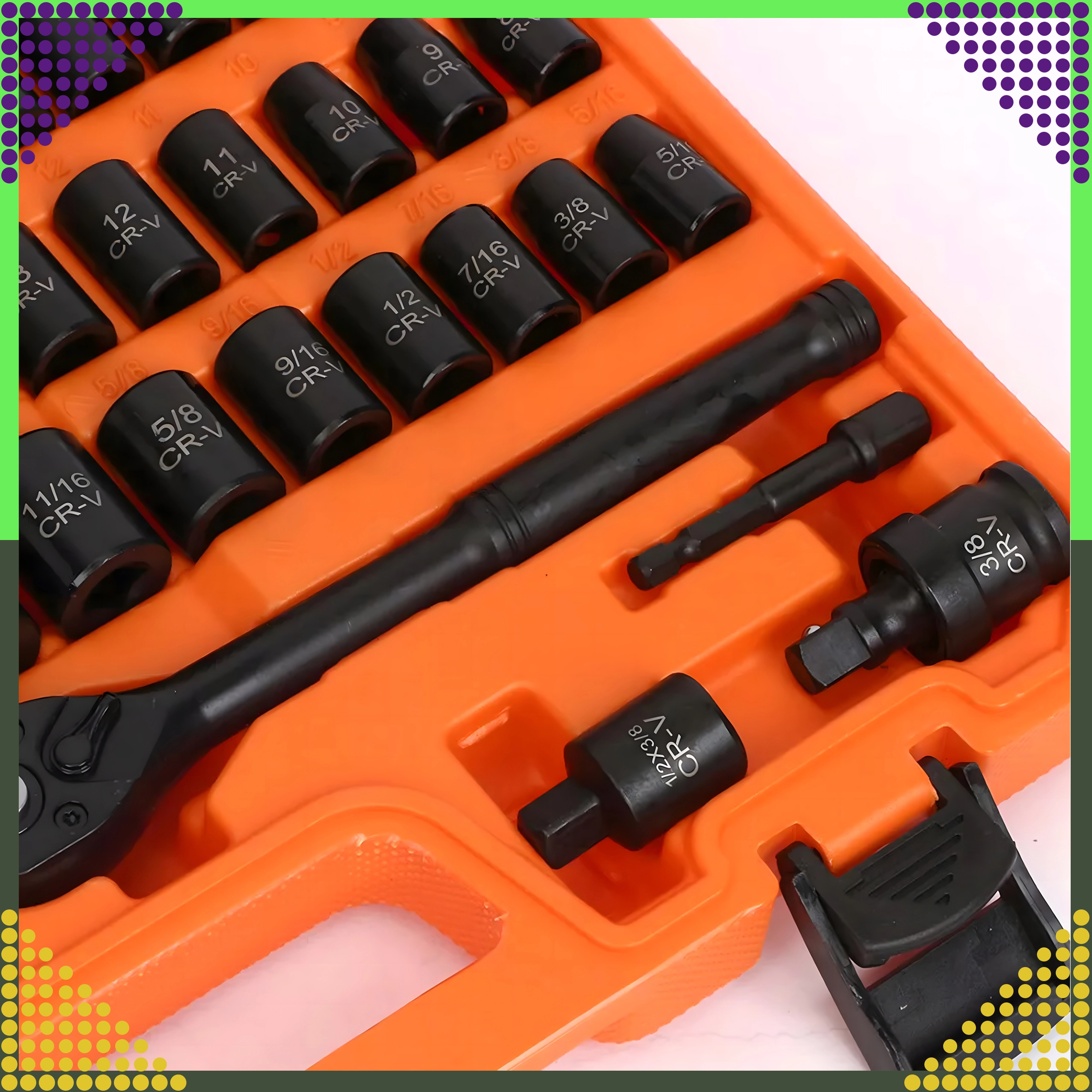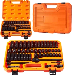 La clé à cliquet de précision avec poignée ergonomique accélère le travail, tandis que les rallonges et le cardan offrent une meilleure portée dans les espaces confinés. L’acier chrome-vanadium Cr‑V résistant garantit une longue durée de vie et une fiabilité élevée sous contraintes d’impact, tandis que la mallette robuste garde tout bien organisé et prêt à être transporté.